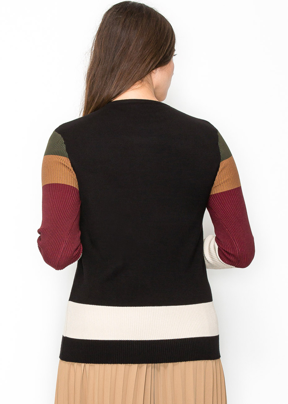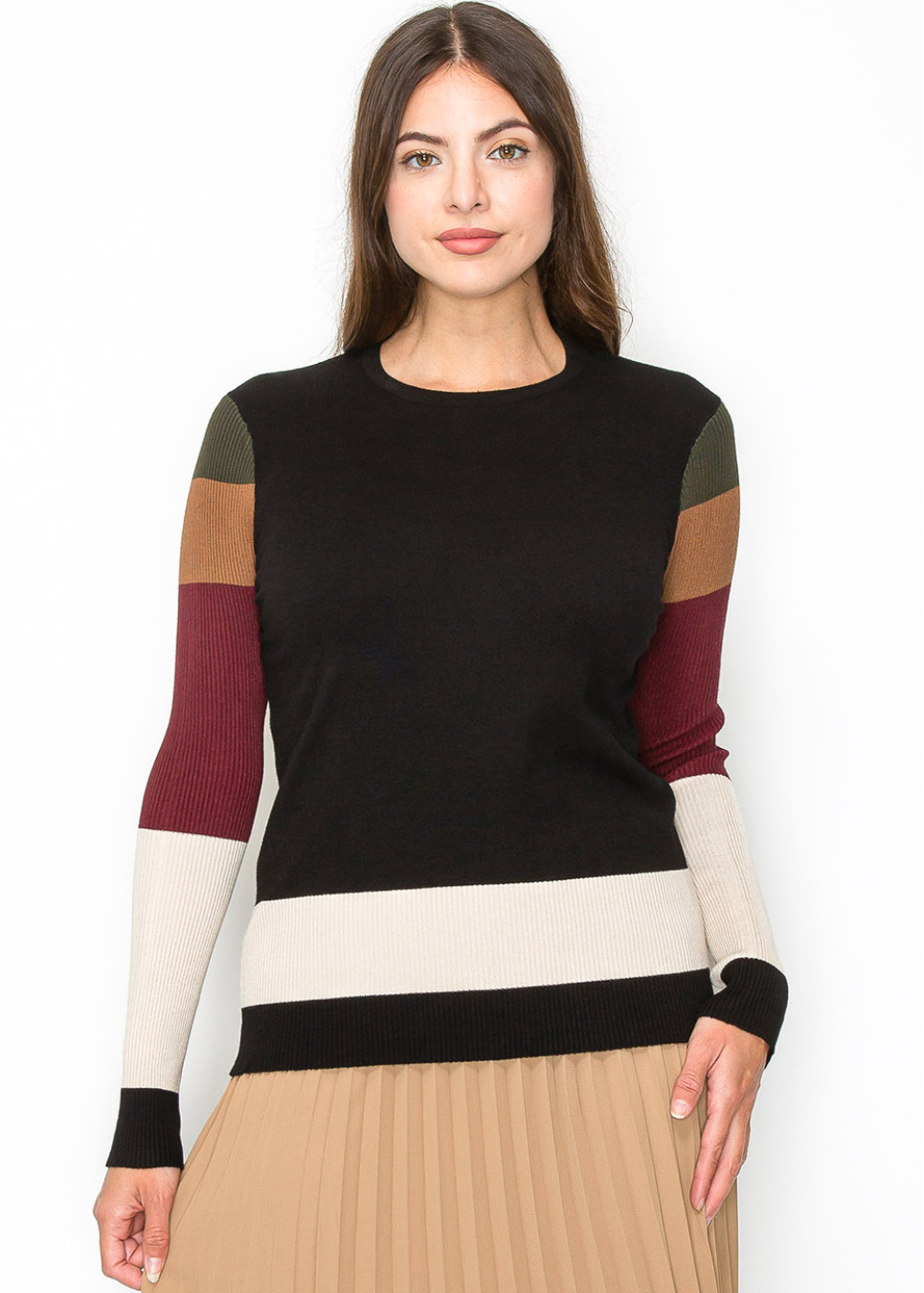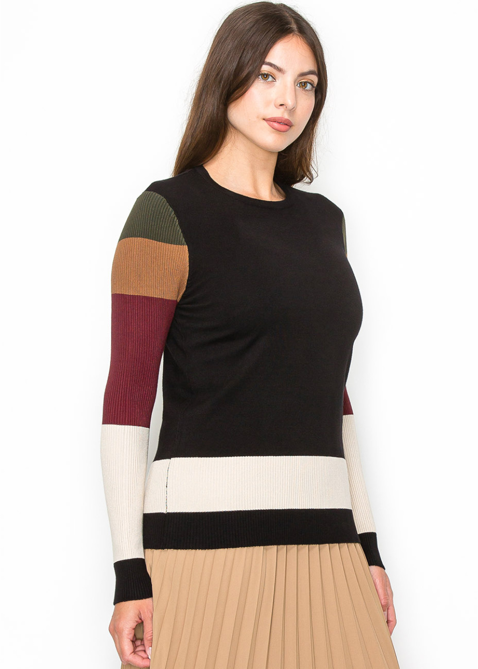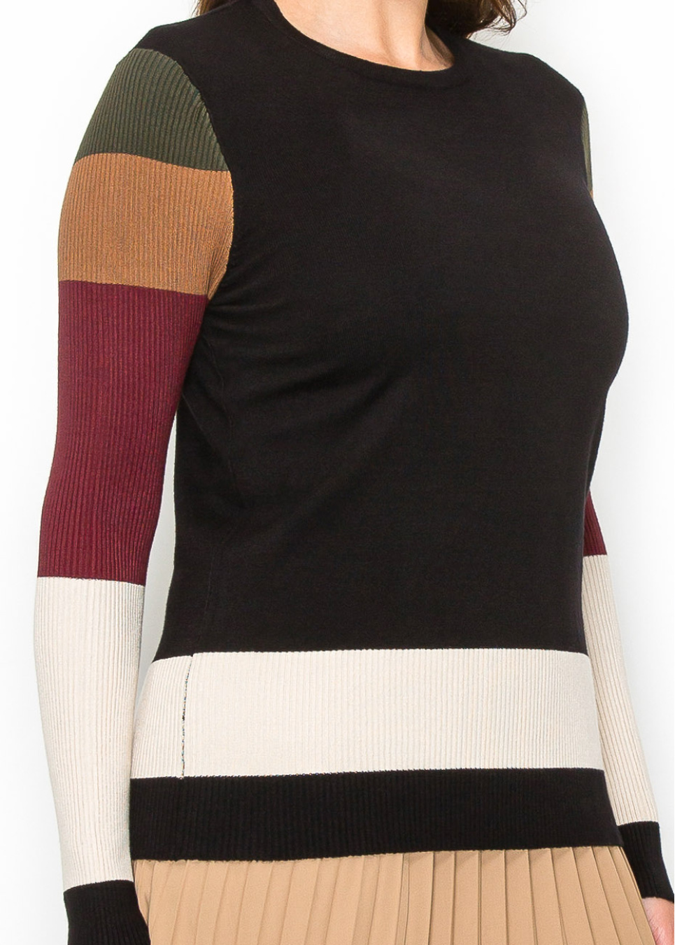 Bring a pop of color to your outfit with this crewneck sweater. The body is classic black, but the sleeves steal the show with their vibrant stripes in earthy hues. The mix of colors is subtle yet stylish, making it a great choice for a cozy yet chic look.