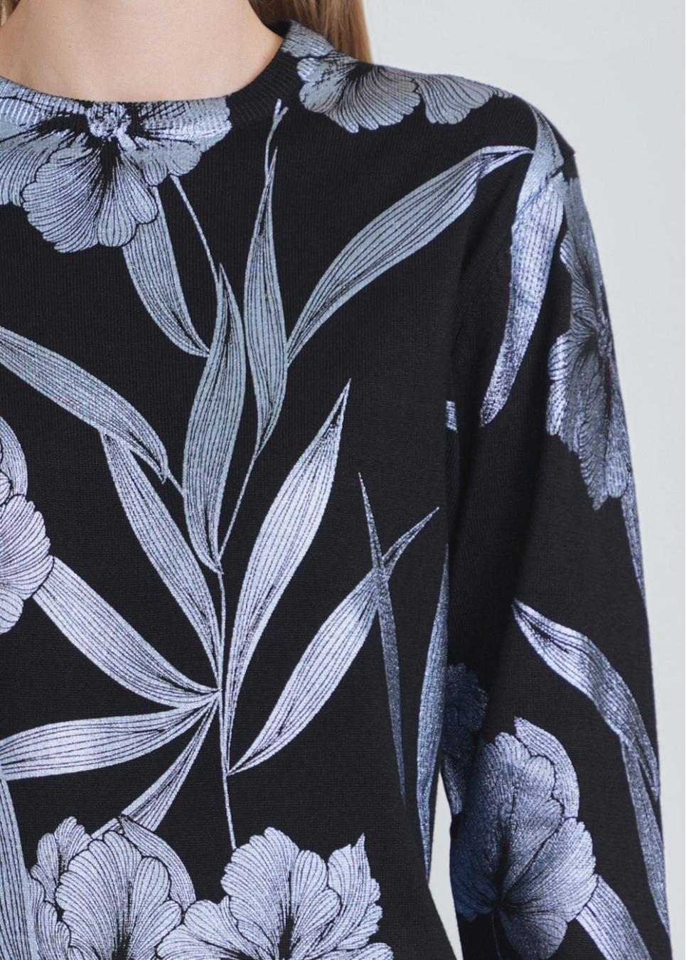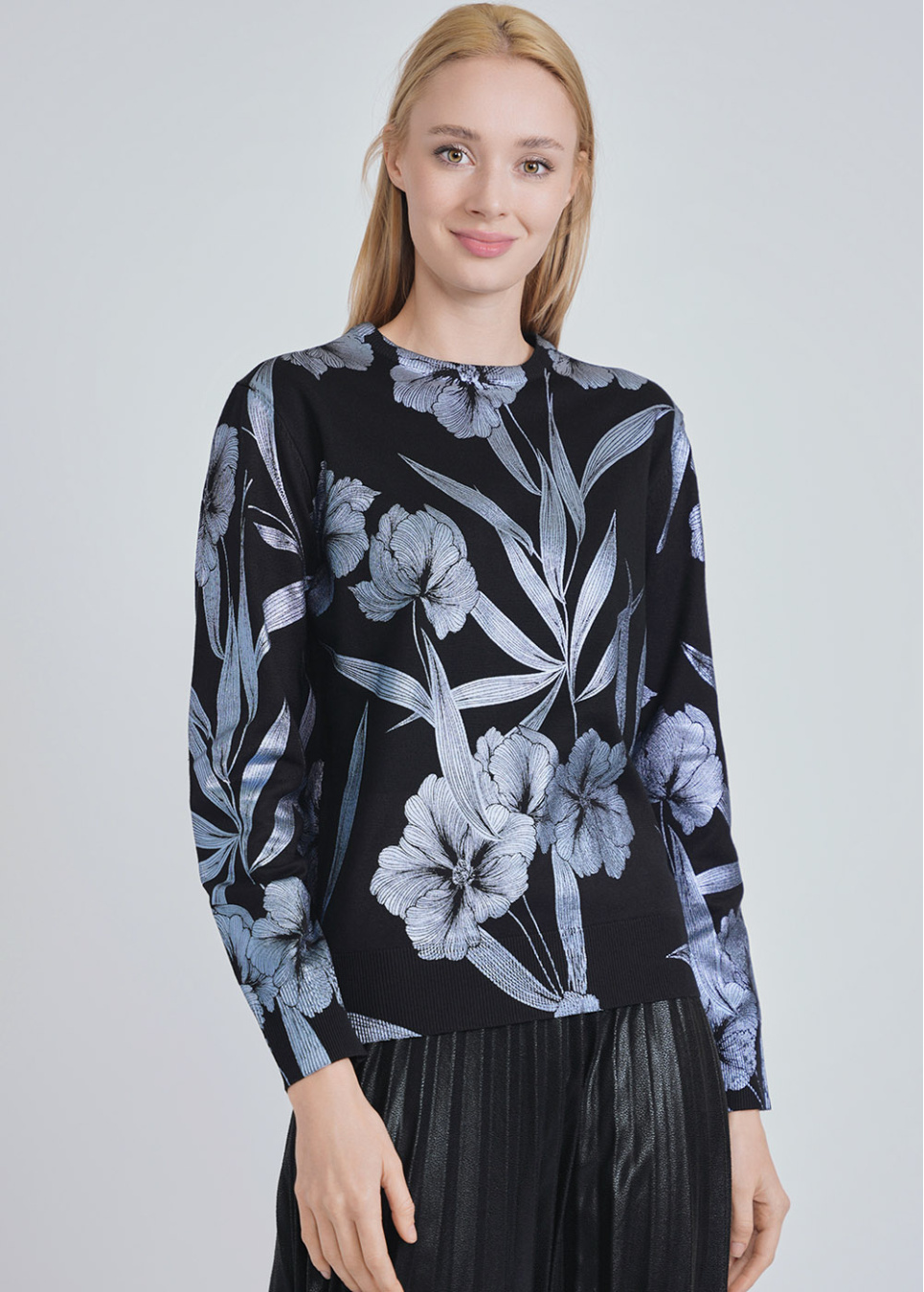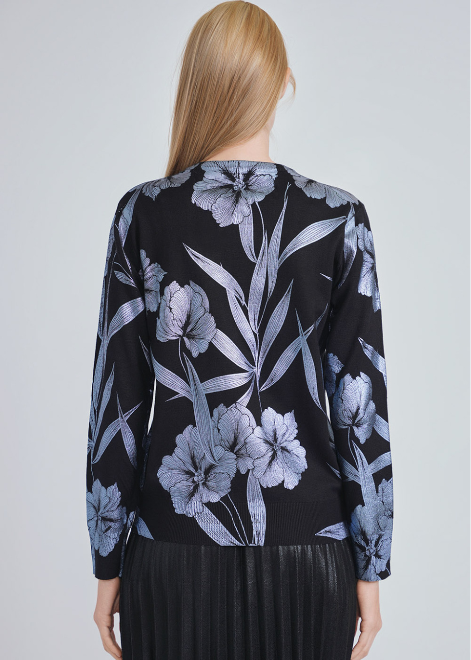 Nature's Whisper: Black Knit with Blue Floral & Foliage Patterns
