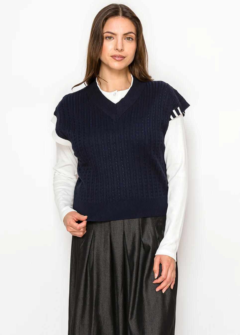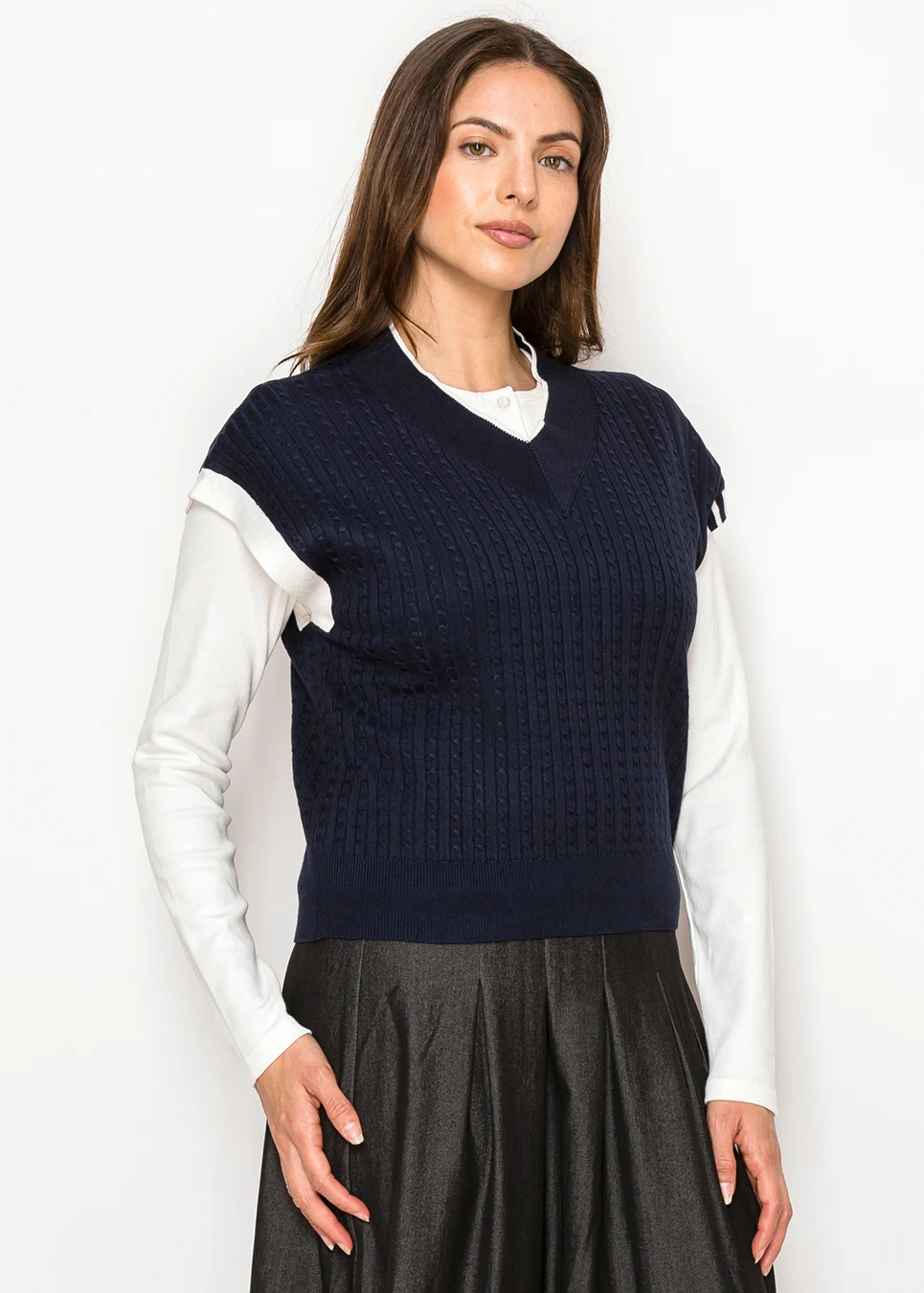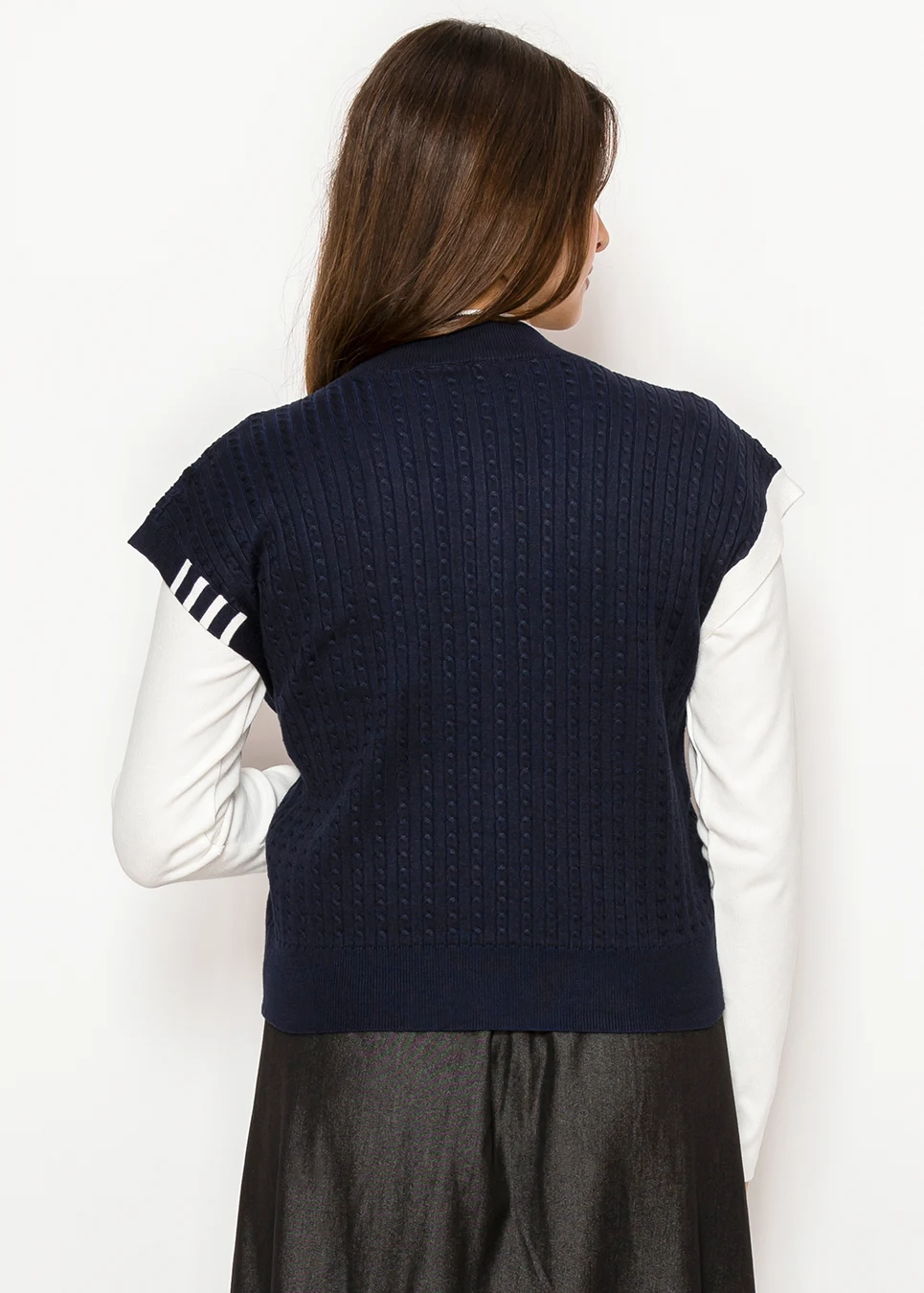 The vertical cable pattern subtly elongates the silhouette, while the V-neck keeps the neckline open and balanced. A thoughtful layering piece that feels both classic and current.