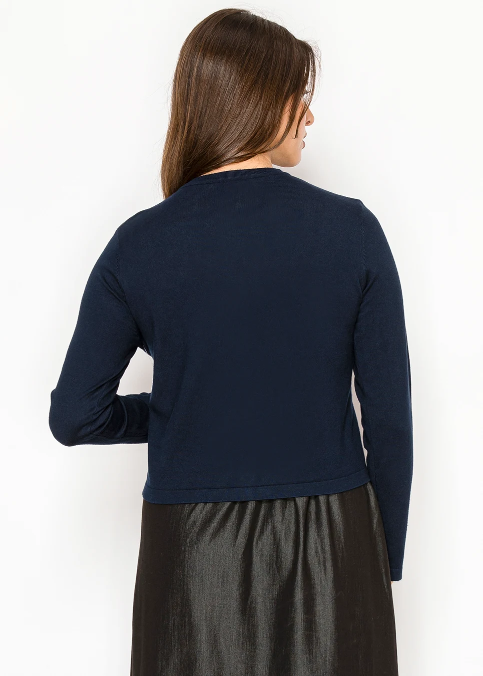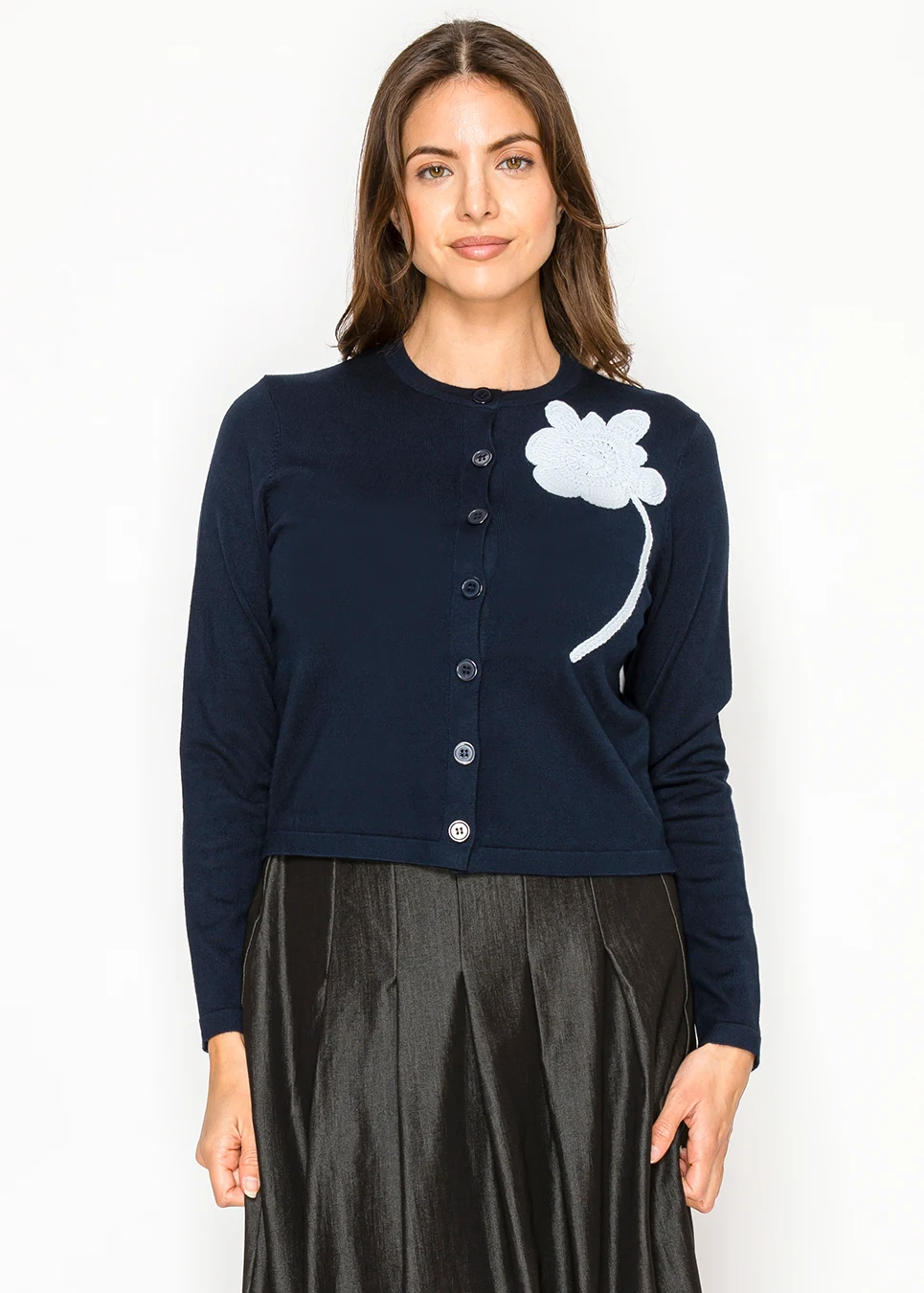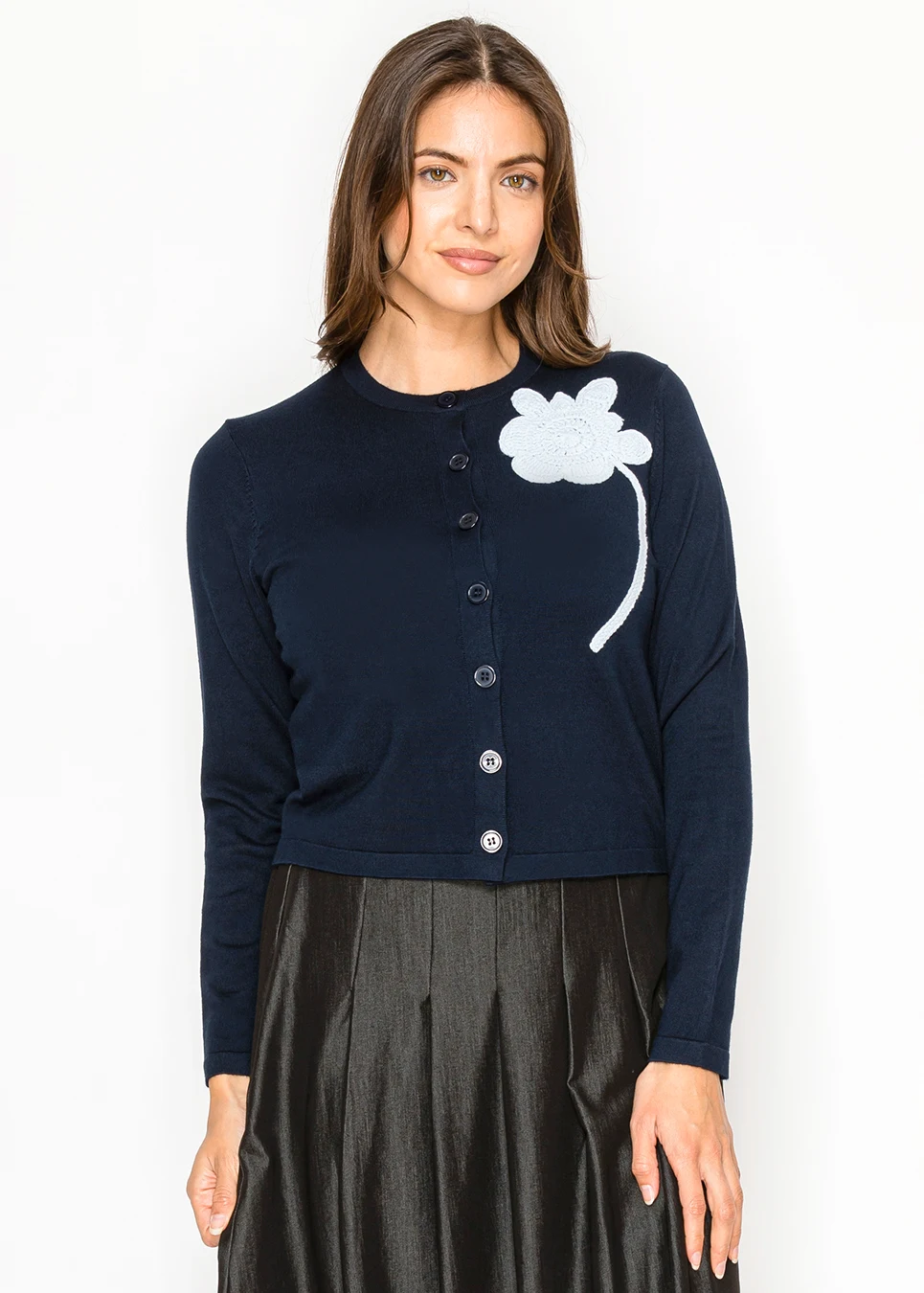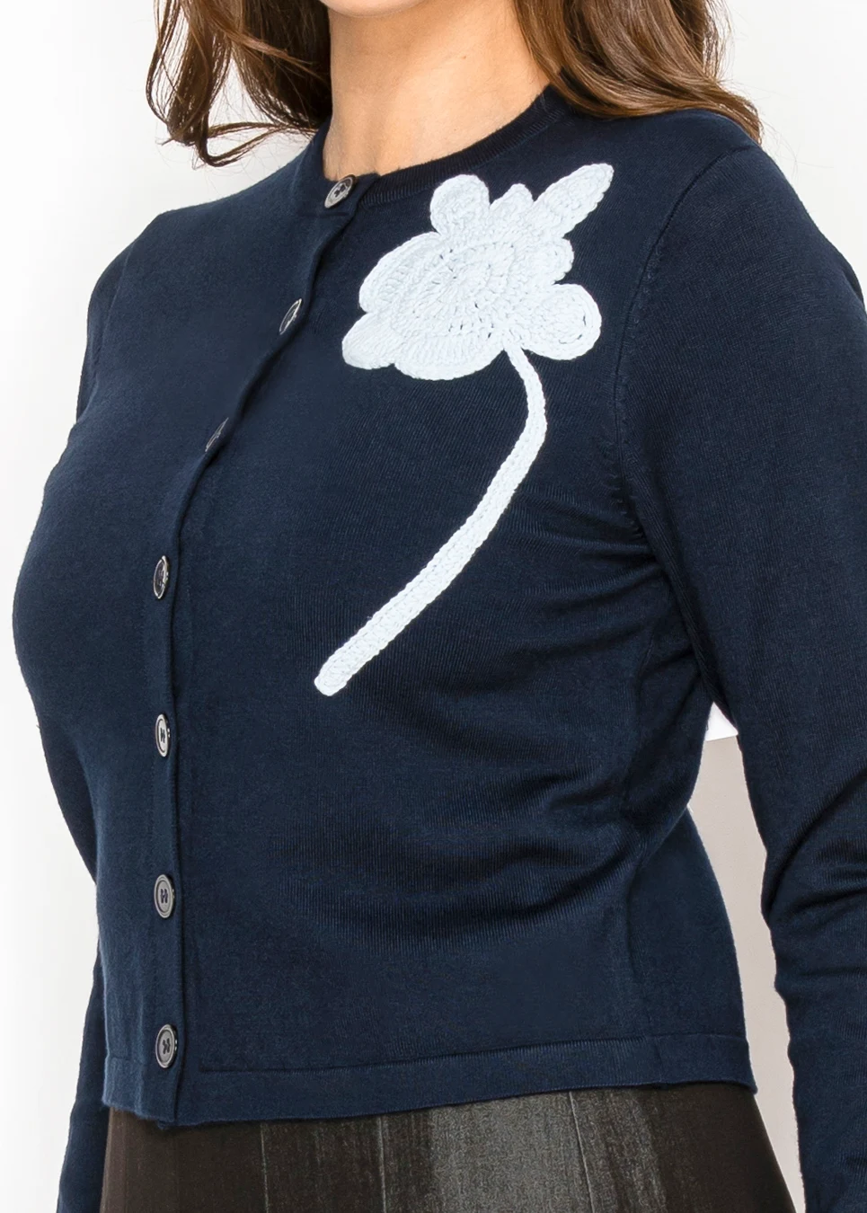 Elegant and composed, this navy knit cardigan is elevated by a sculptural floral detail. It’s the kind of piece that makes a subtle statement while remaining timeless in your wardrobe.