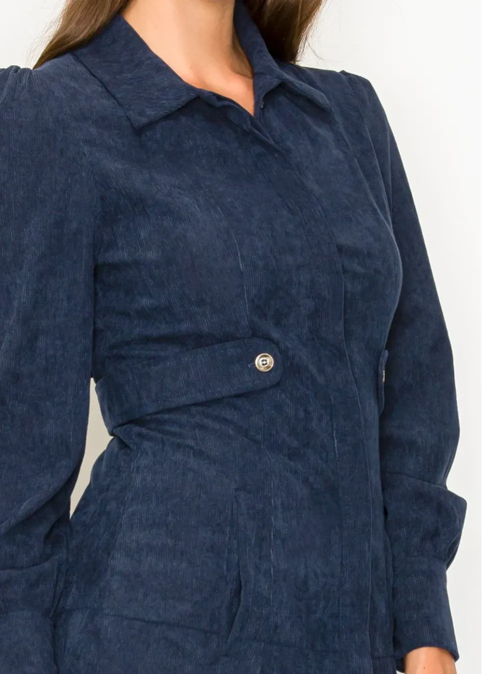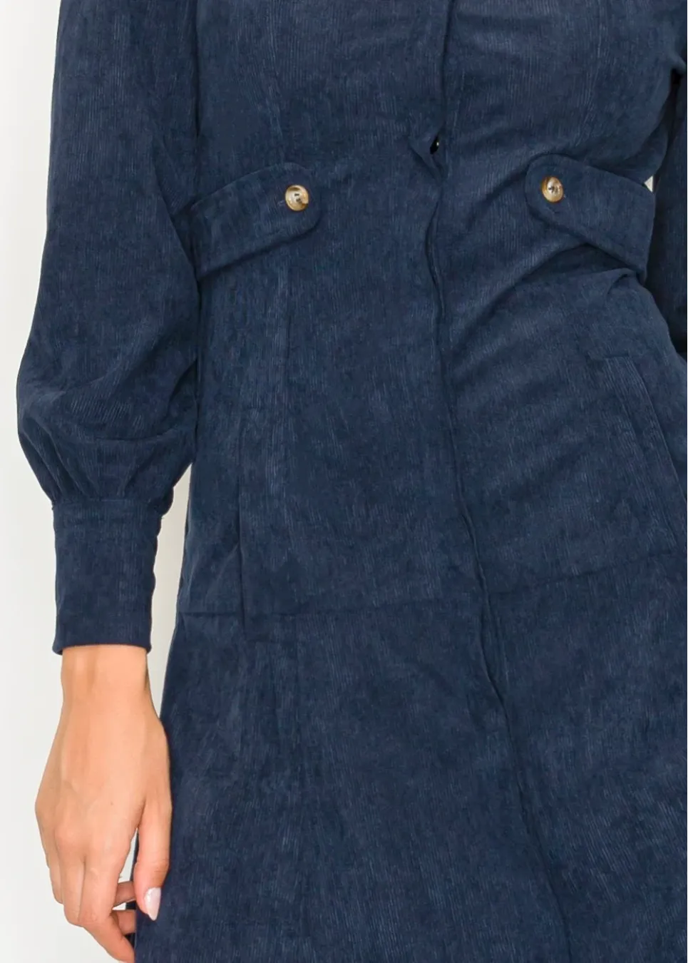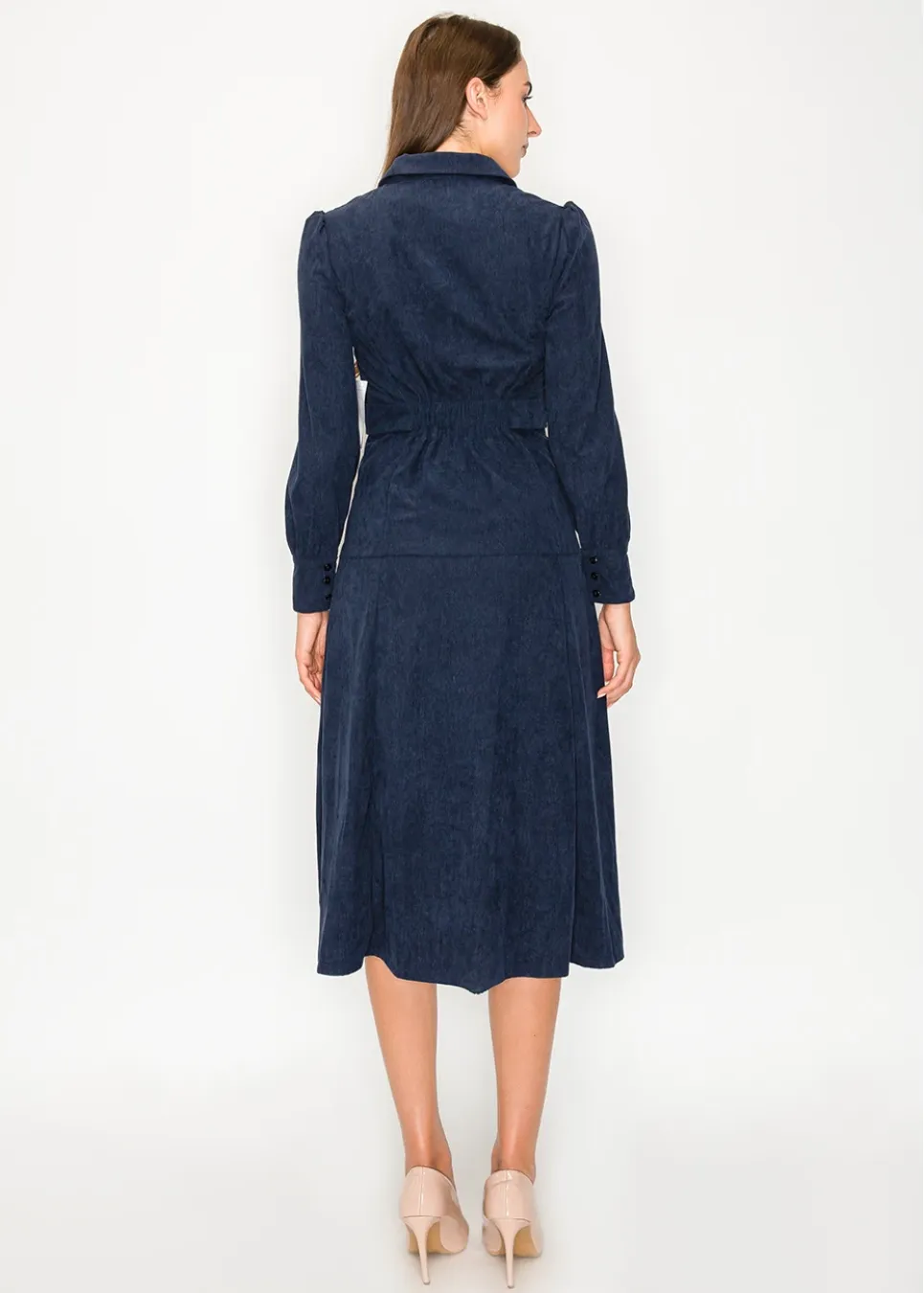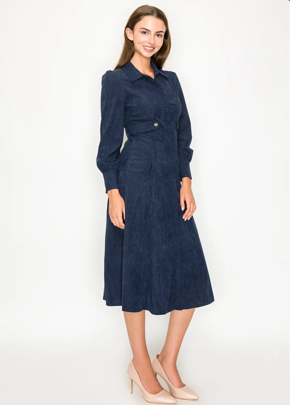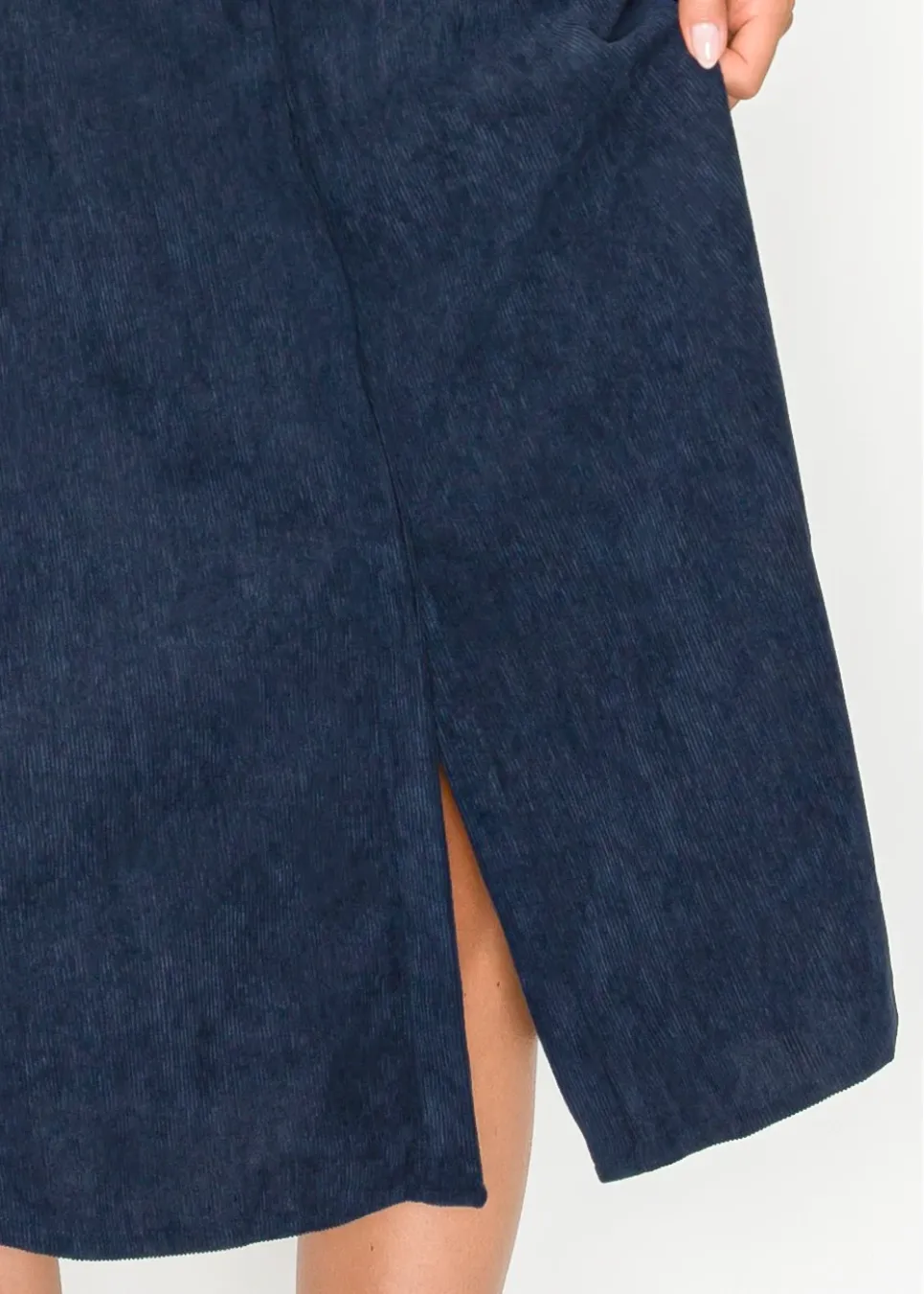 It’s the kind of dress you can throw on and instantly feel pulled together. The corduroy texture keeps it cozy, while the slit adds just the right touch of ease.