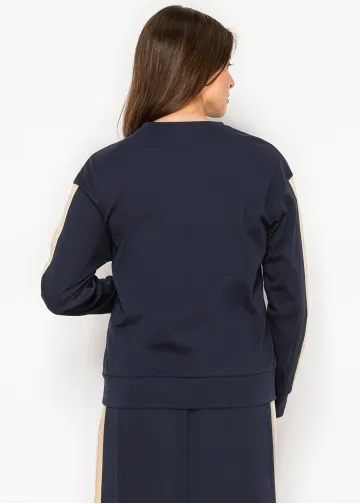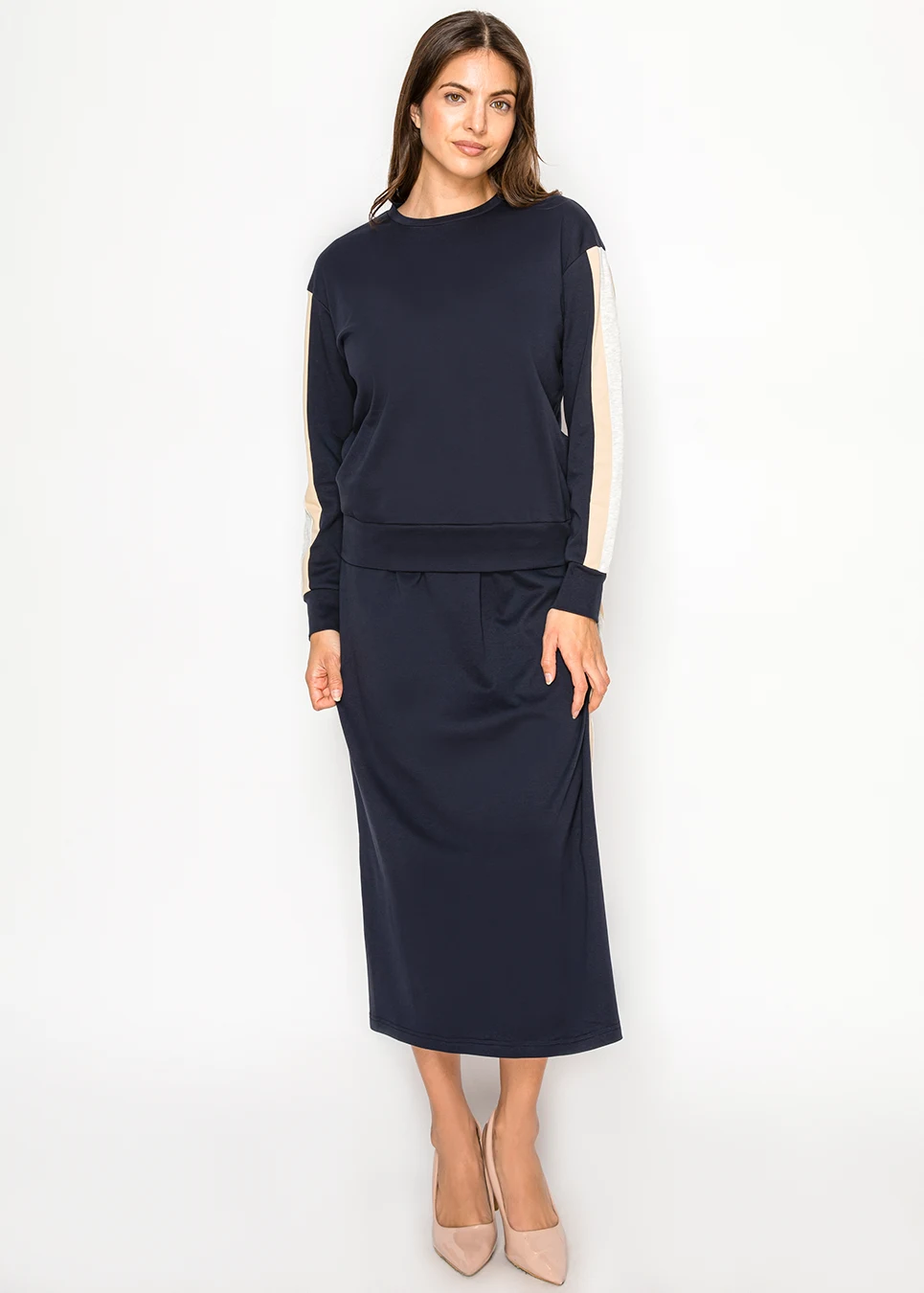 This is the sweatshirt for when you want to look like you made an effort without actually making one. The stripe panel on the sleeves — beige with a grey edge — does all the visual work. The rest is navy, relaxed, and very comfortable. Wear it with the matching skirt or with your own navy pieces and it comes together instantly.