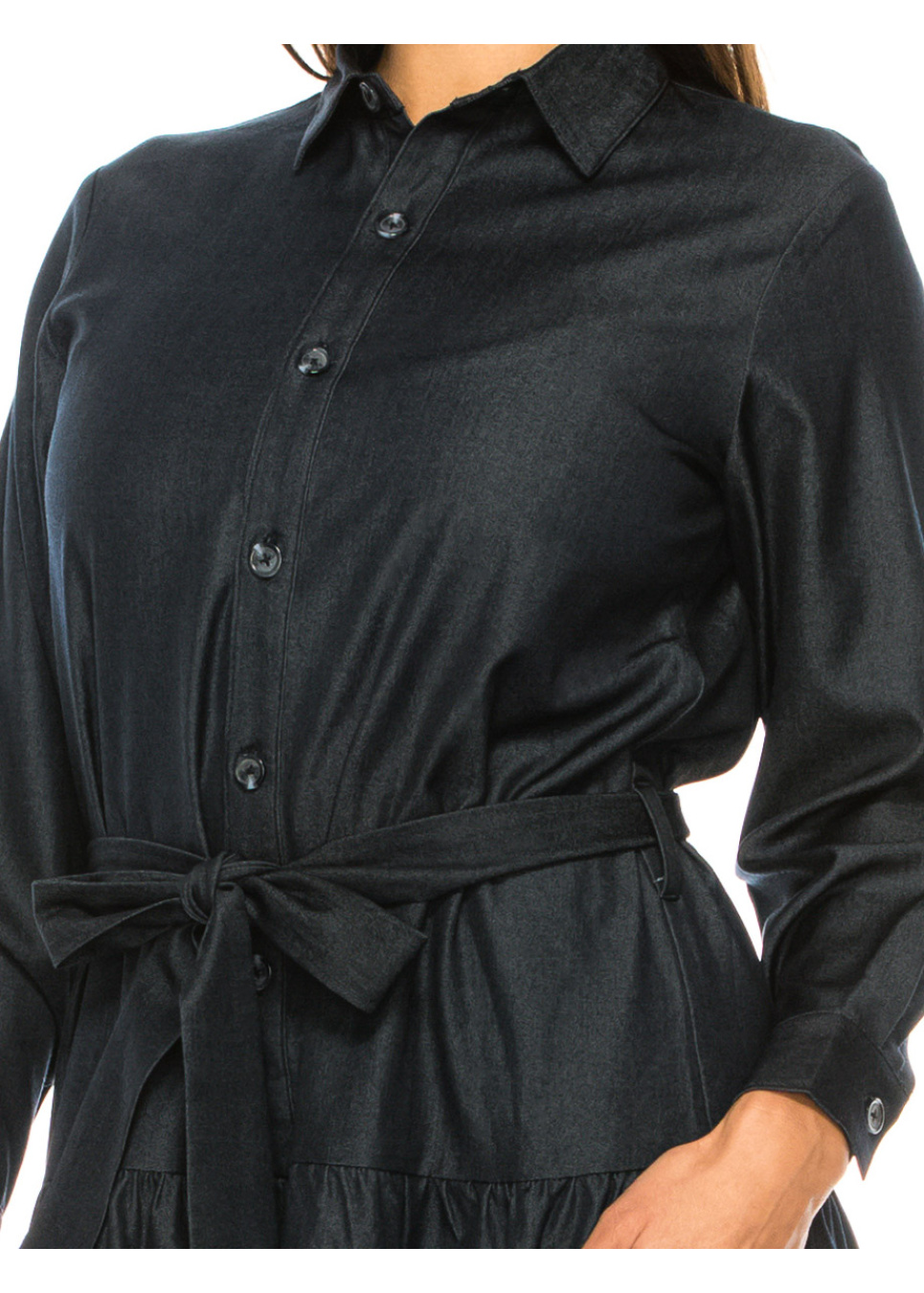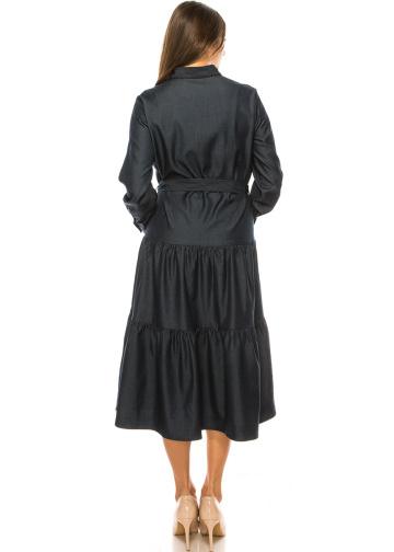 Dress to impress in this stunning navy denim dress from YAL New York. The classic shirt collar and button-down design are paired with a modern tiered skirt and waist belt, creating a unique and eye-catching look. Wear it to any event, from a formal affair to a night out with friends.