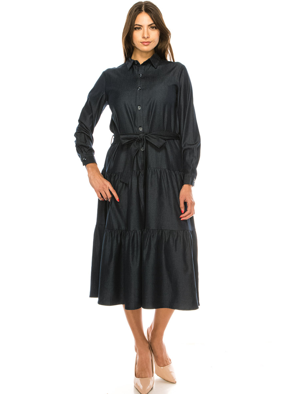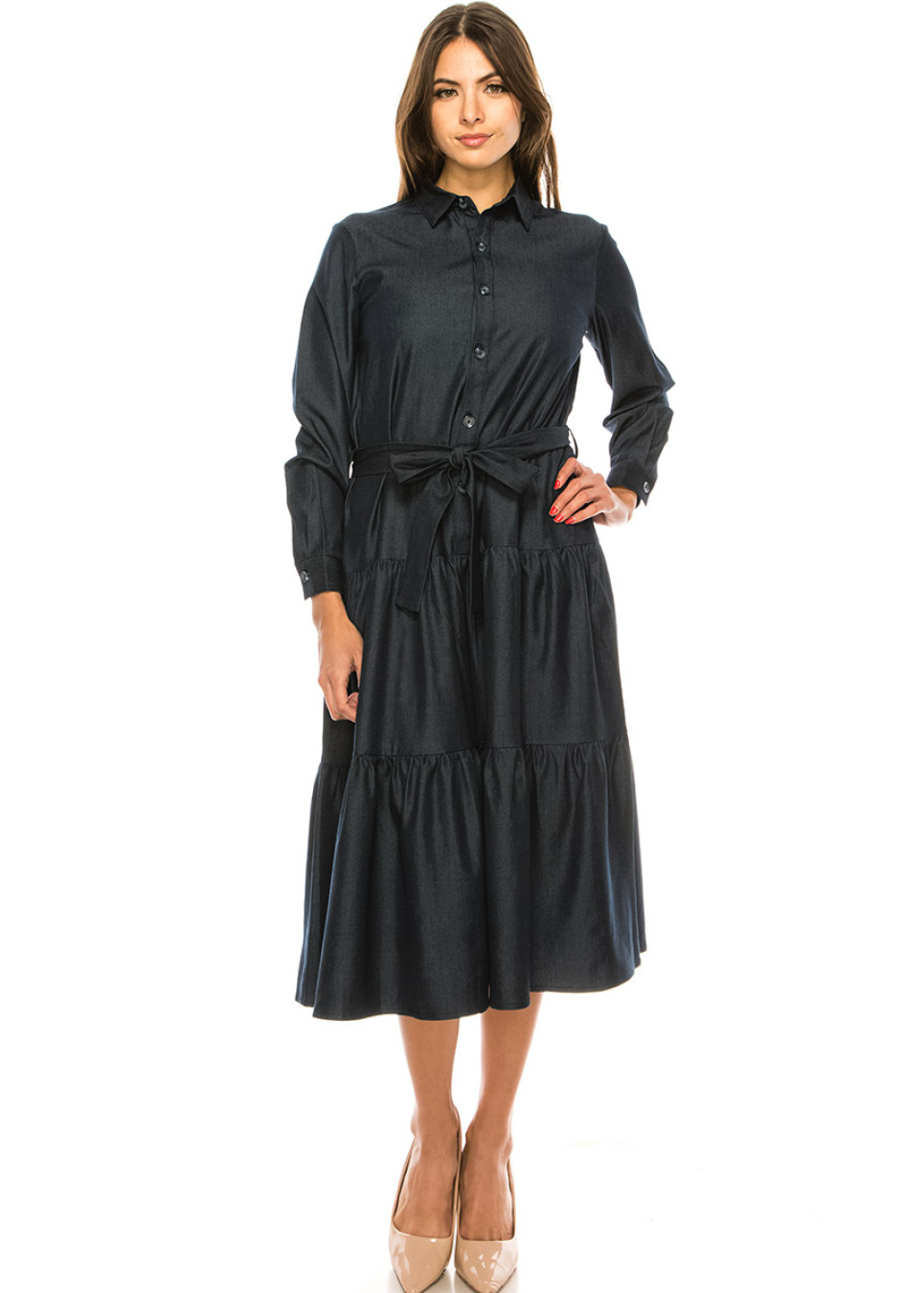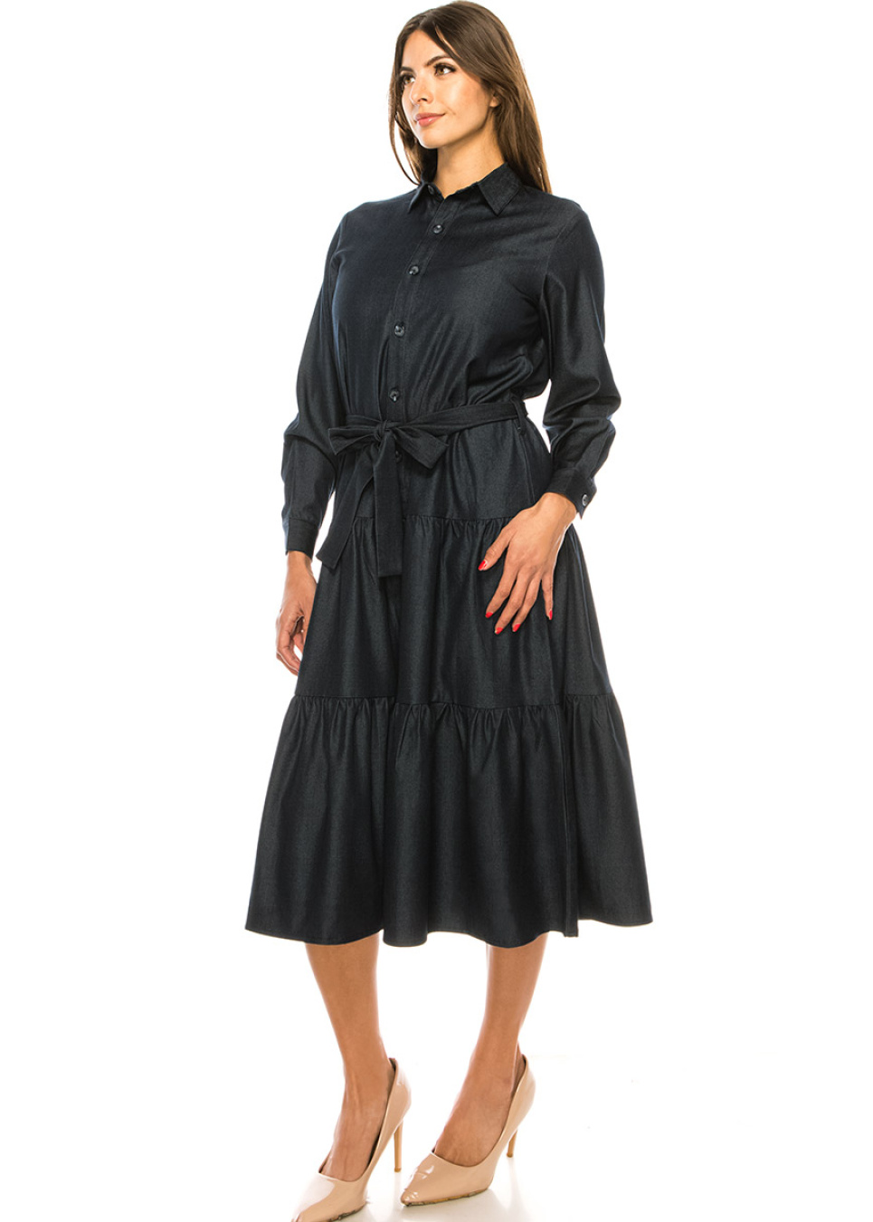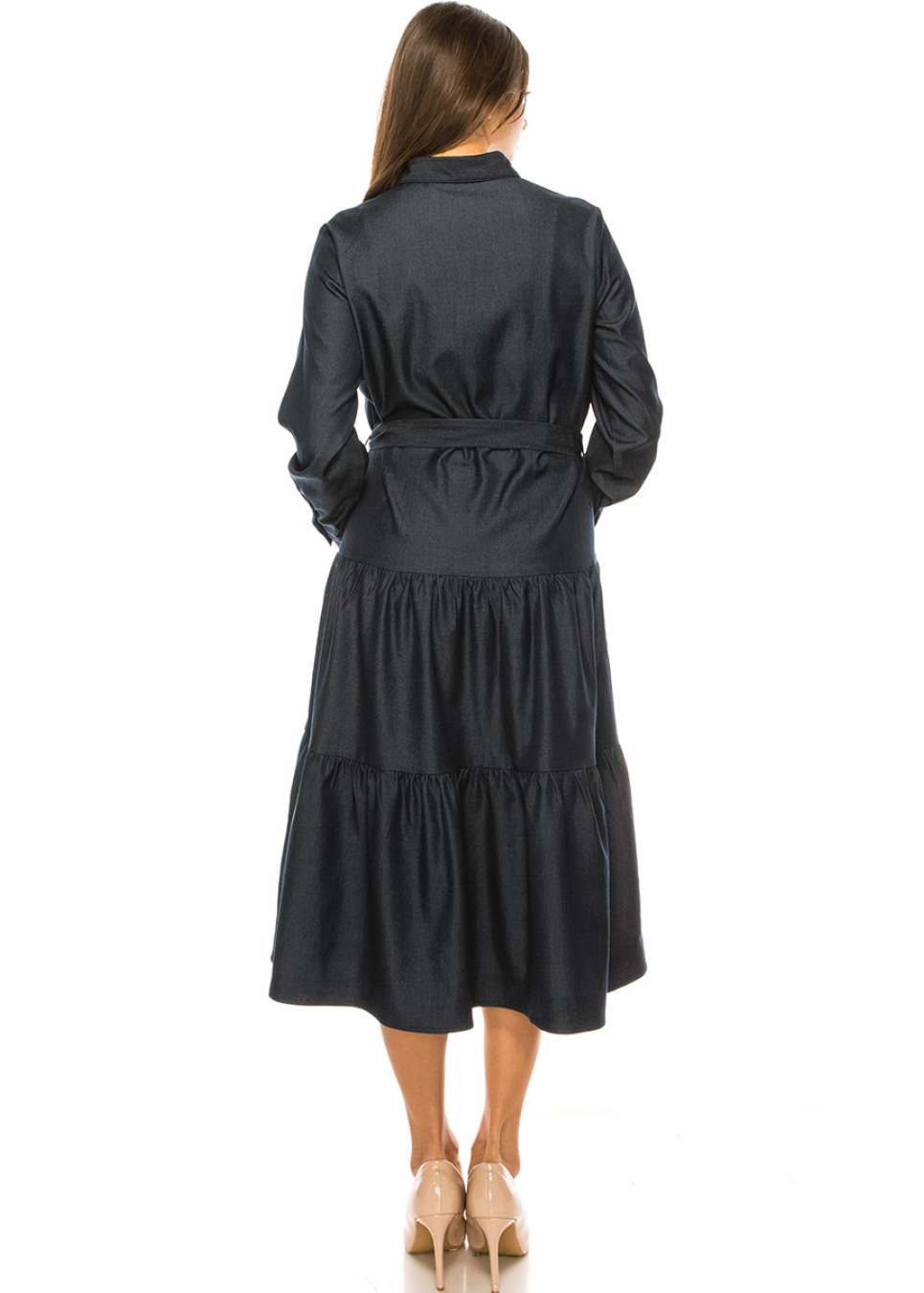 Navy Denim Tiered Hem Midi Dress