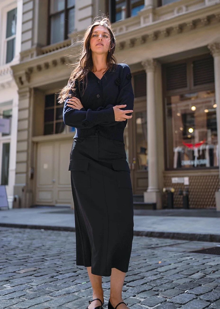 Navy Knit with 3D Flowers & Black Midi Outfit