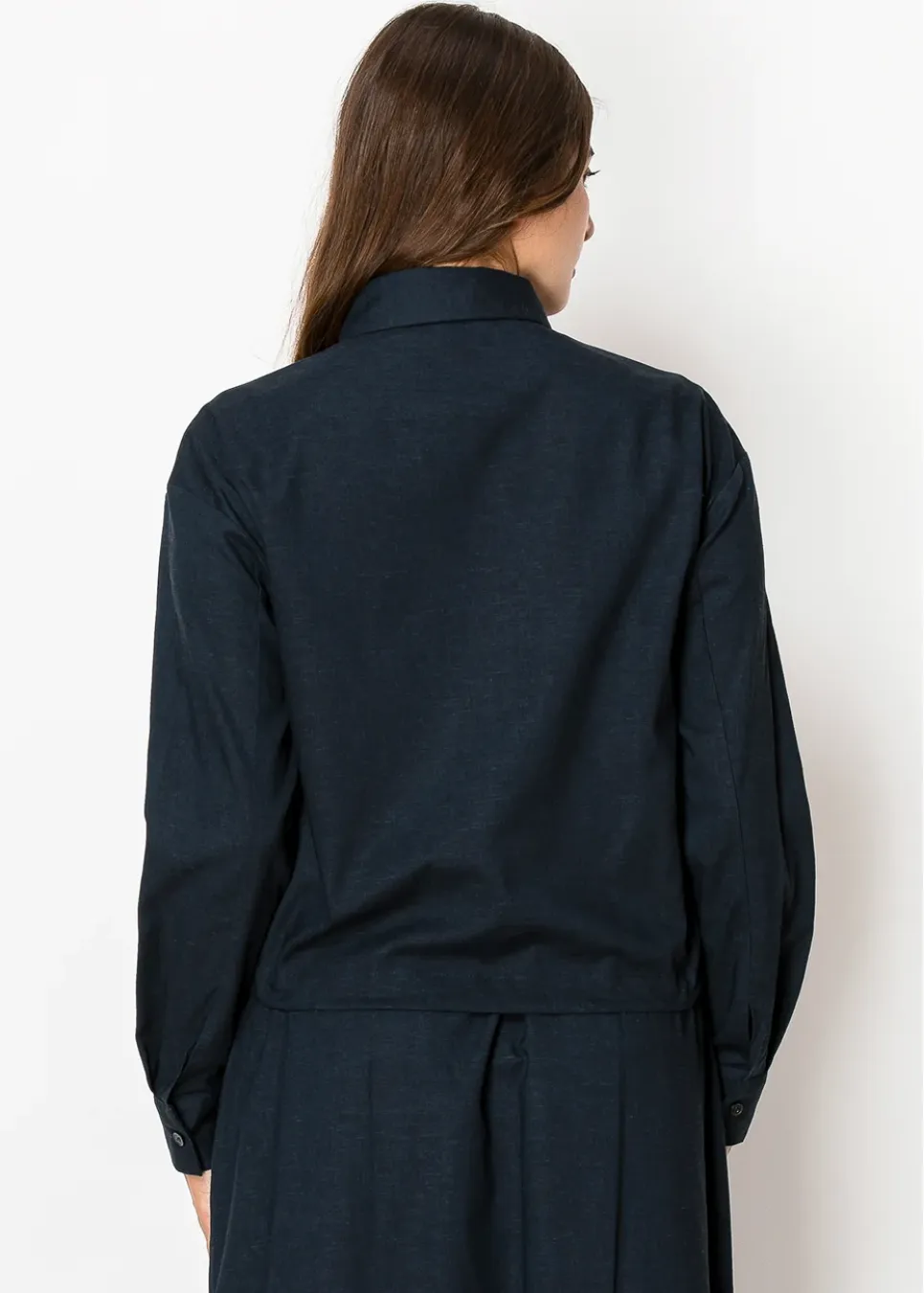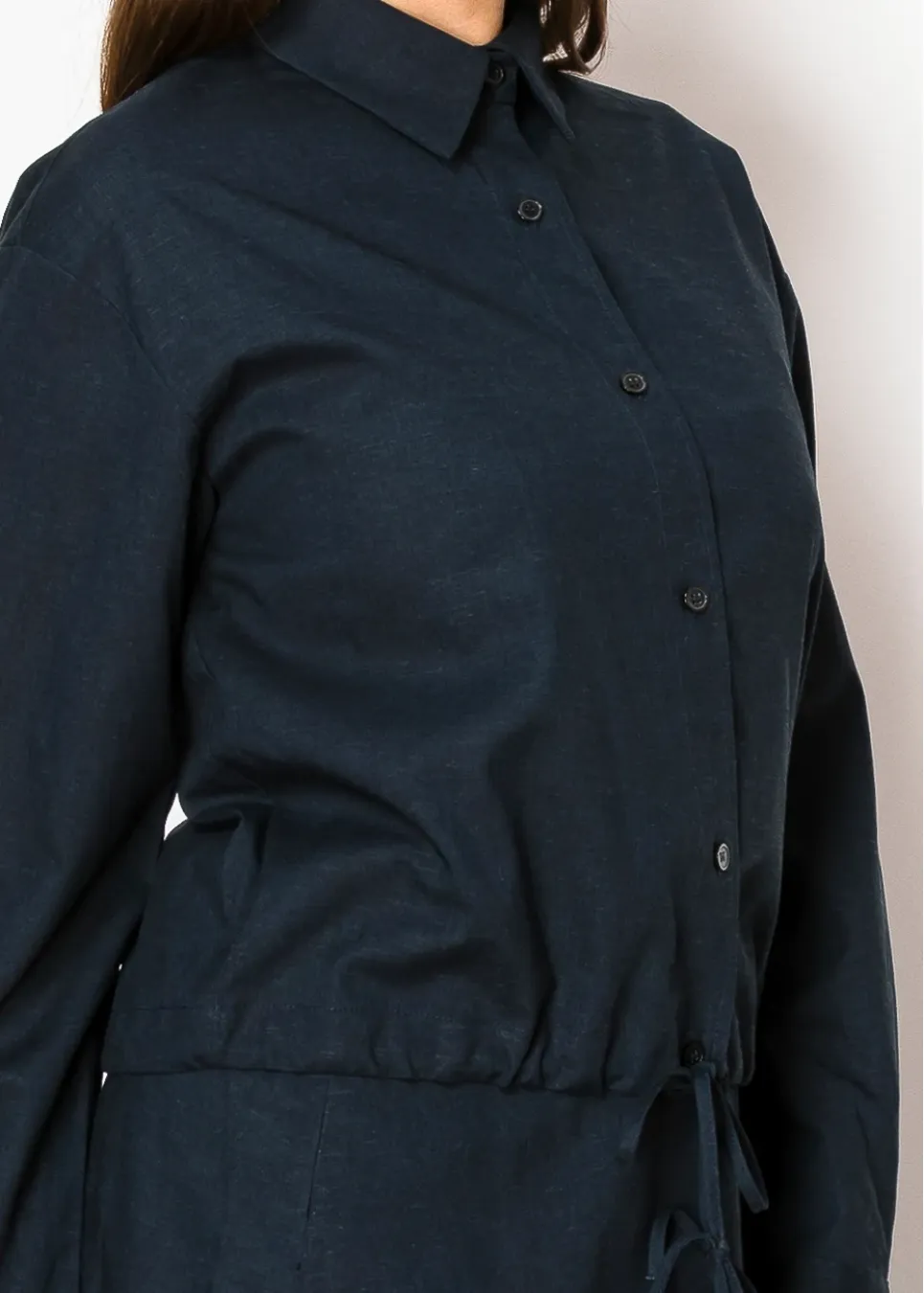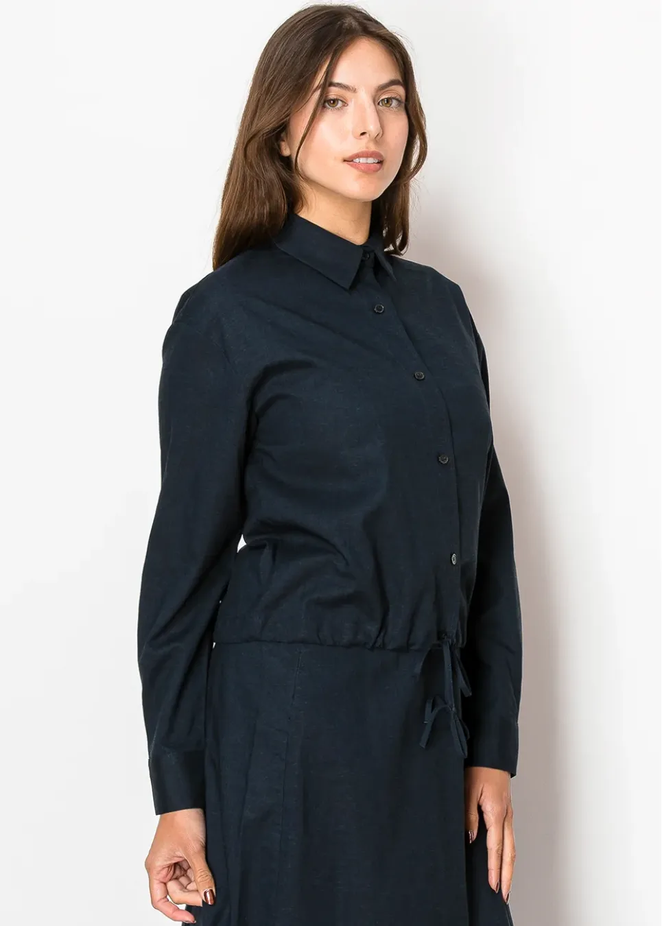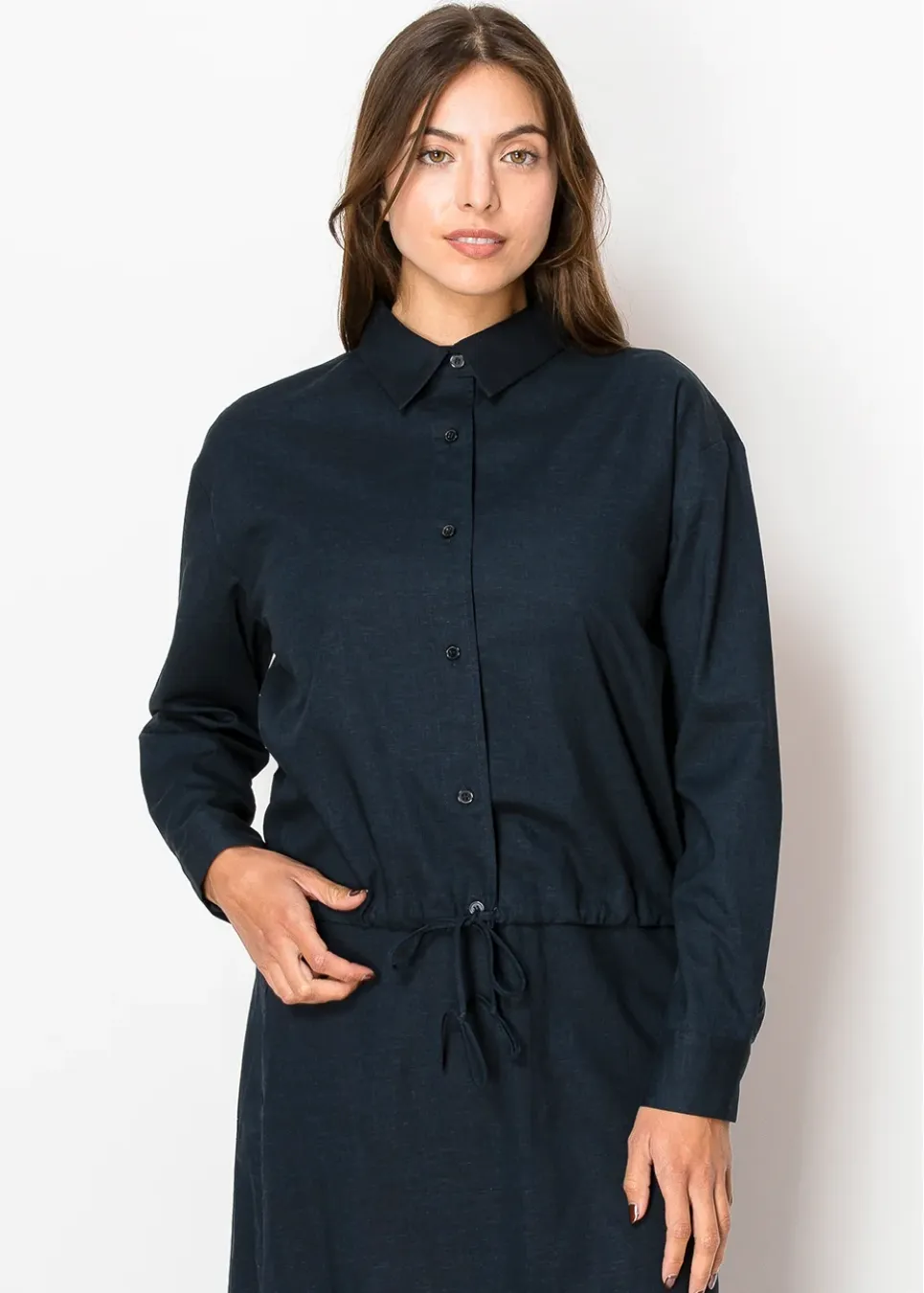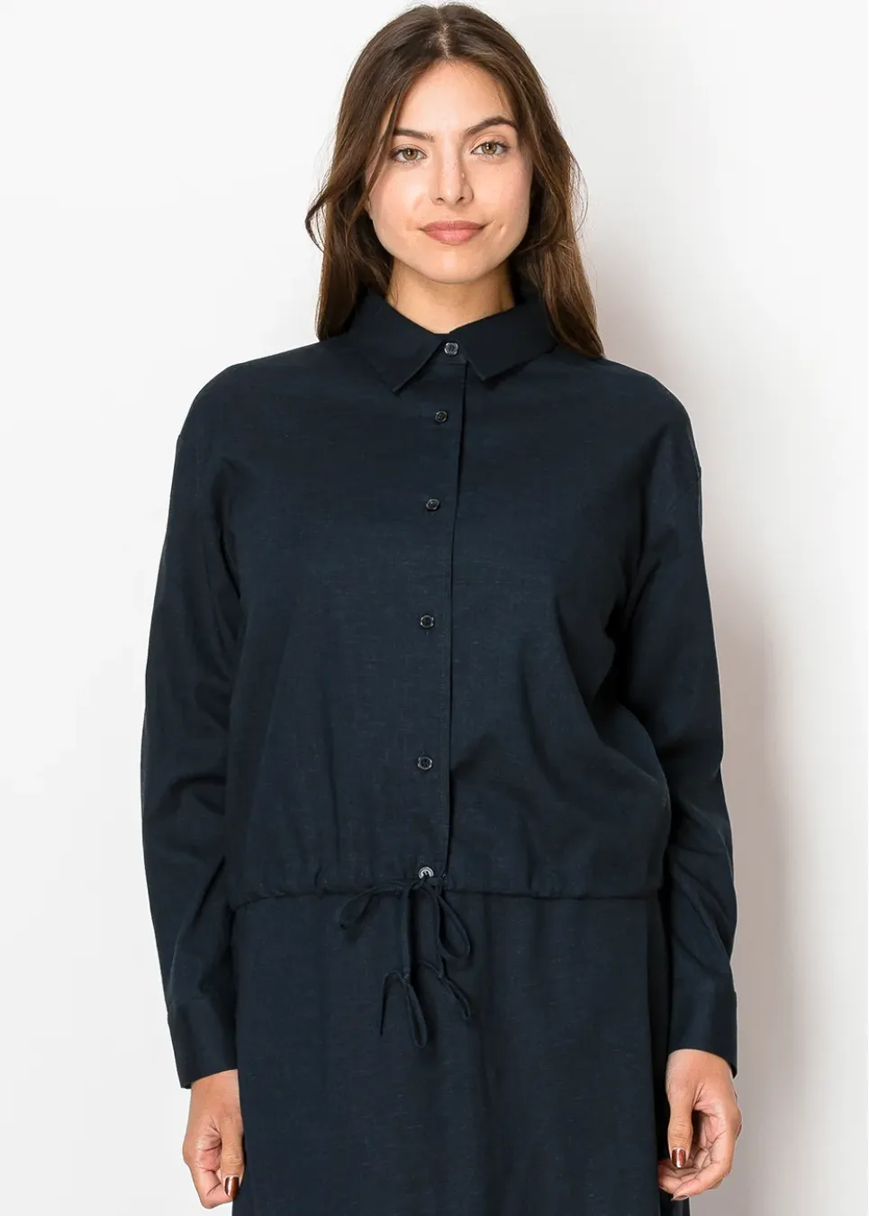 This navy blouse combines a classic button-up style with a modern drawstring waist. Made from lightweight linen, it’s perfect for days when you want to stay cool and look polished.