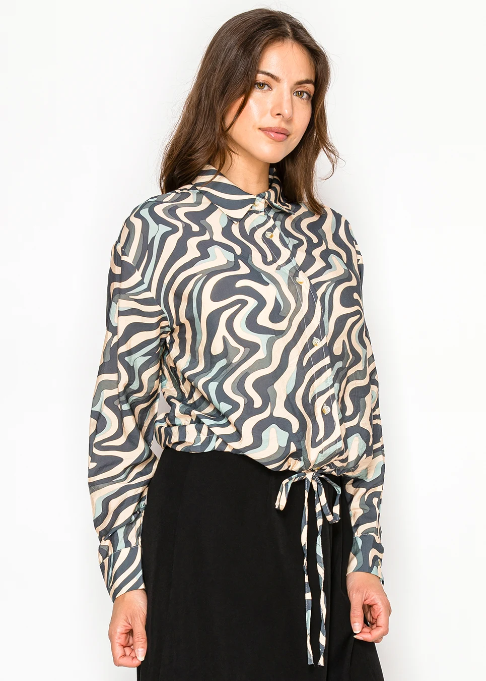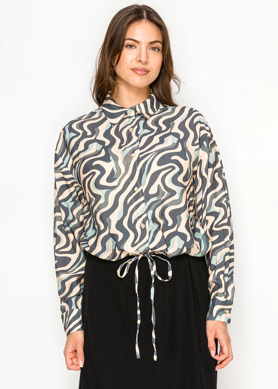 The print almost looks like brushstrokes moving across the fabric. Once the waist tie is adjusted, the blouse gathers softly and creates a relaxed shape that works easily with skirts or tailored pieces.