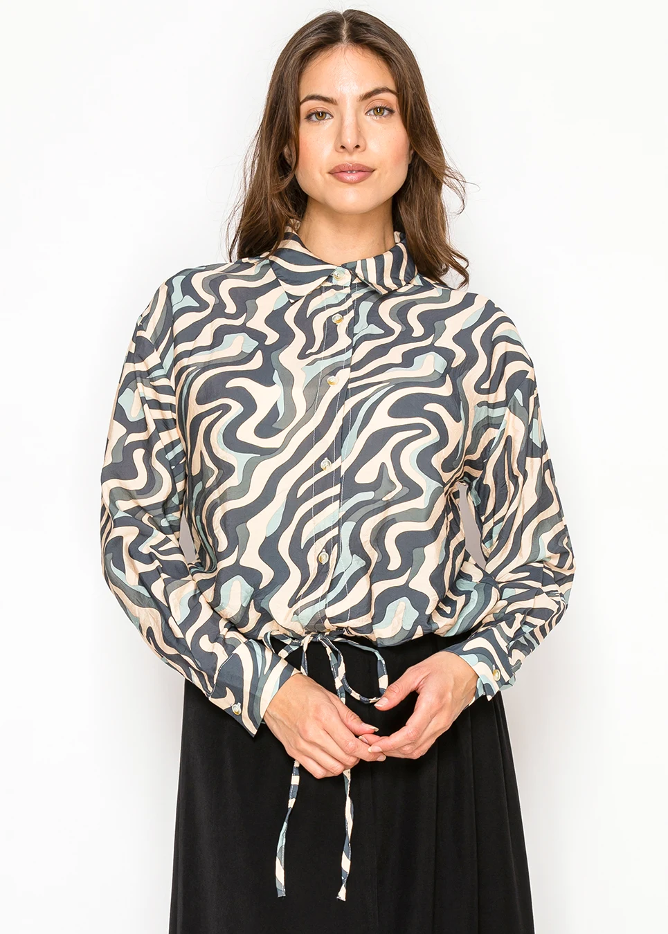 Abstract Print Long Sleeve Button-Front Blouse