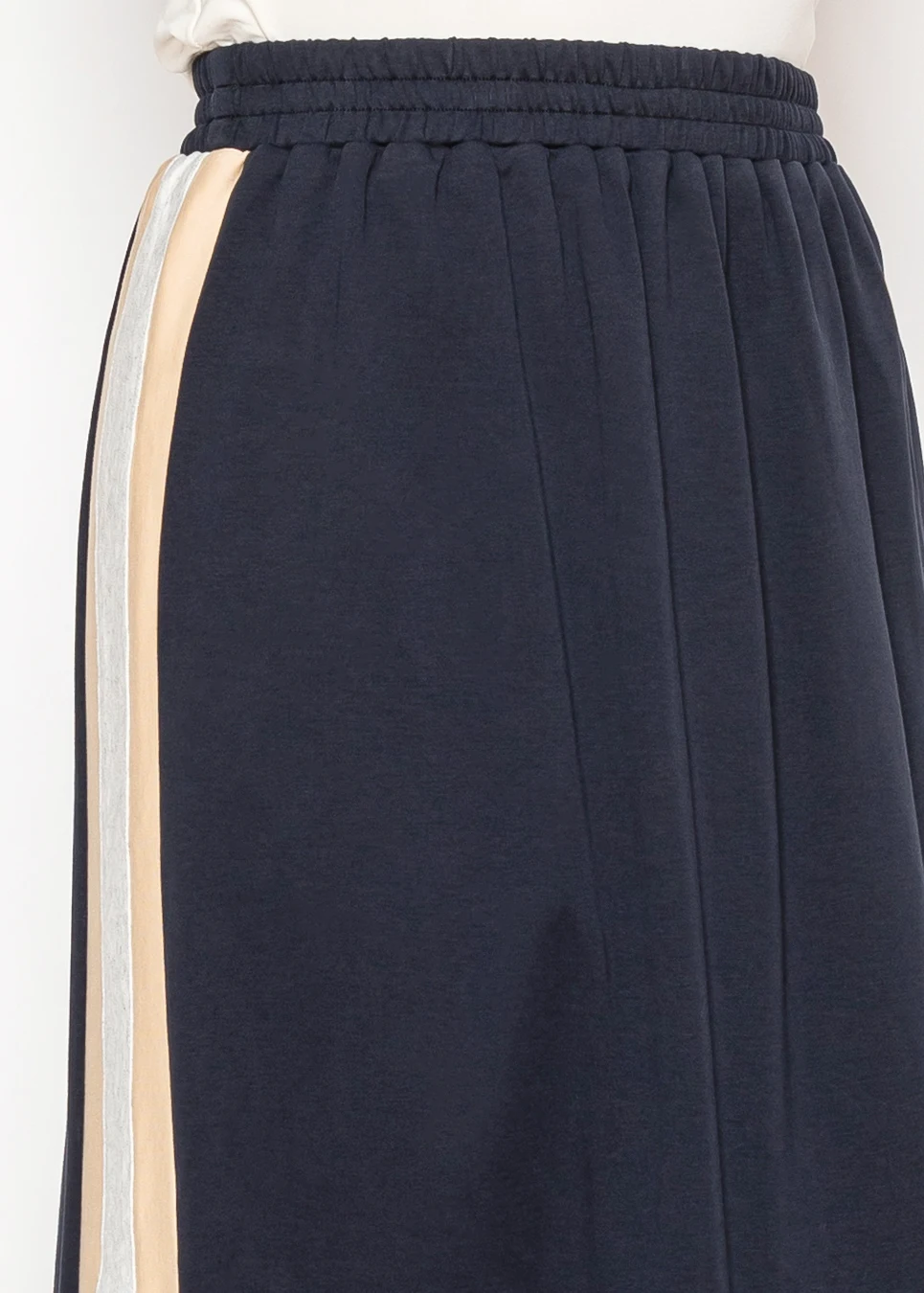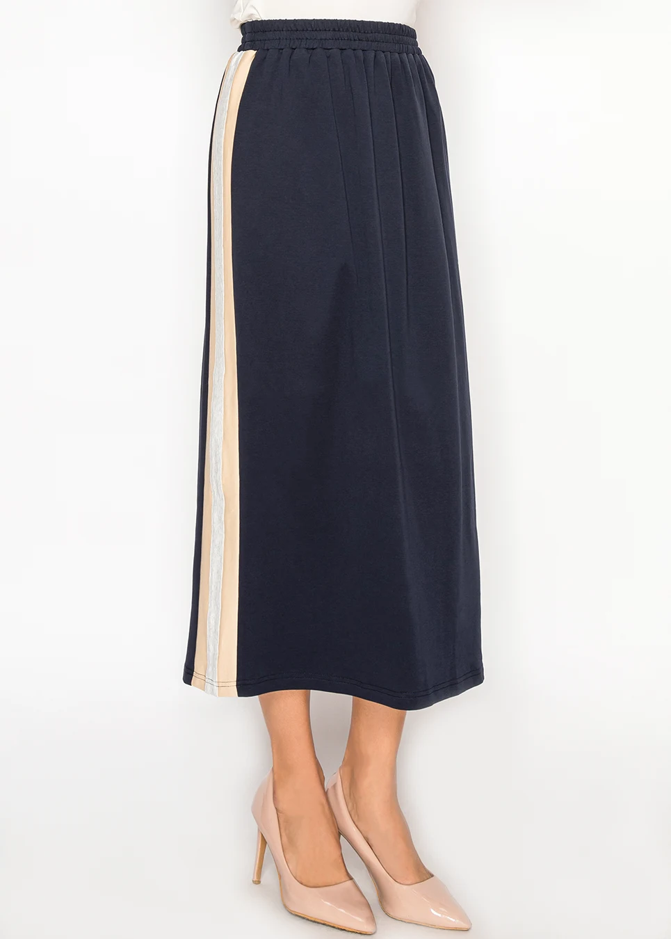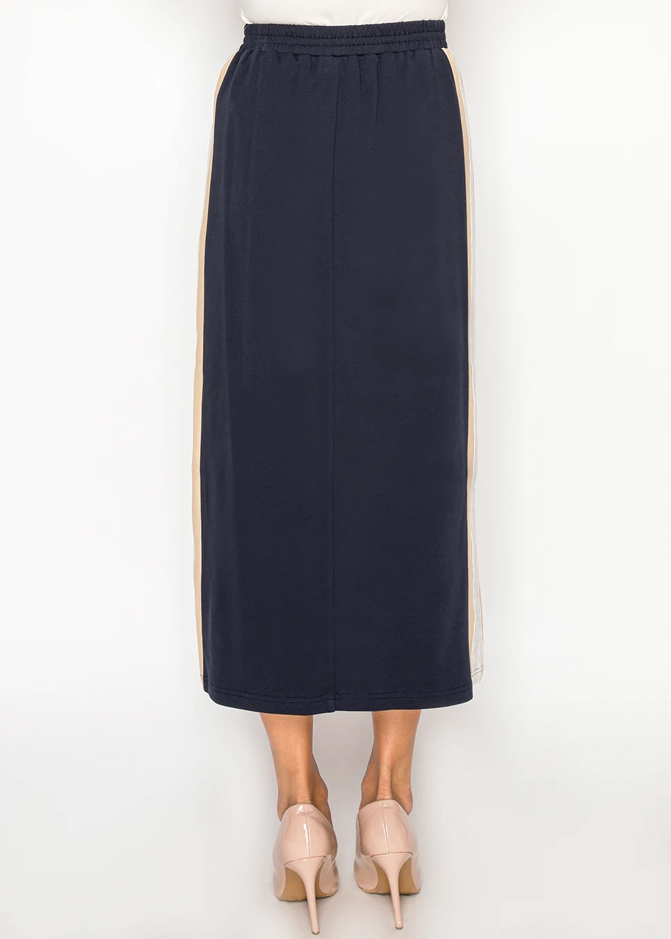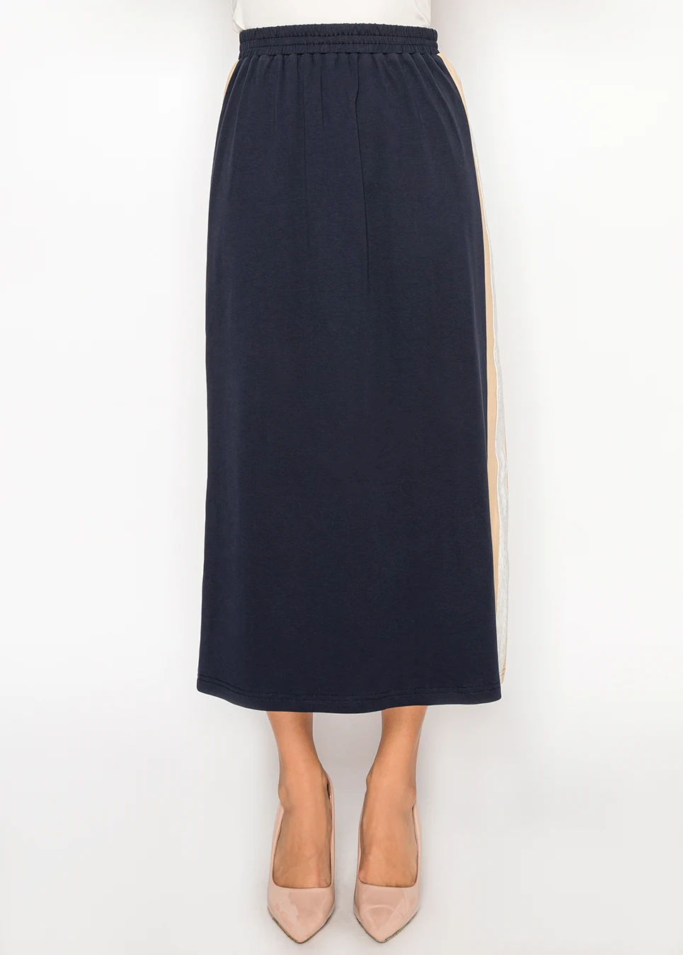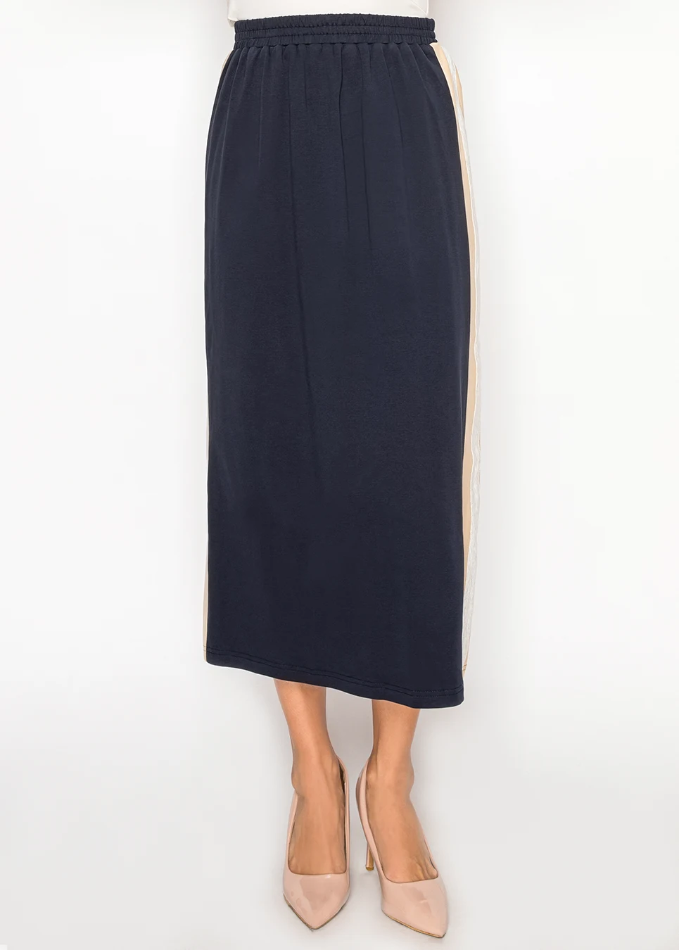 Navy Midi Skirt with Contrast Side Stripe Panel