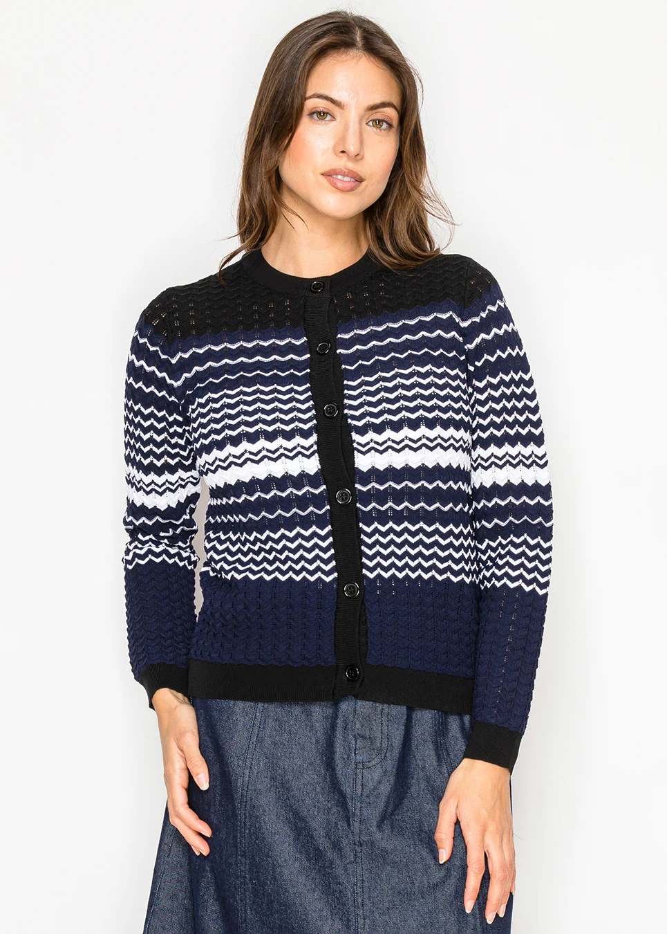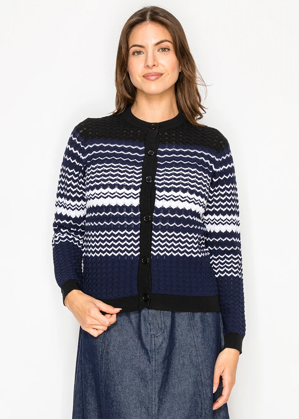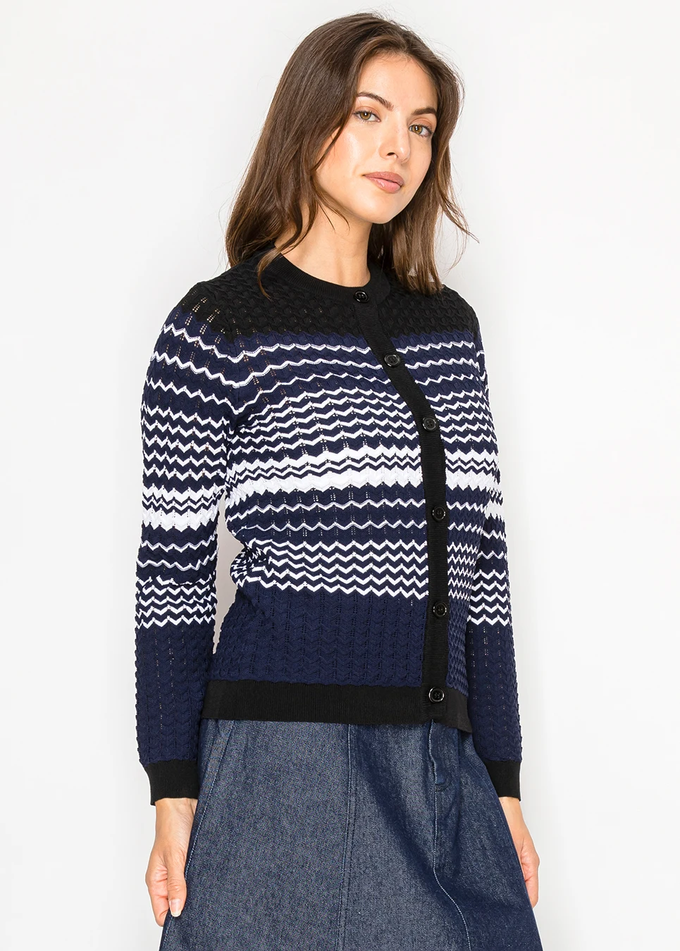 Navy Patterned Knit Cardigan with Button Front
