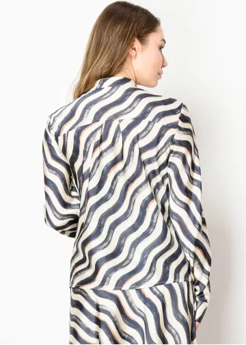 Stripes, but make them fluid. This navy and ivory shirt has a relaxed, artistic feel—like soft waves on fabric. The high neckline keeps it polished, while the breezy fit makes it an easy choice for any day.