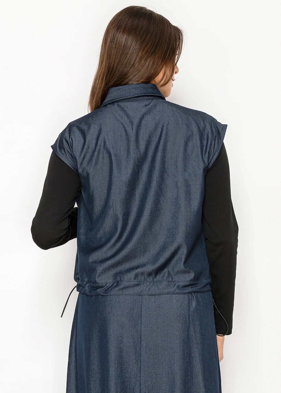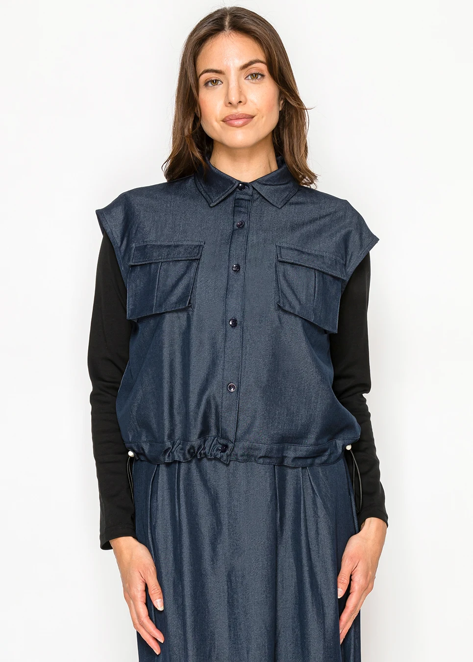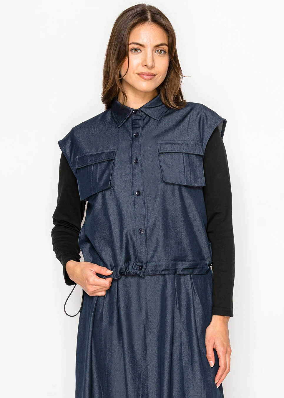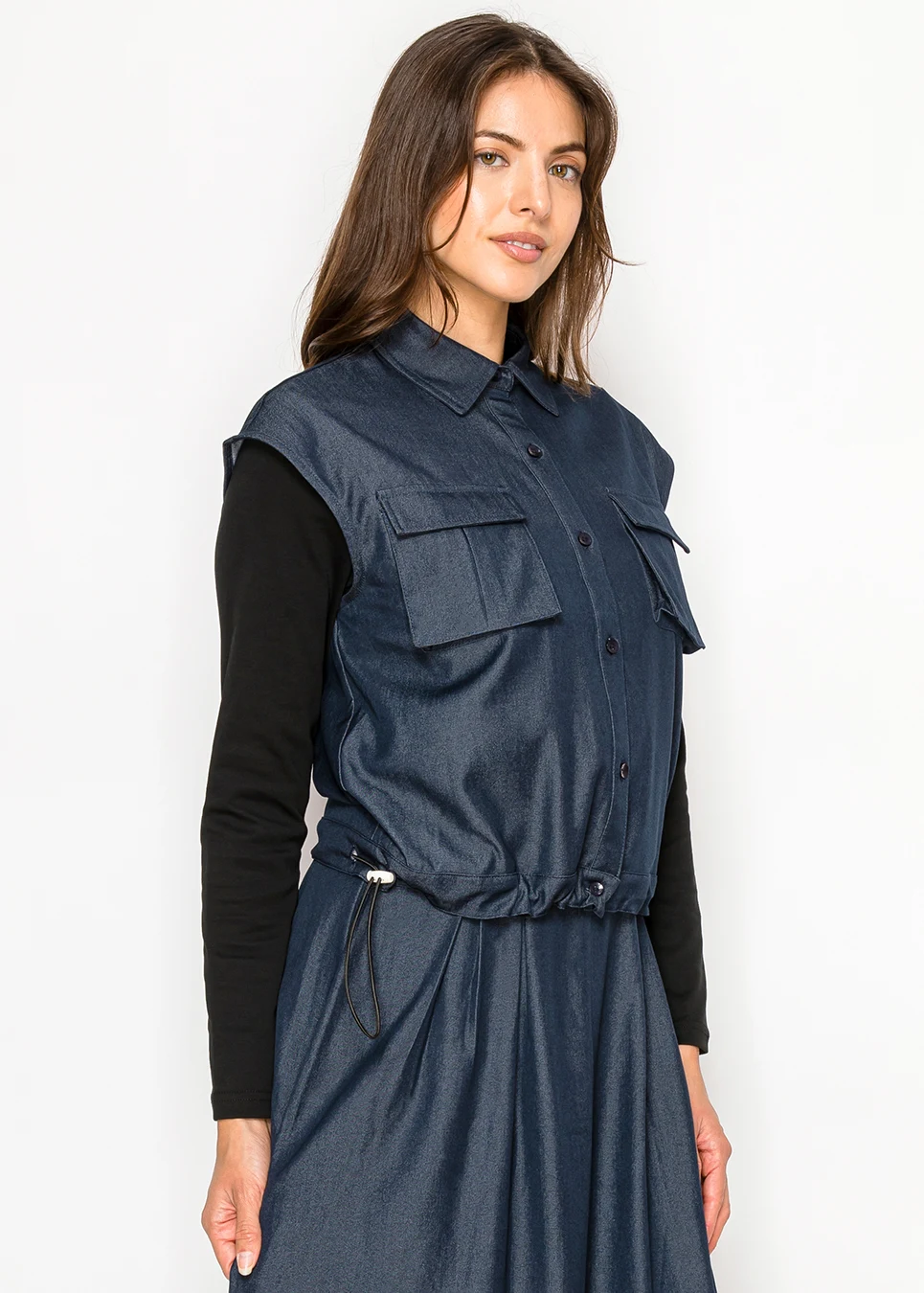 The drawstring at the hem is the detail that makes this one. Cinch it for shape, leave it loose and it skims. Two front patch pockets, button-front, shirt collar. Denim-look fabric that moves like it has somewhere to be. Grab a long-sleeve, add this on top, walk out the door.