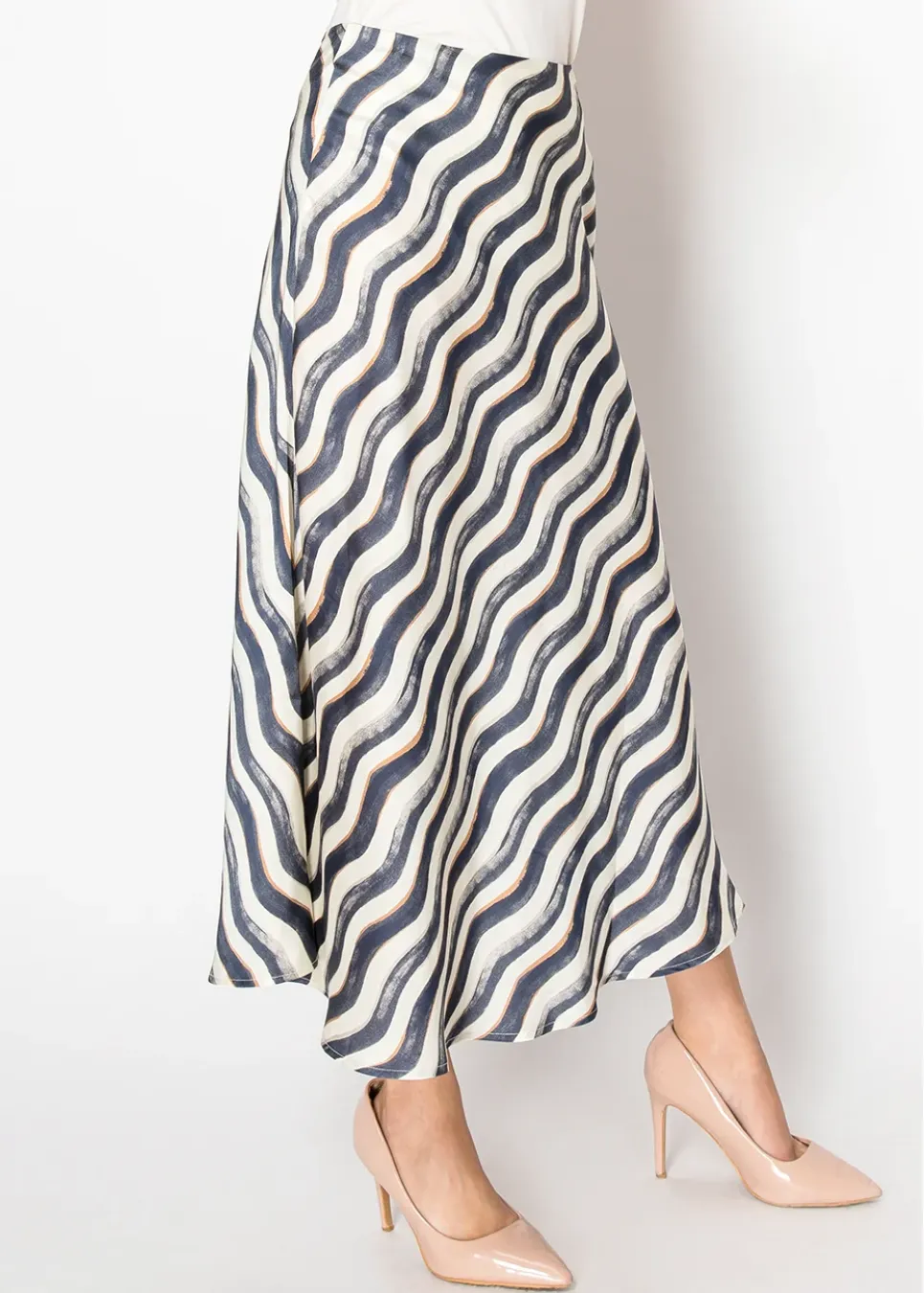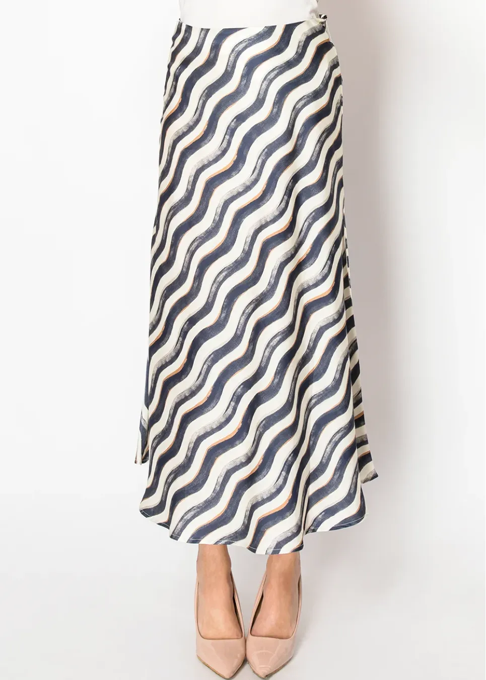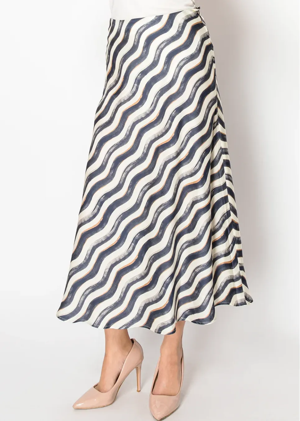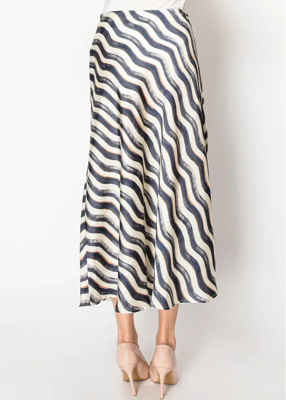 This skirt’s flowing wave pattern evokes a sense of movement and elegance. The midi length and soft fabric make it a comfortable and stylish choice, perfect for pairing with a tucked-in blouse or a lightweight sweater.