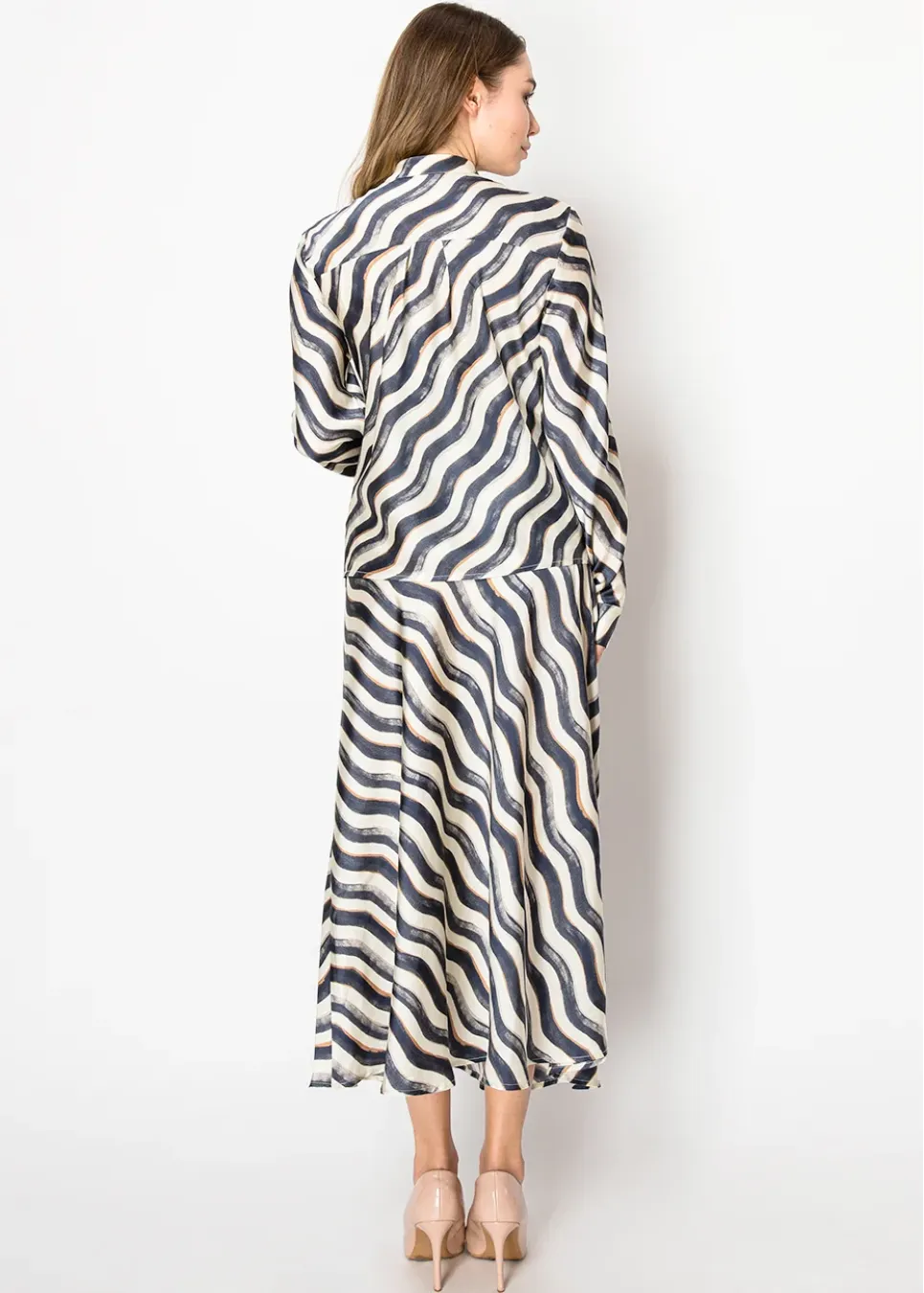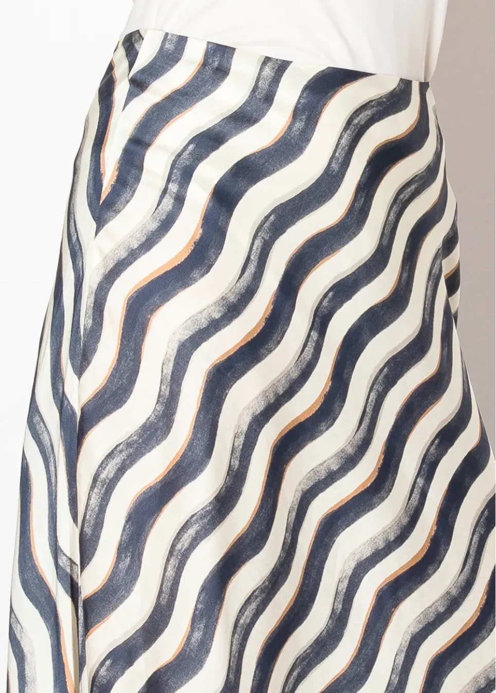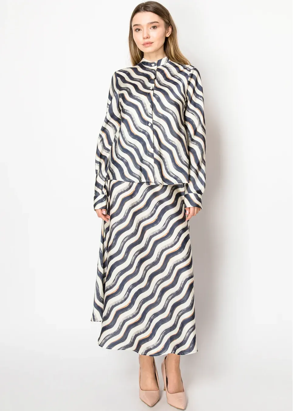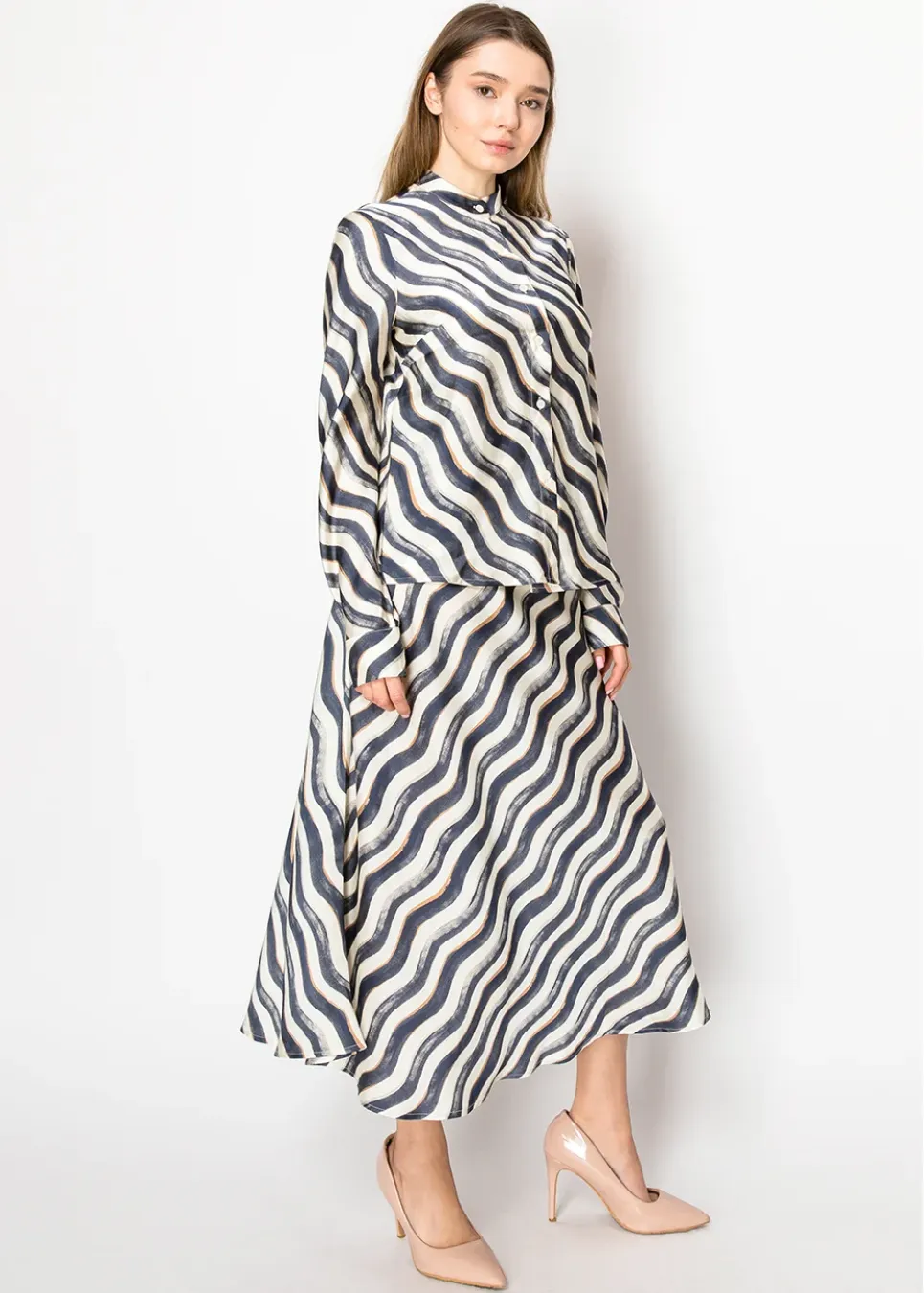 This skirt’s flowing wave pattern evokes a sense of movement and elegance. The midi length and soft fabric make it a comfortable and stylish choice, perfect for pairing with a tucked-in blouse or a lightweight sweater.