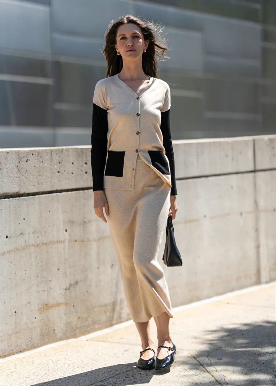 Designed in a ribbed knit with colorblock details, this set is all about understated style. The cardigan and skirt work together or apart, giving you endless outfit options.