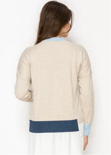 Light as a cloud, this beige sweater with subtle blue details brings effortless style to your wardrobe. The loose fit is flattering yet modest, making it perfect for everyday wear or a relaxed day out.