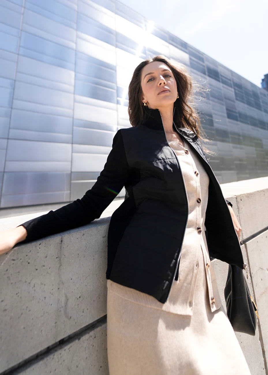 Simple, sleek, and effortlessly elegant. A tonal knit set paired with a black jacket for a look that works anywhere, anytime.