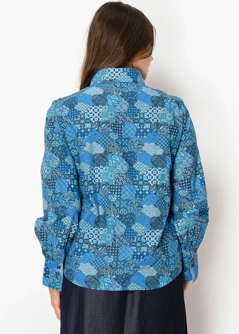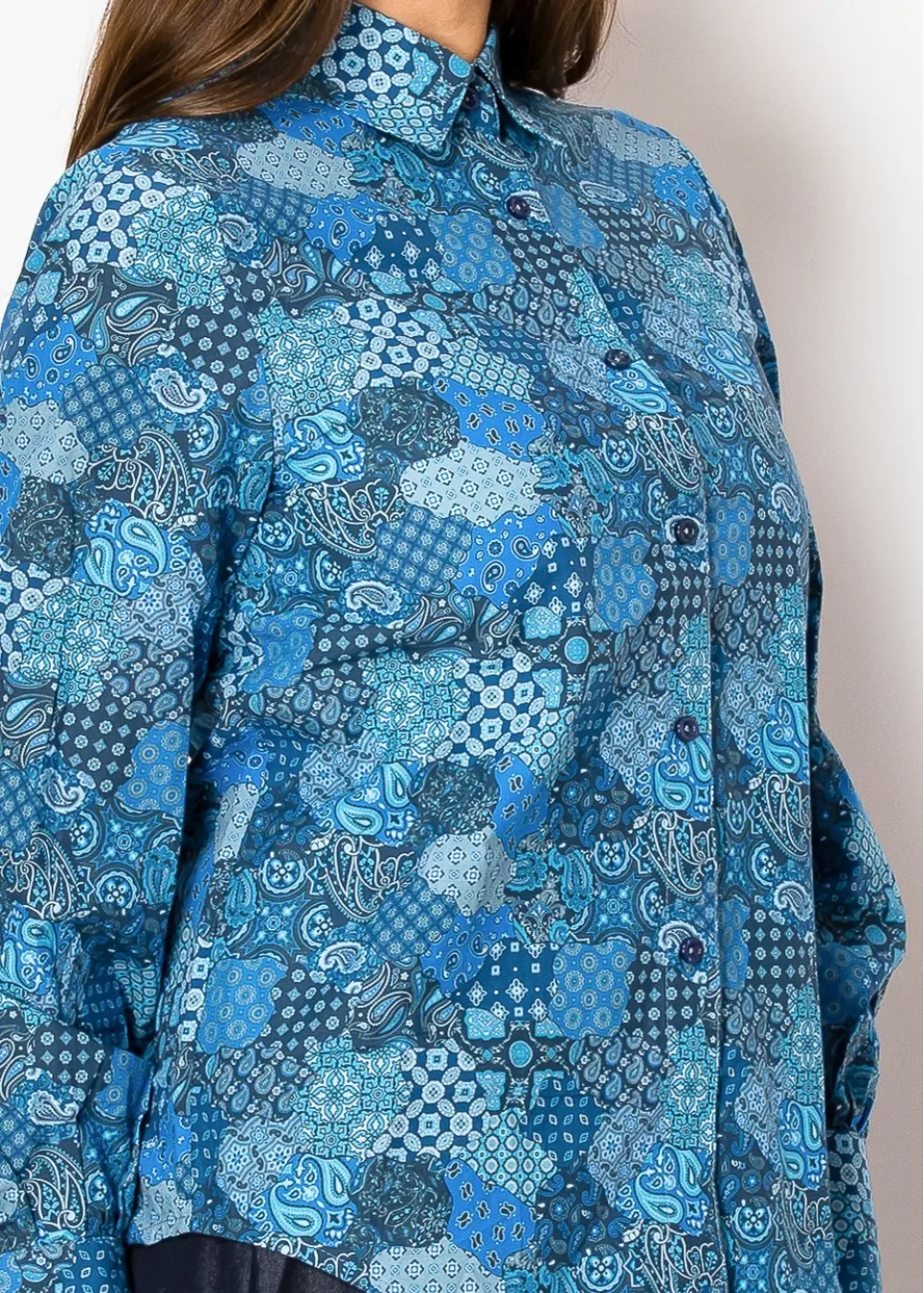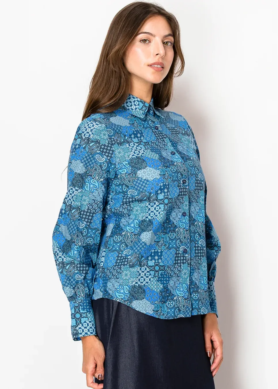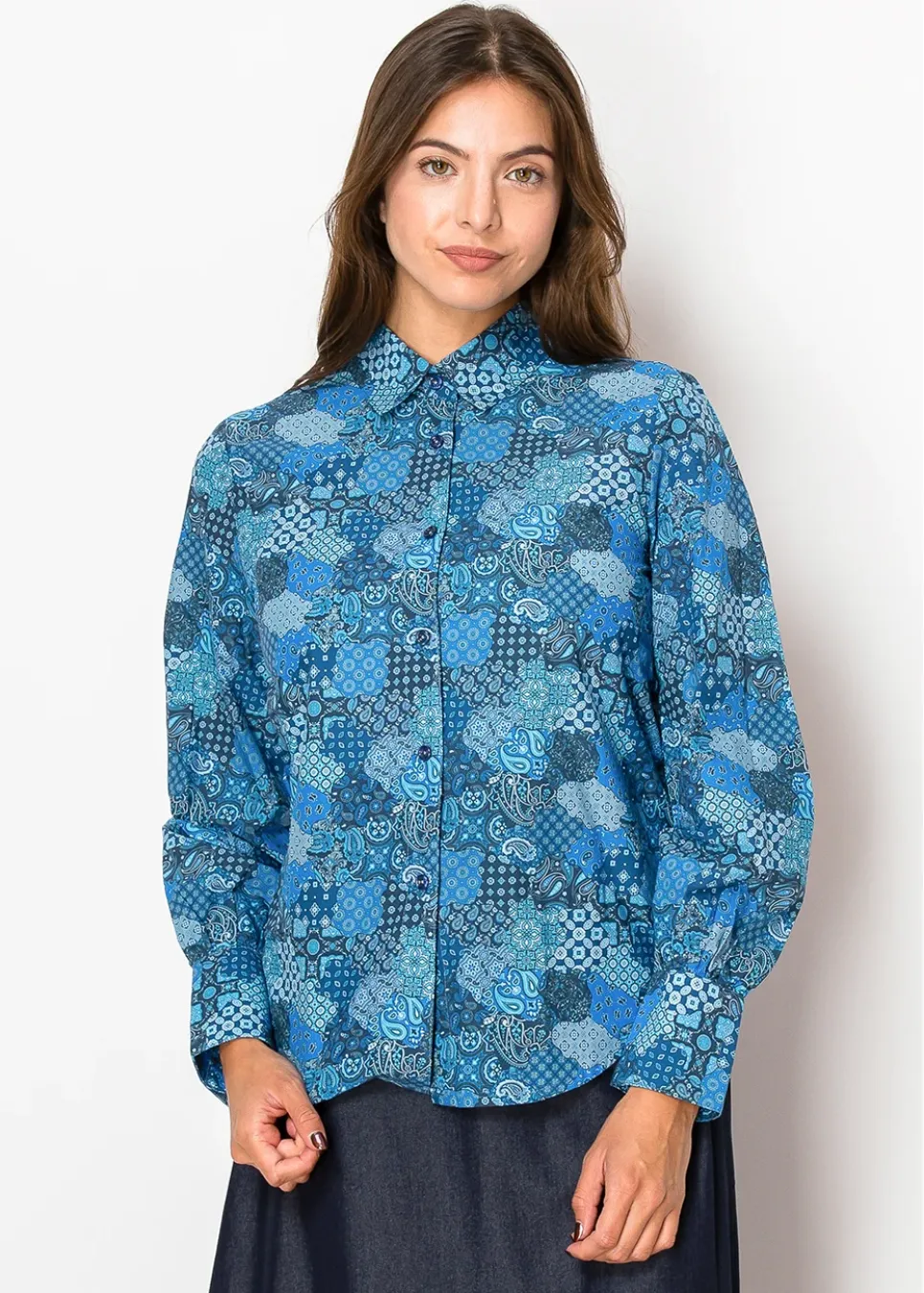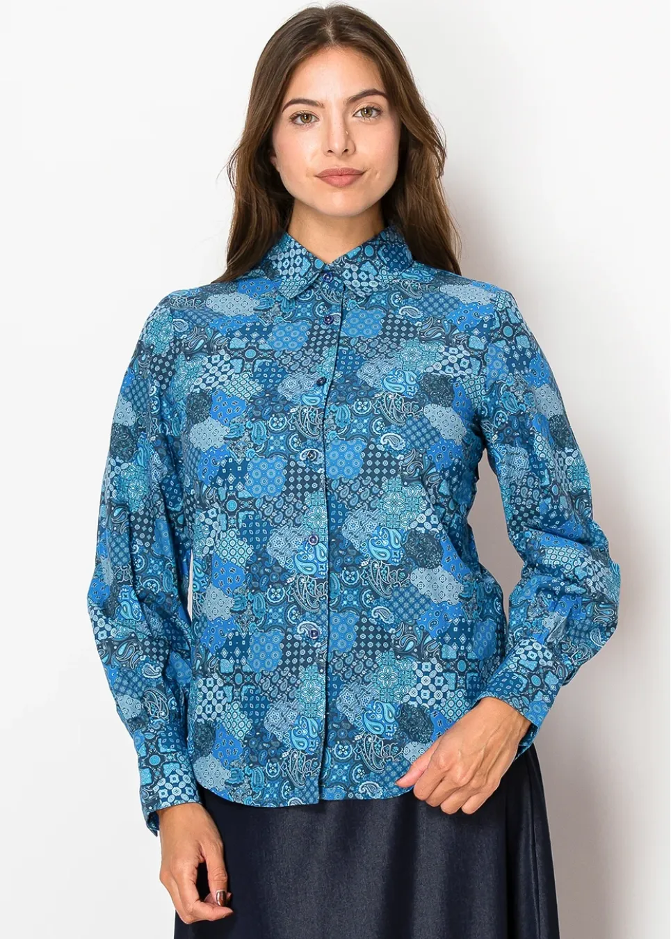 Soft, bold, and beautifully patterned, this top brings a fresh twist to your wardrobe. The rich blue hues and detailed patchwork design keep it unique yet wearable. The full-button front and classic collar give it a timeless, modest look.