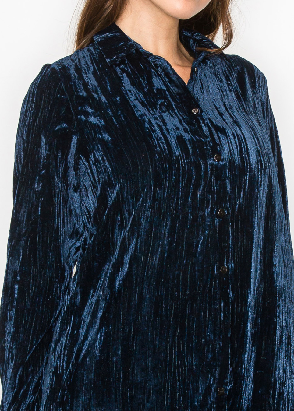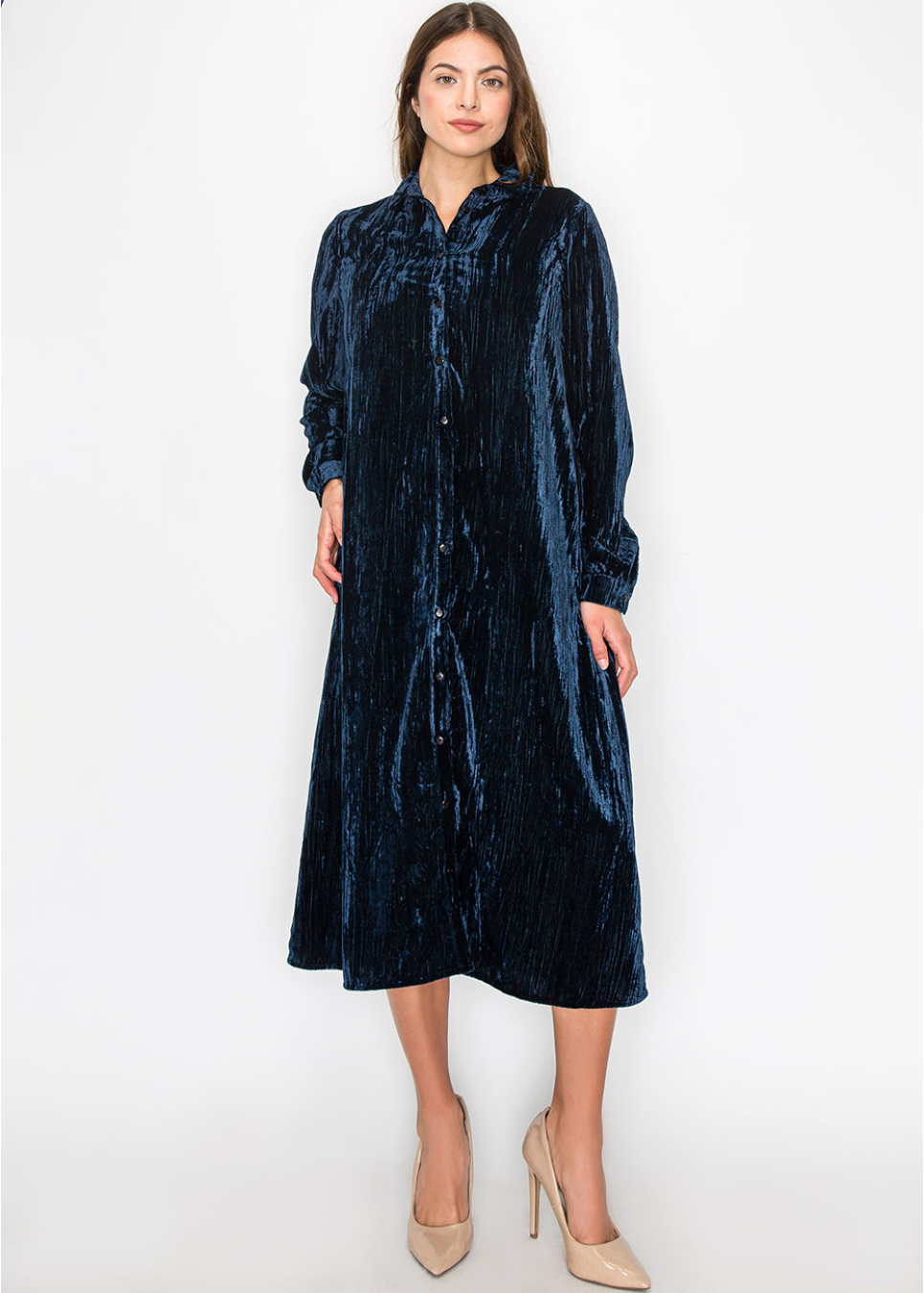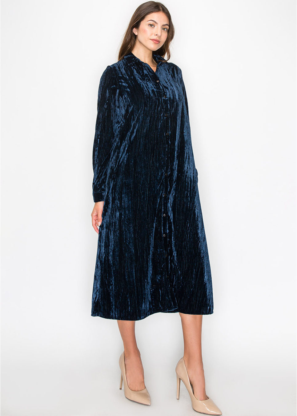 Dive into the rich, deep tones of this ocean-inspired blue velvet dress. The soft, luxurious fabric and modest design make it a standout piece for any occasion. With long sleeves and a button-down front, it offers both comfort and style in one beautiful package.