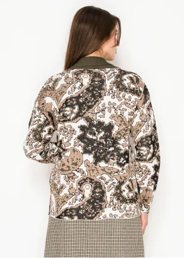 A refined jacquard cardigan in olive tones, designed with elegant contrast trim and tailored ribbed edging. Its fluid knit texture elevates layering with quiet sophistication.