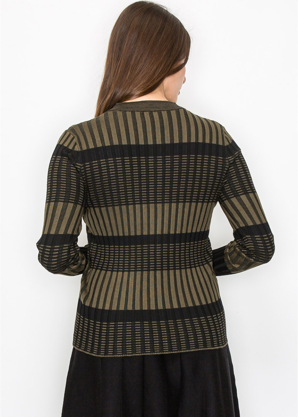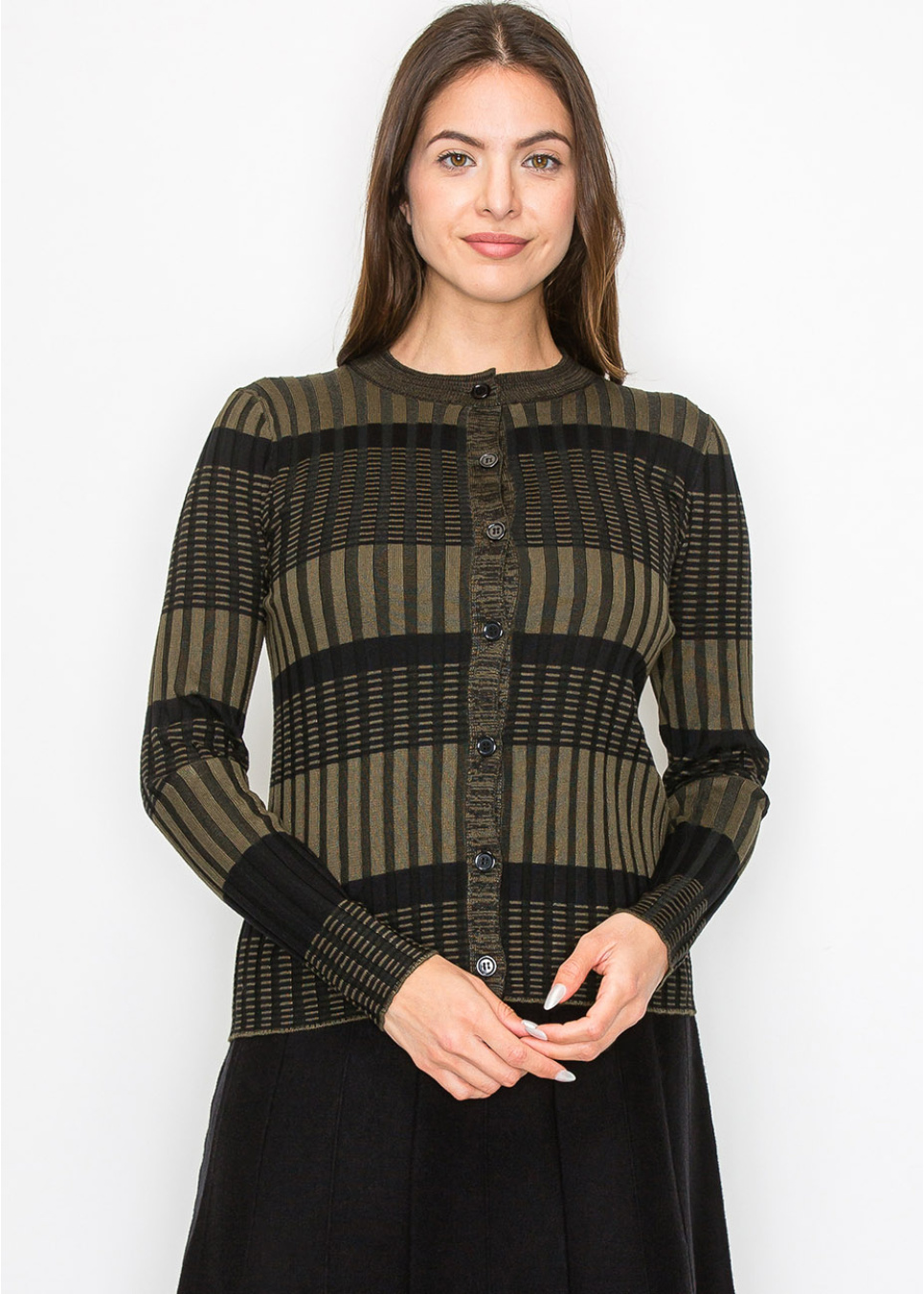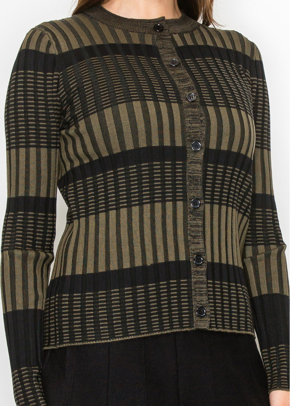 Elevate your casual style with this ribbed cardigan featuring bold olive and black stripes. The soft knit fabric ensures all-day comfort, and the button-front design makes it easy to layer over your favorite modest outfits. A stylish yet simple addition to your wardrobe.