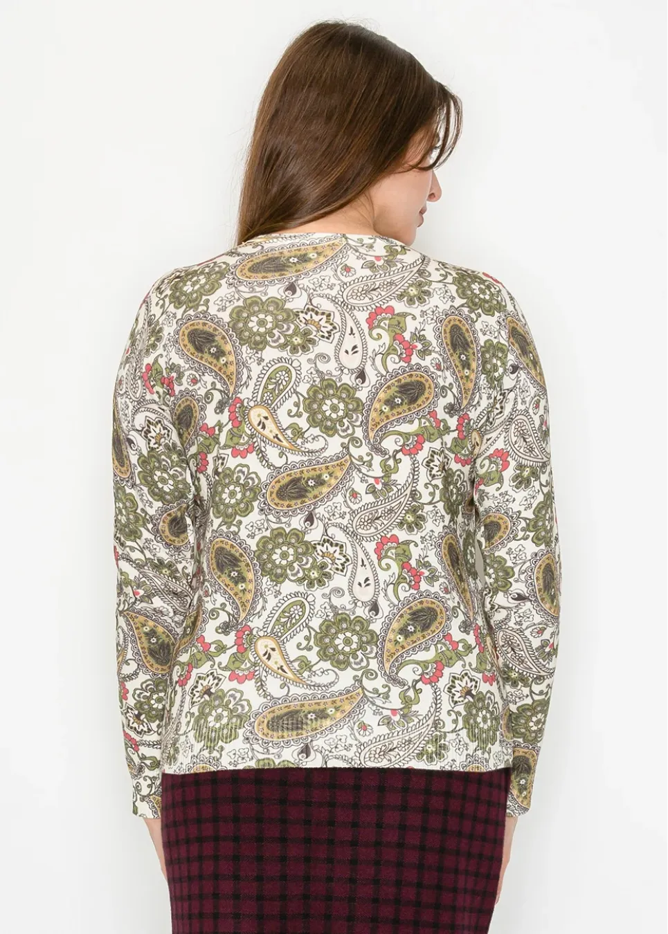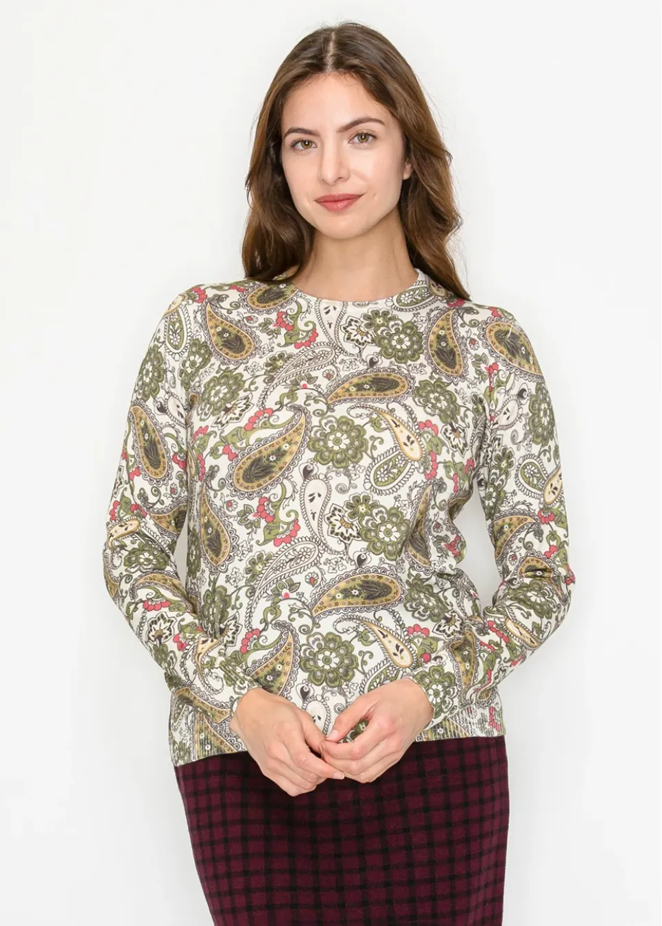 Bold paisley swirls and earthy tones make this sweater a statement layer. A fashion-forward knit that brings personality to your wardrobe.