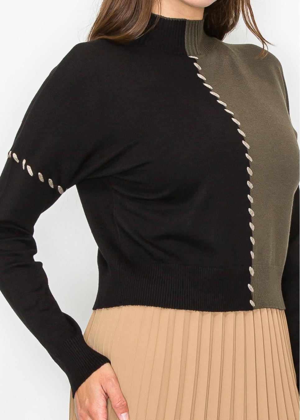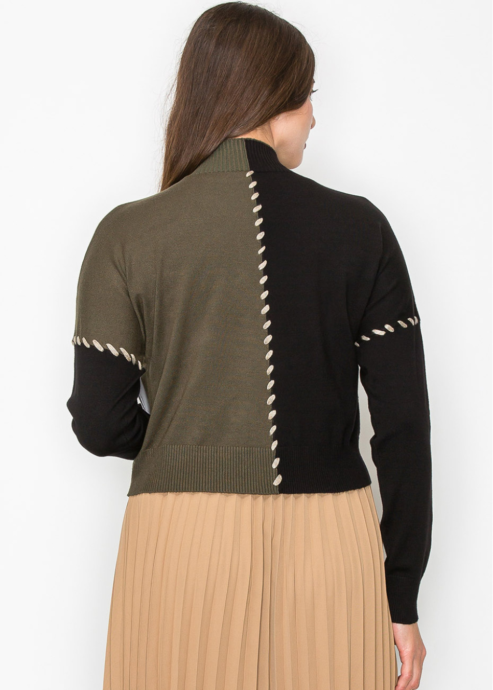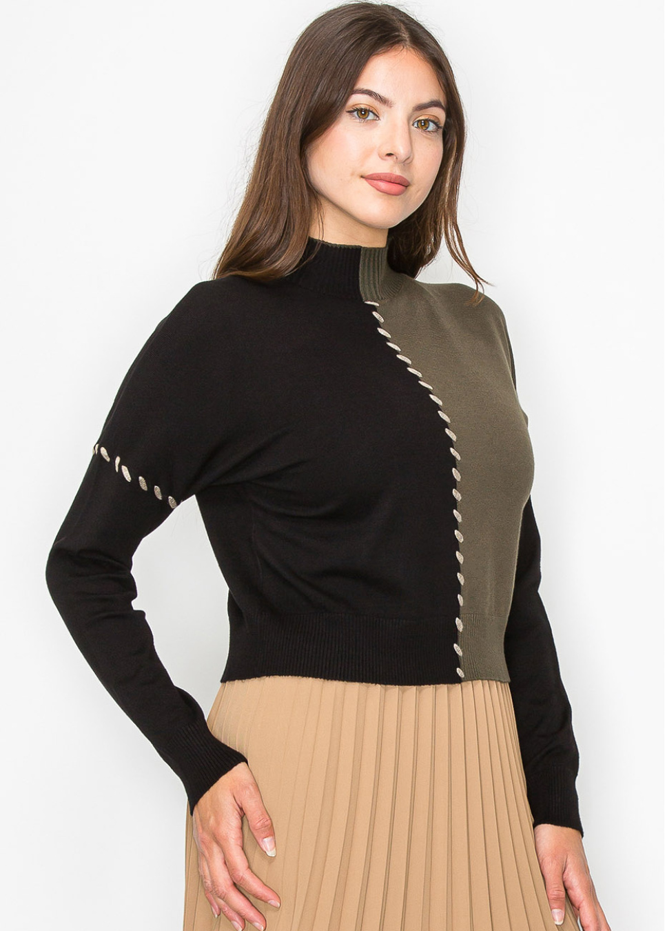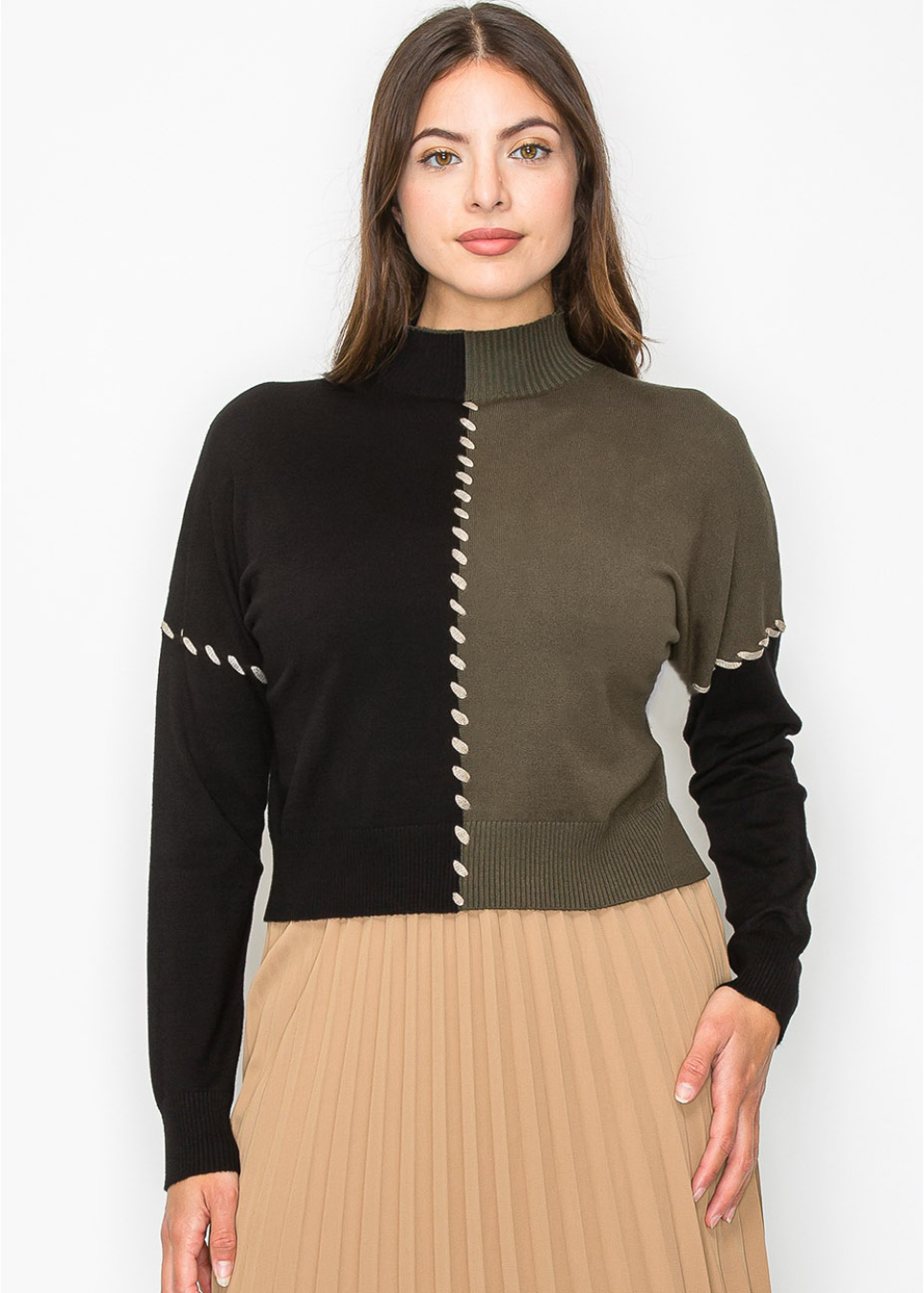 Designed to make a statement, this sweater features a striking olive and black colorblock pattern with playful contrast stitching. The mock neck enhances its structured look, making it an elegant option for casual or dressed-up occasions. Its soft and comfortable fabric ensures all-day wear, perfect for cooler days.