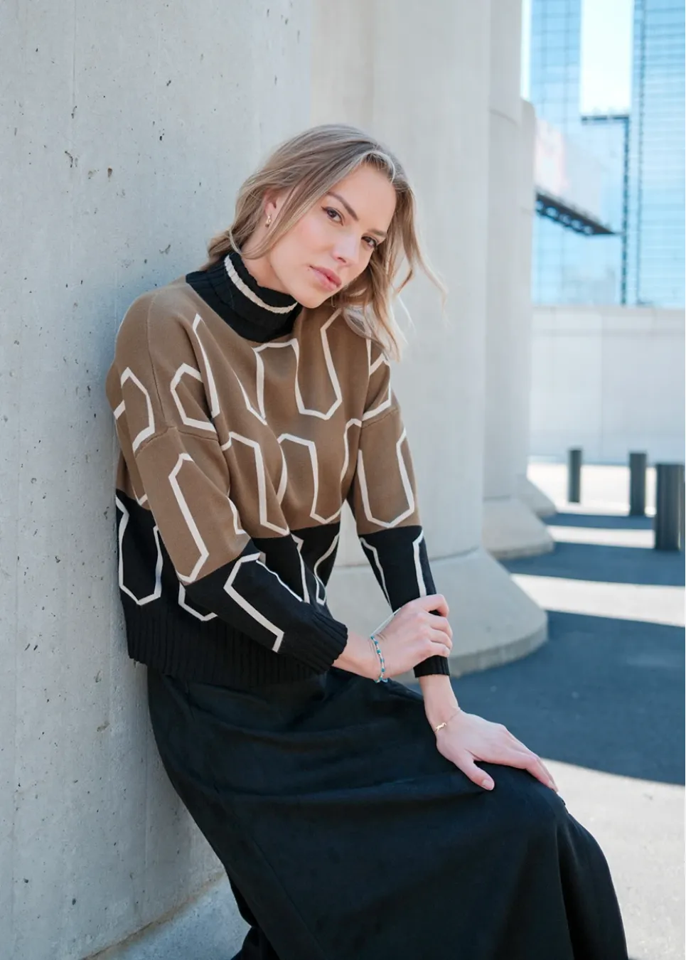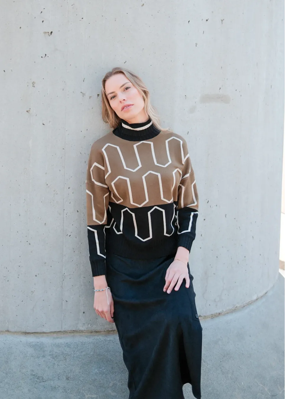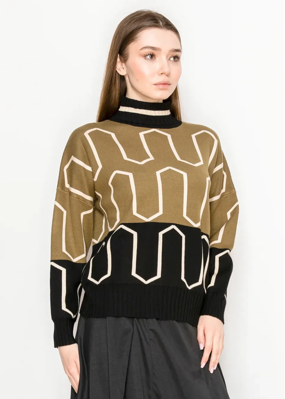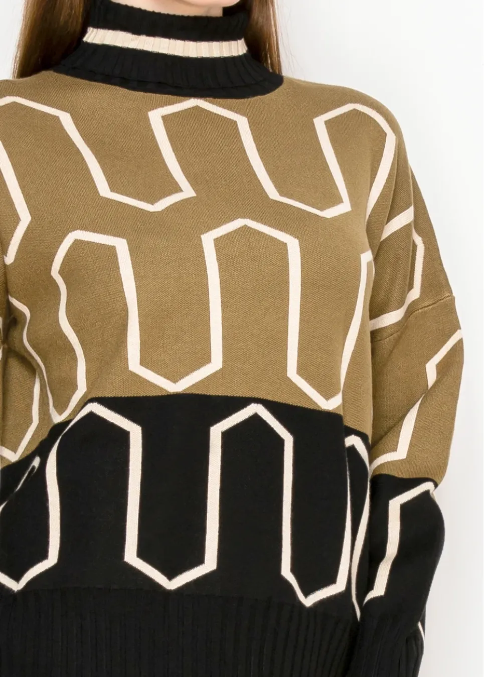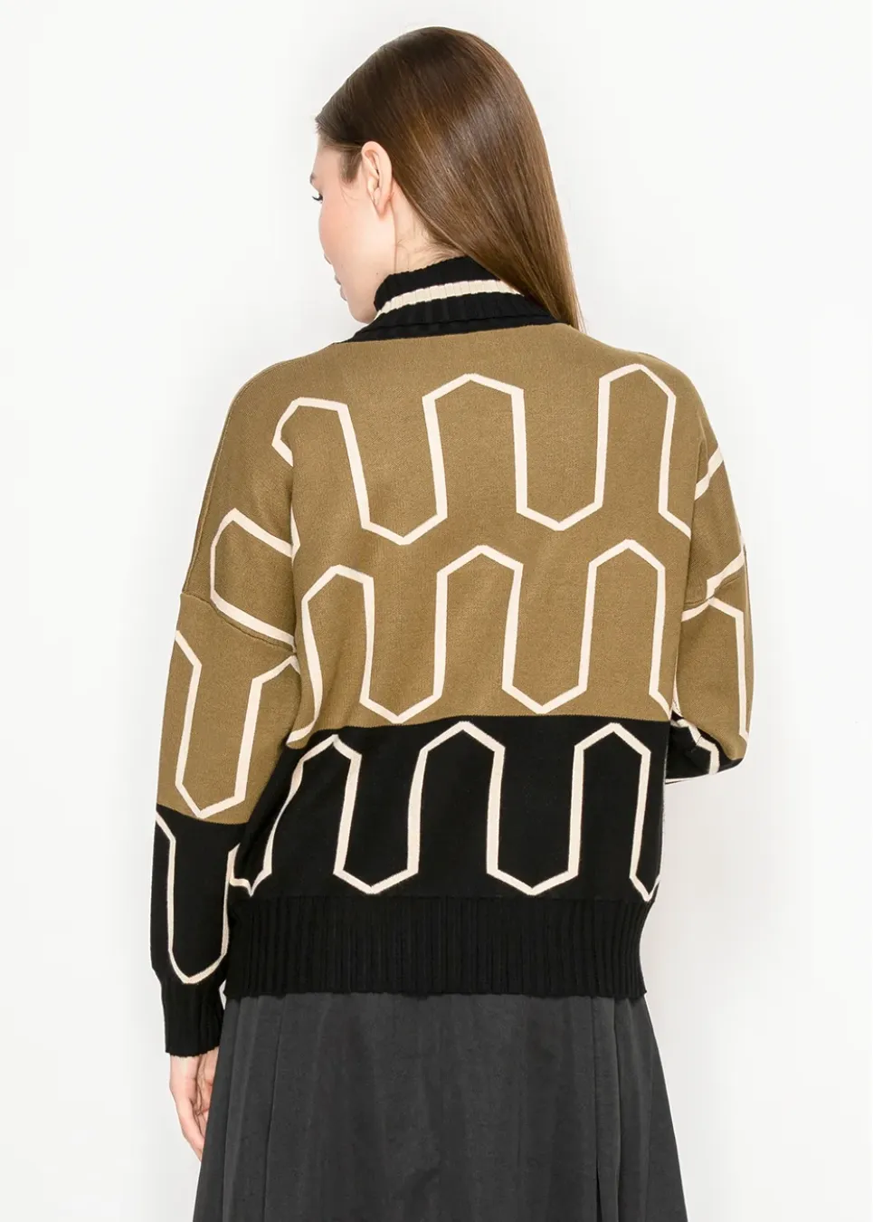 A statement you don’t have to shout. This structured sweater features graphic lines and a pop of cream against deep olive and black. Finished with a soft mock neck and ribbed hem.