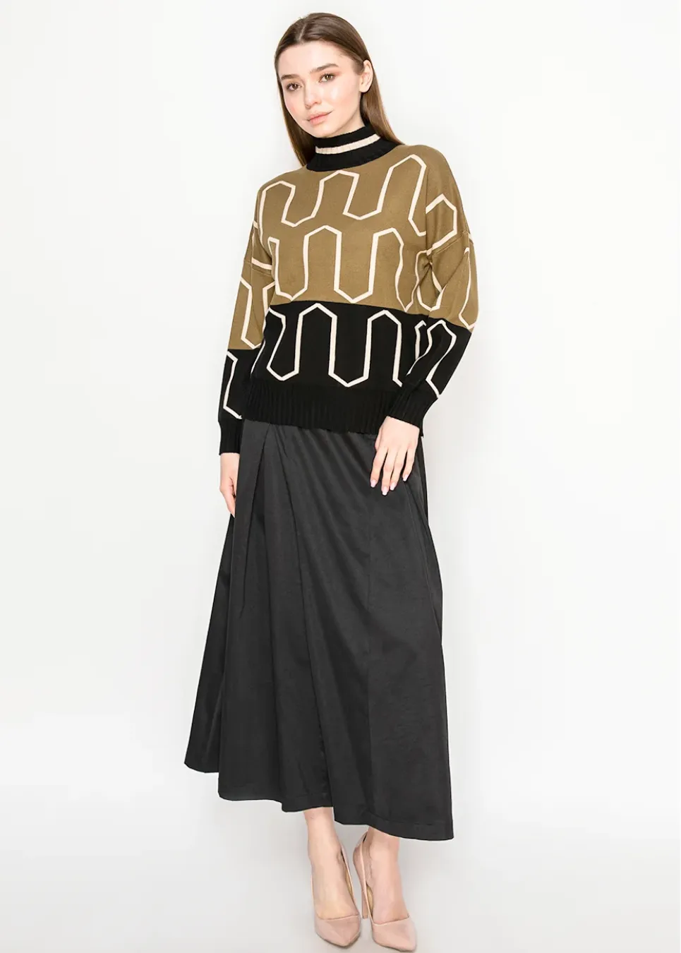 Olive Black Patterned Mock Neck Sweater