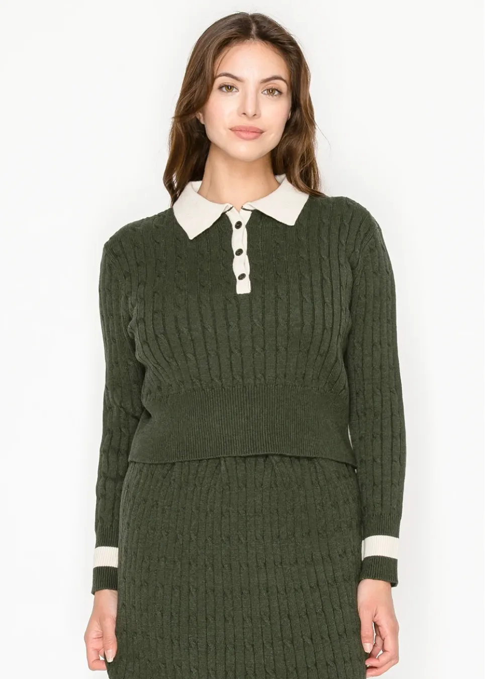 Olive Cable Knit Polo Sweater with Contrast Collar