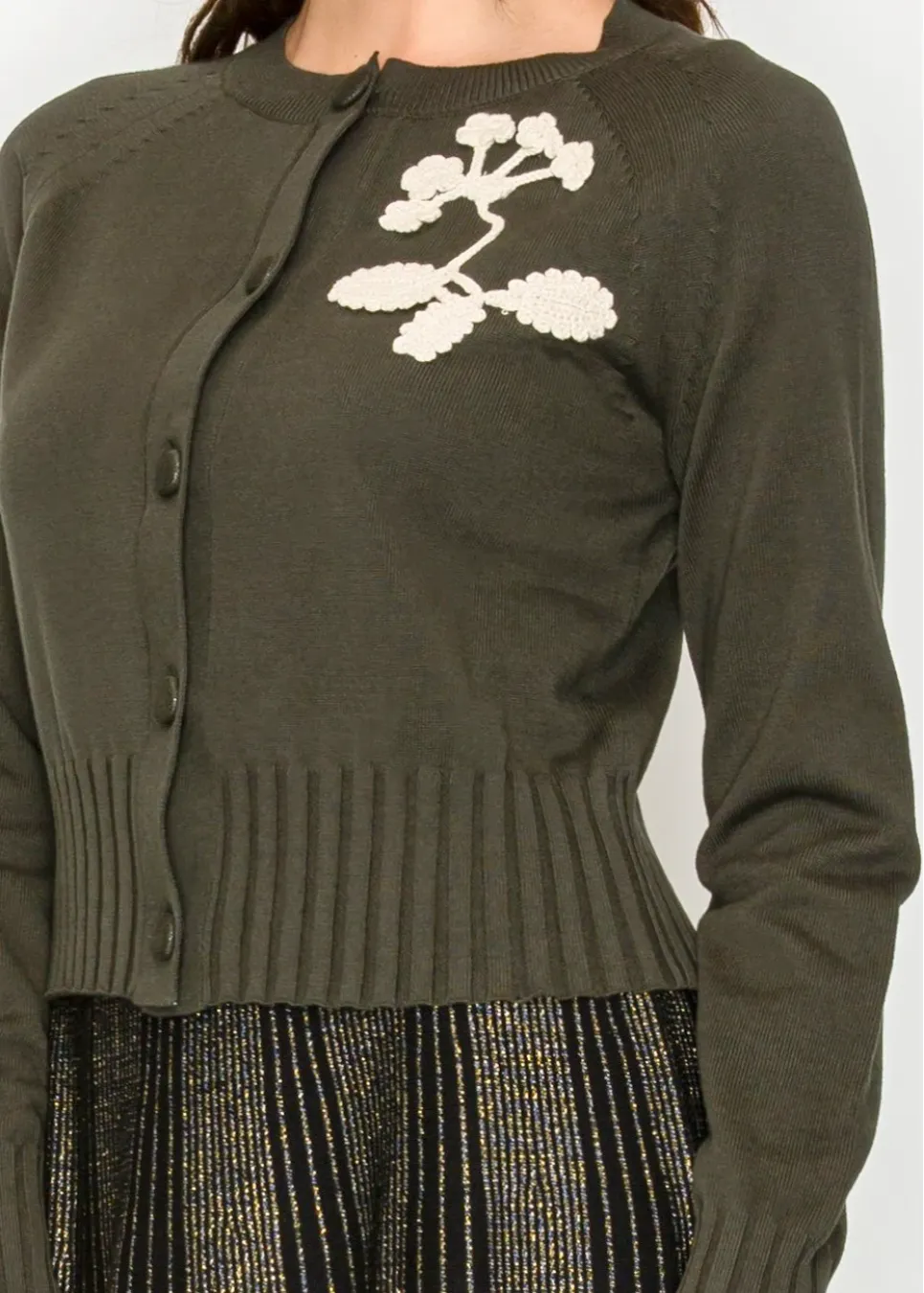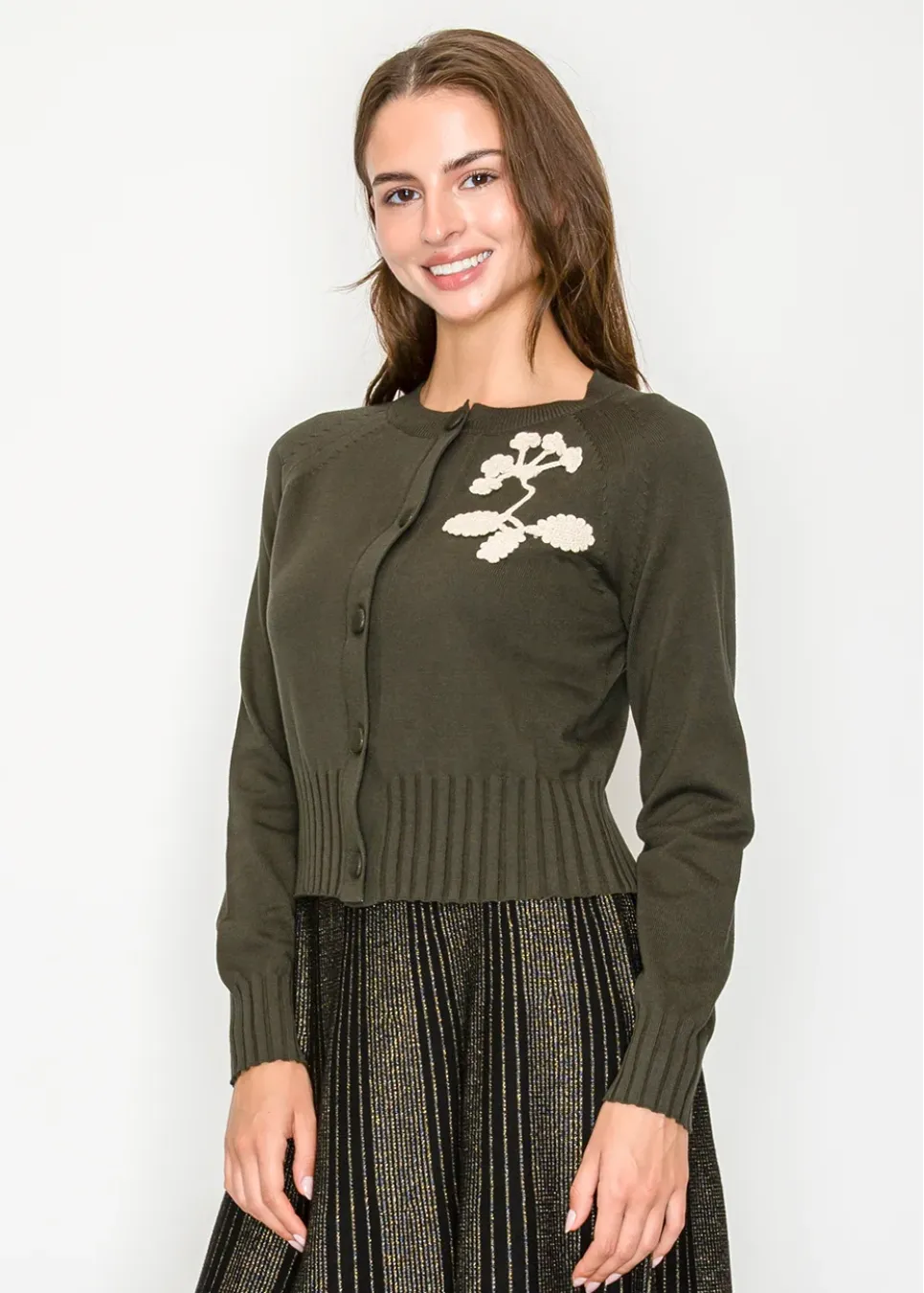 Olive Cardigan with Embroidered Leaf Detail