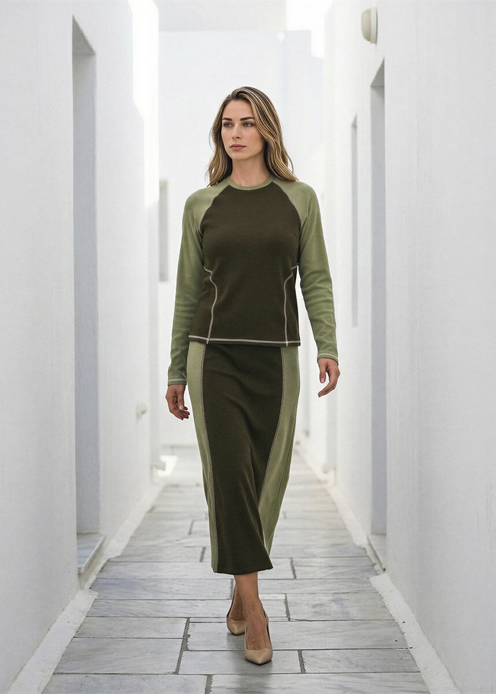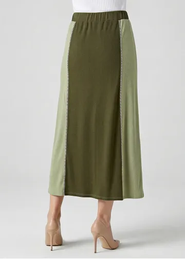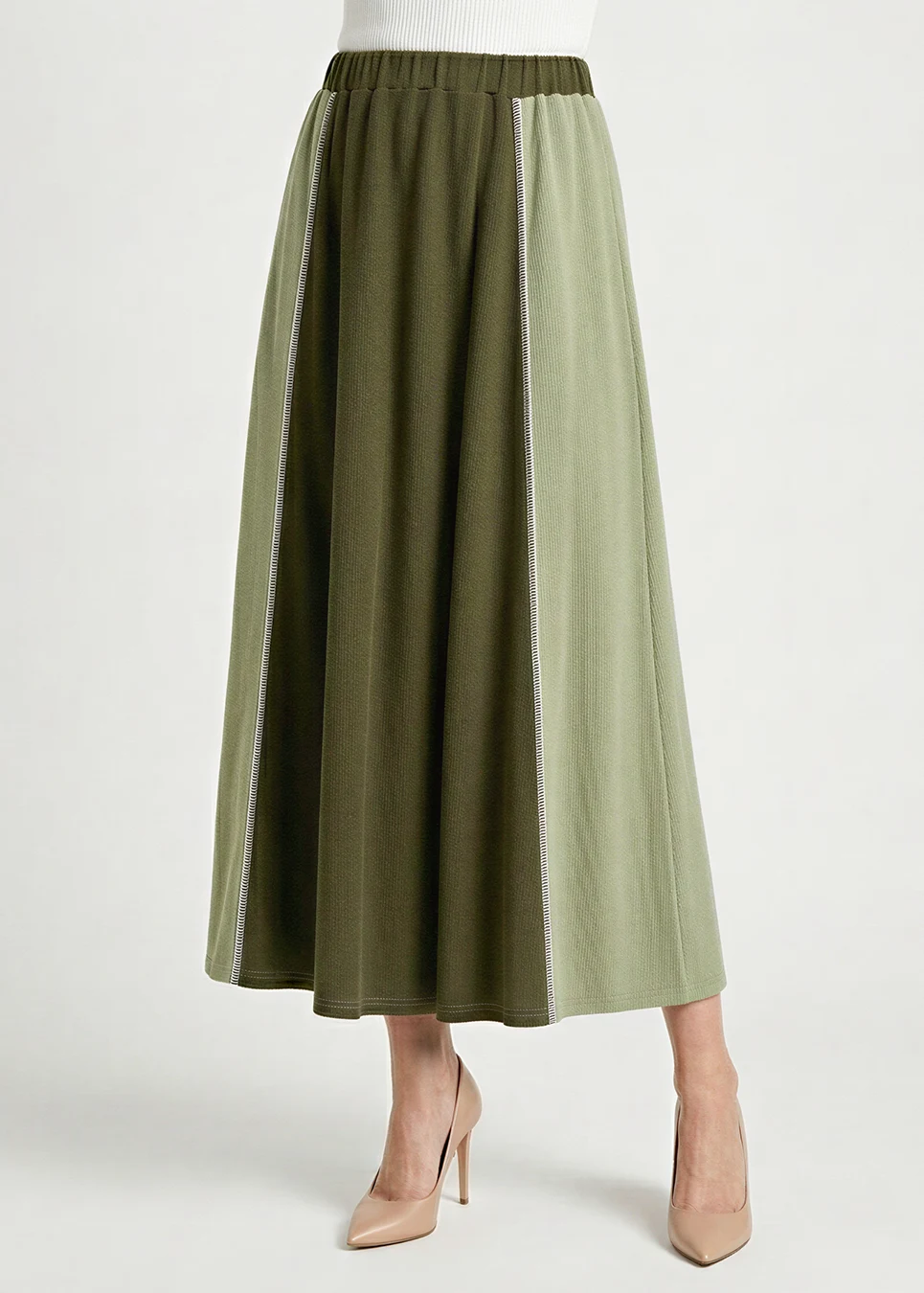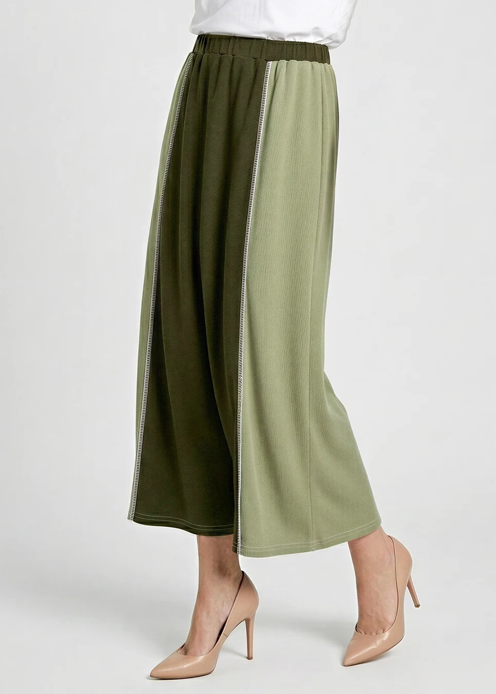 An olive center panel framed by lighter sides and subtle piping creates a slimming visual effect. The elastic waistband sits comfortably without bulk, making it easy for all-day wear.