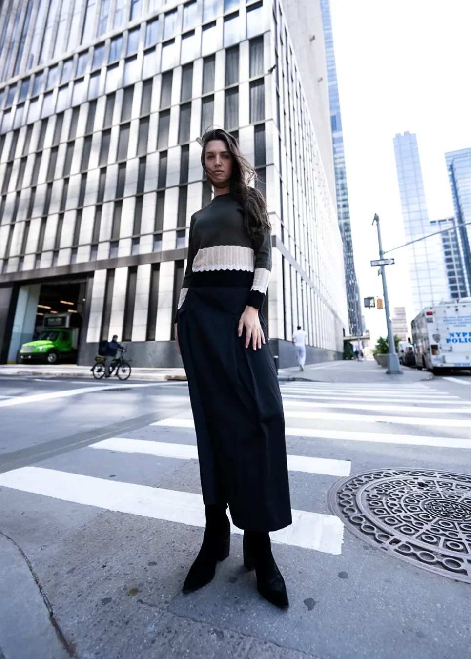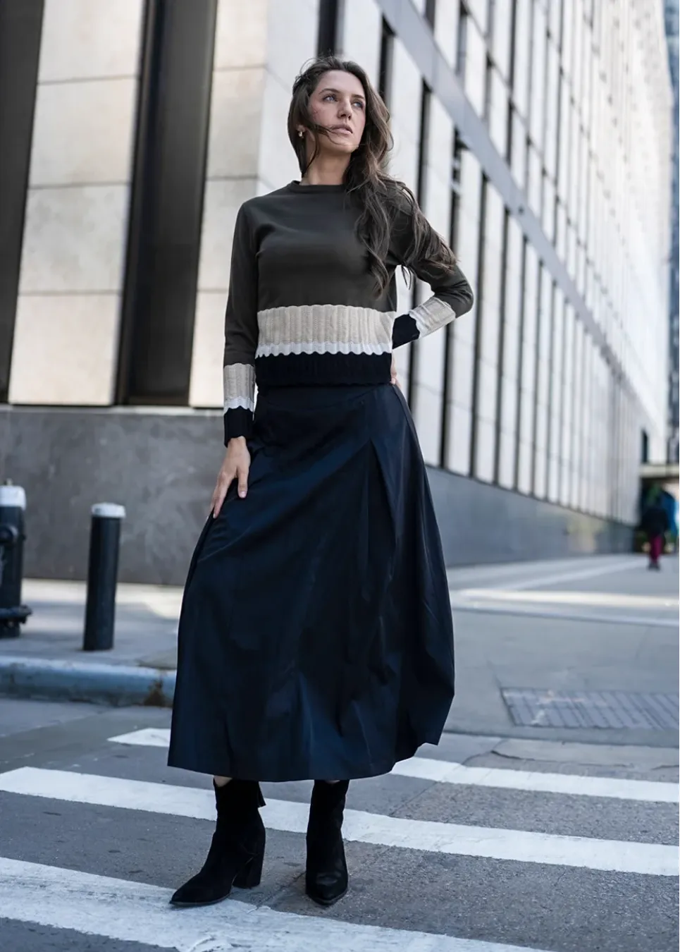 Olive Contrast Knit with Black Skirt Outfit