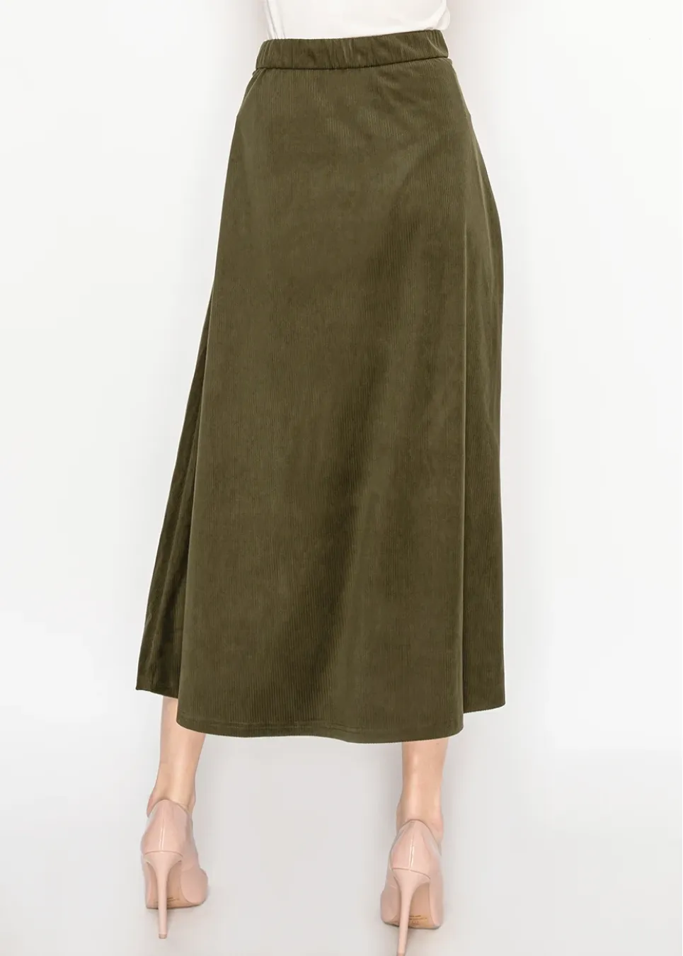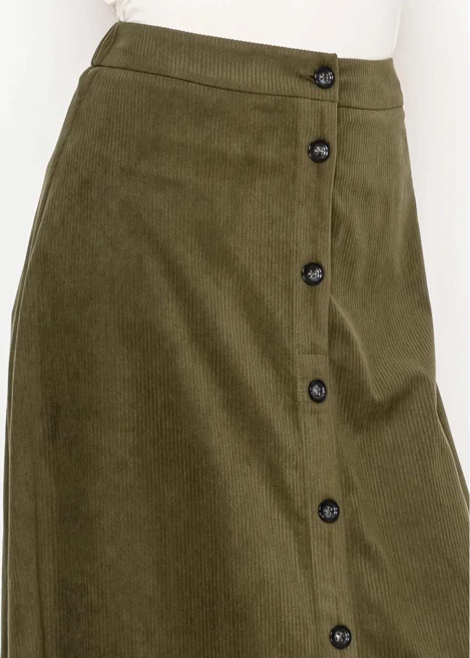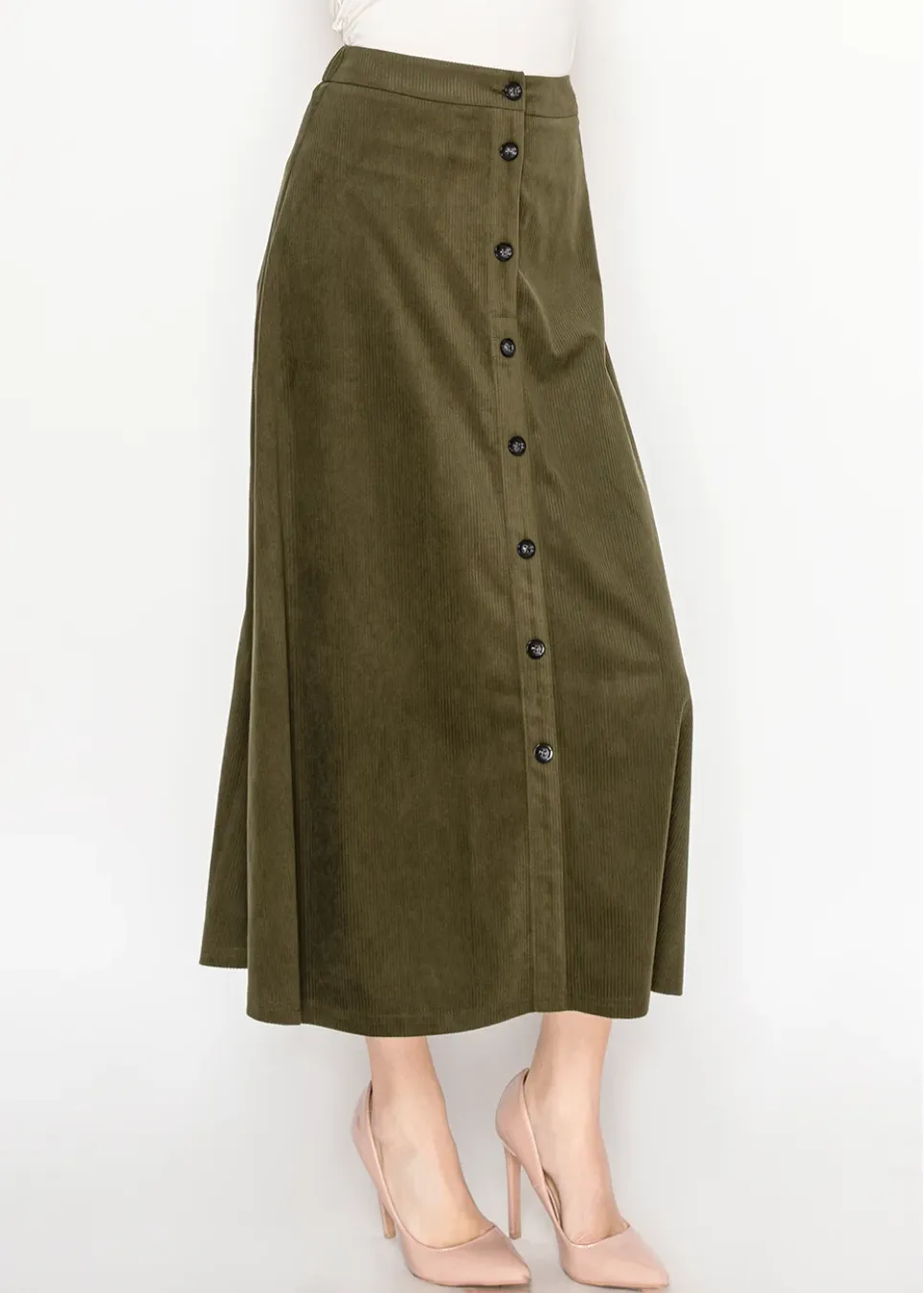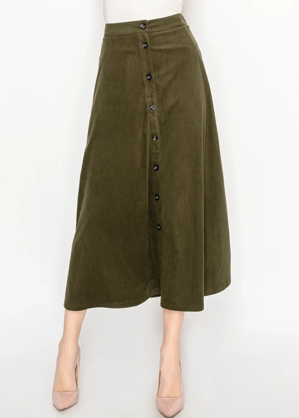 A classic corduroy midi skirt in olive green with a full button front. Easy to style for casual days or polished with a crisp blouse.