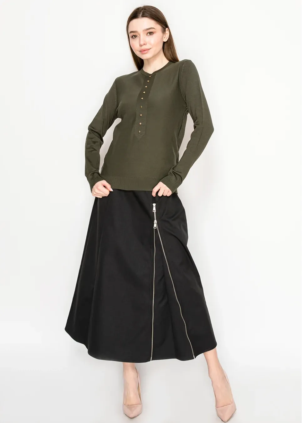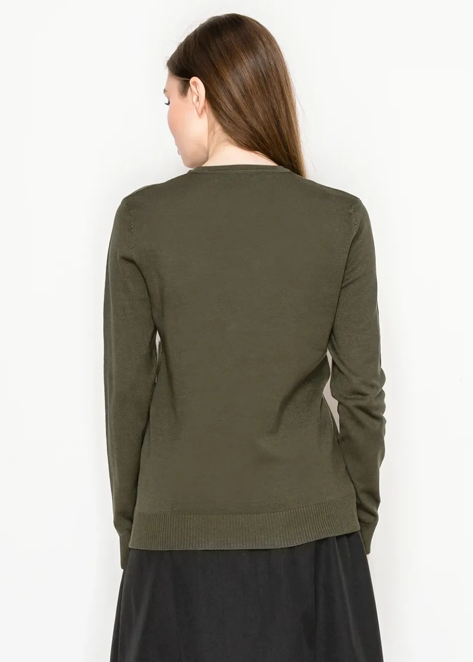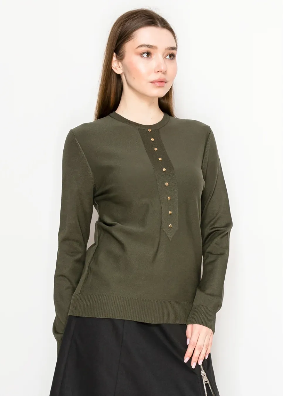 The kind of sweater you’ll reach for again and again—soft olive knit, long sleeves, and those little gold buttons that instantly dress it up. Works for casual days or evenings out.