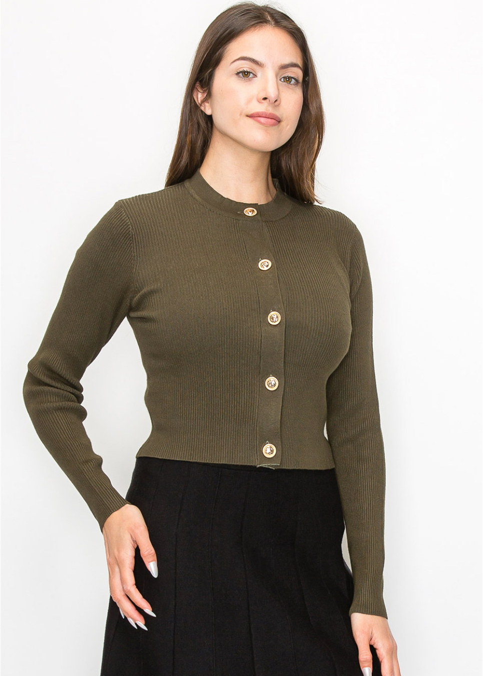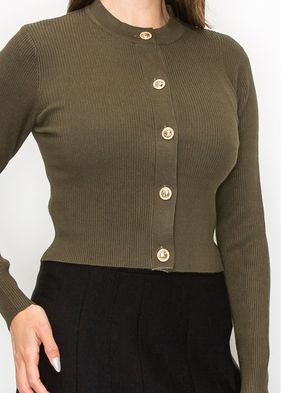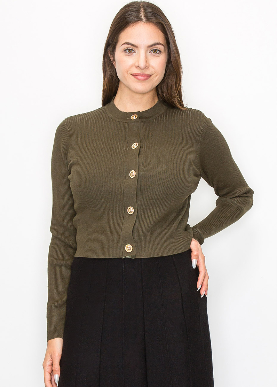 Gold button accents and a beautifully textured ribbed knit set this olive cardigan apart. The fitted shape flatters without compromising modesty, and the long sleeves offer just the right amount of warmth. Whether you’re dressing up or keeping it casual, this piece adds a refined touch to your outfit.