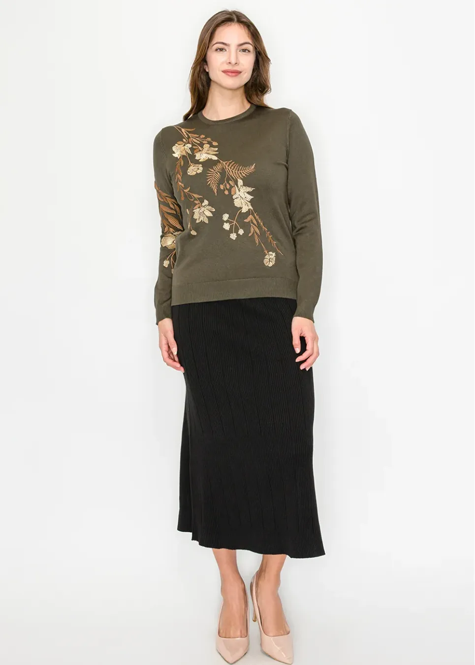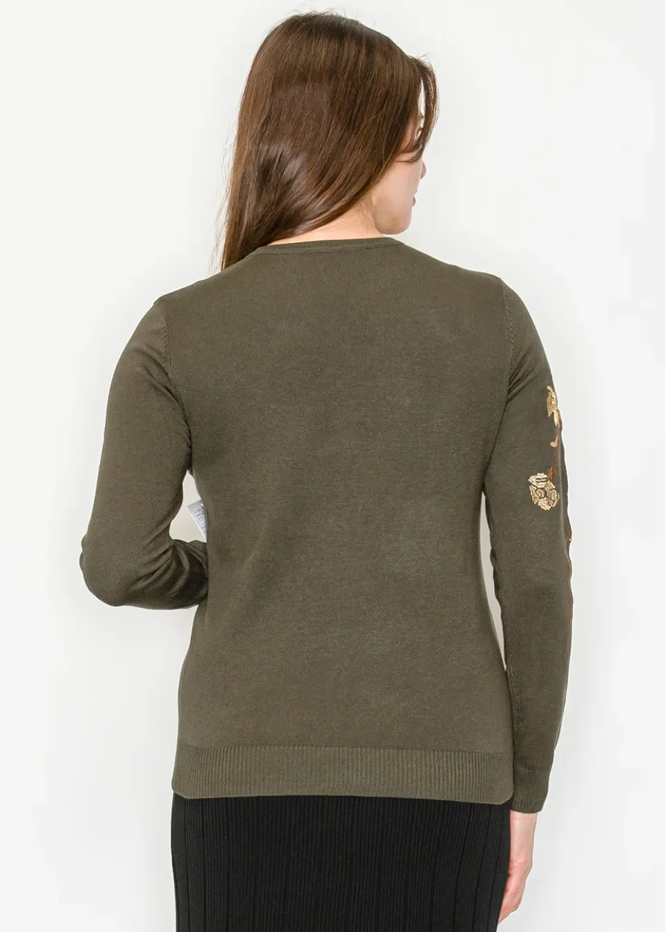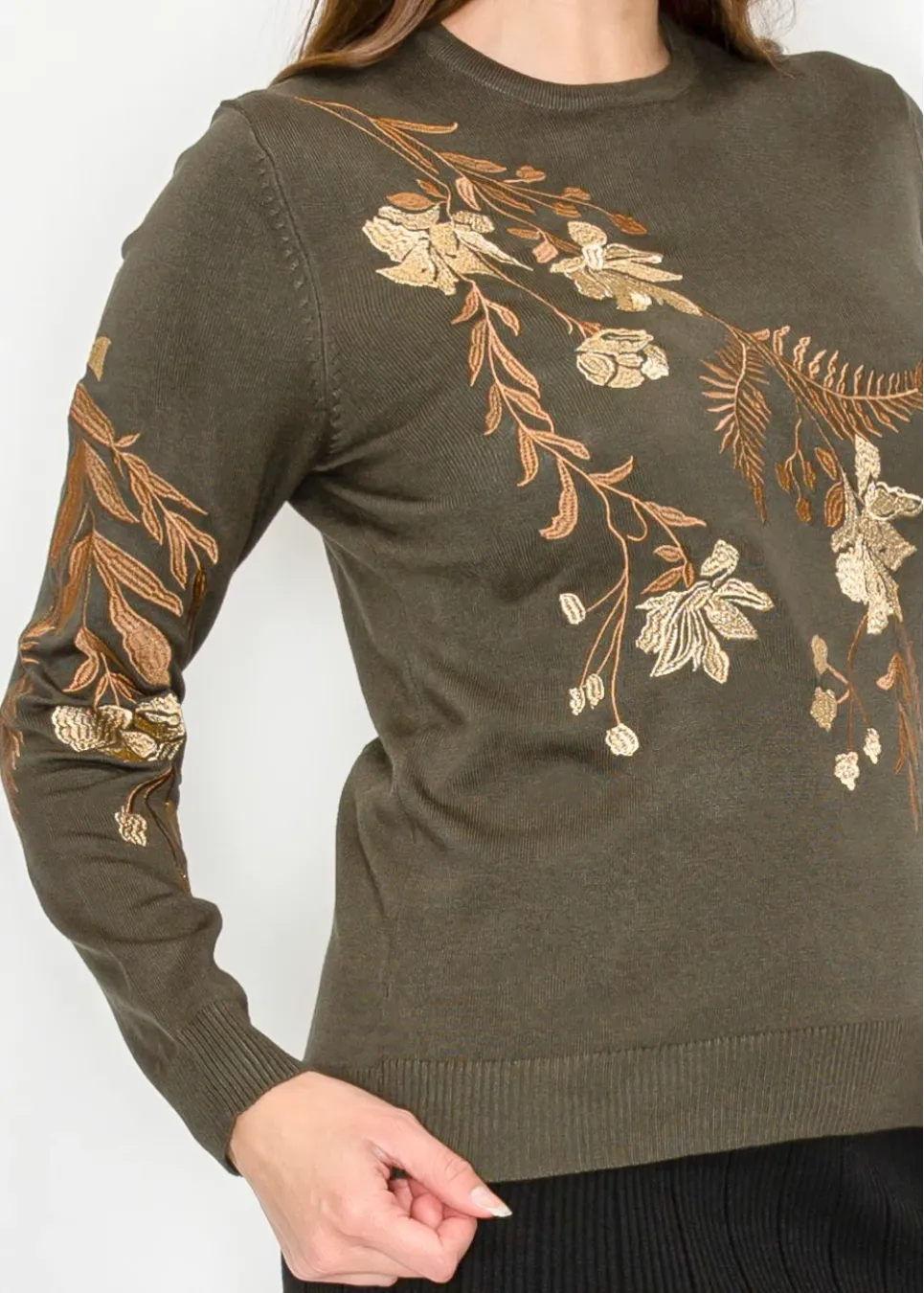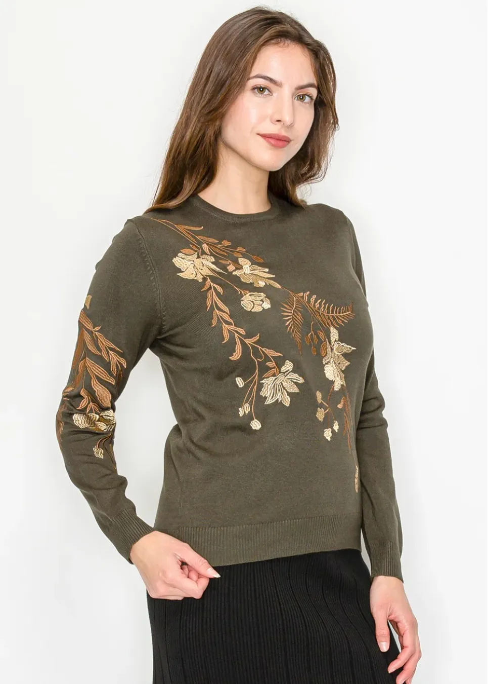 This olive green sweater is elevated with intricate floral embroidery in warm golden tones. The soft knit and classic crew neckline make it a versatile piece for both casual and dressier looks.