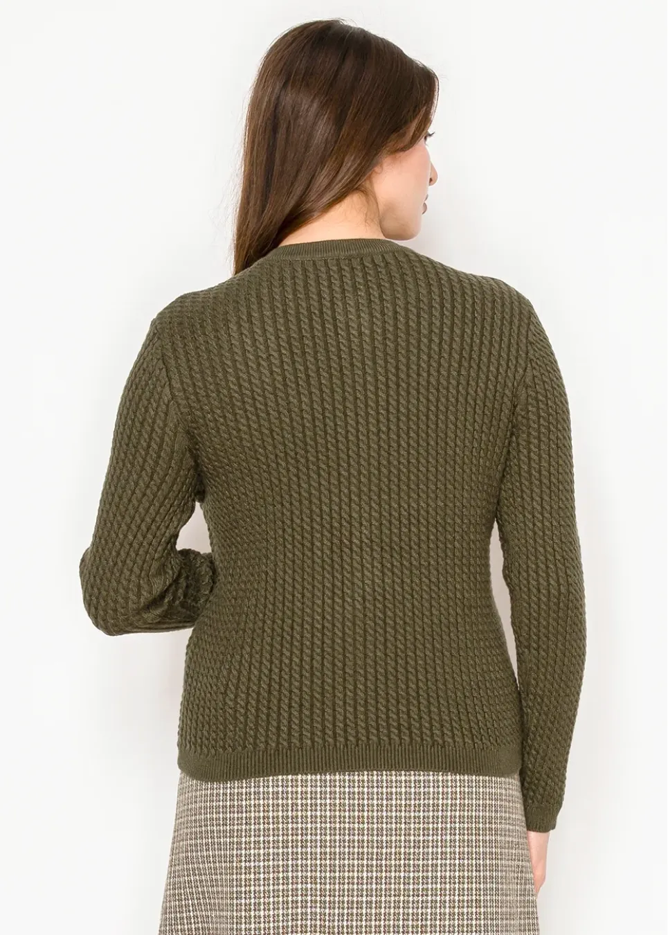 Cozy with a twist. This olive knit features rich texture, a clean neckline, and a scalloped hem that adds a touch of charm to the classic shape.