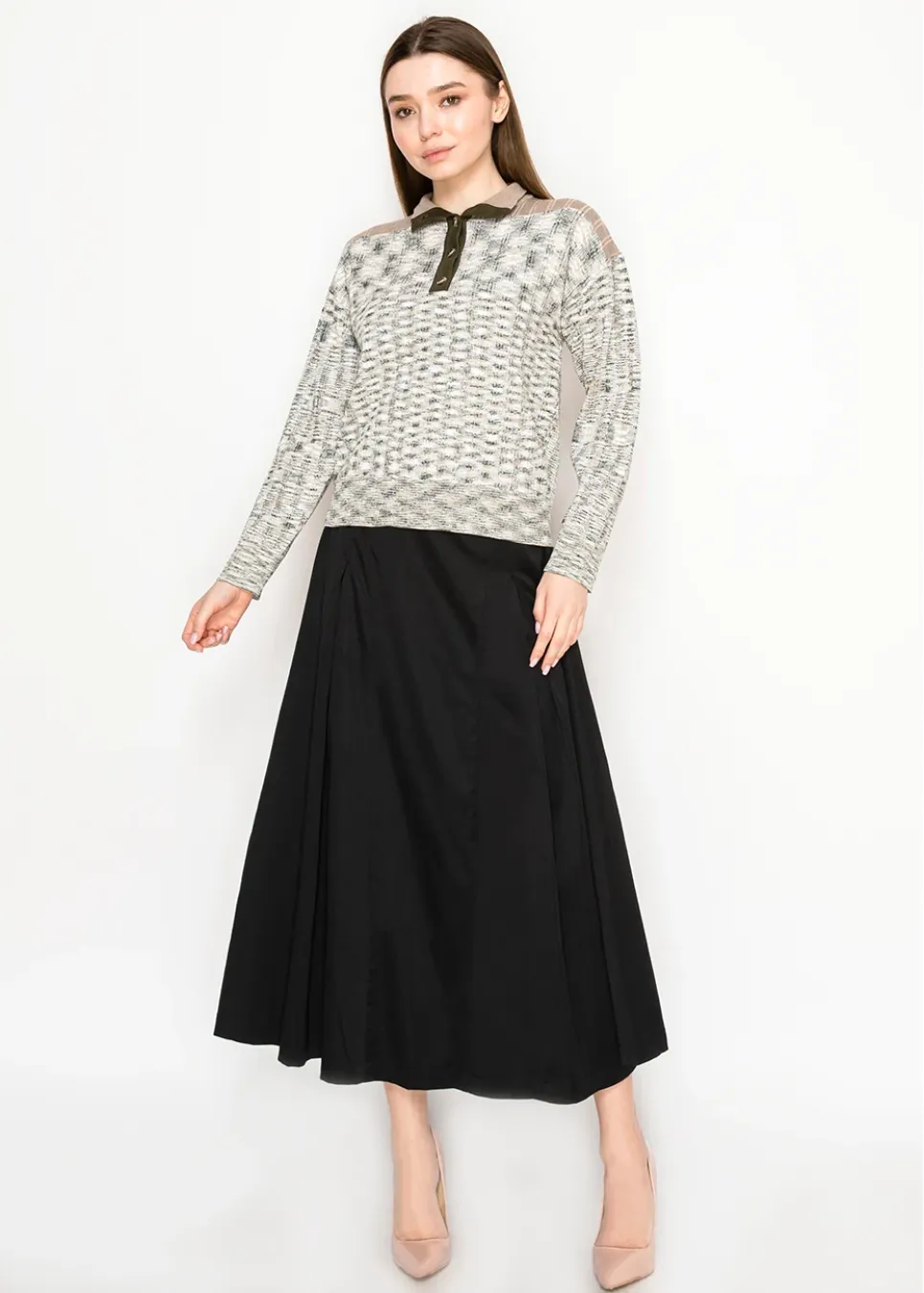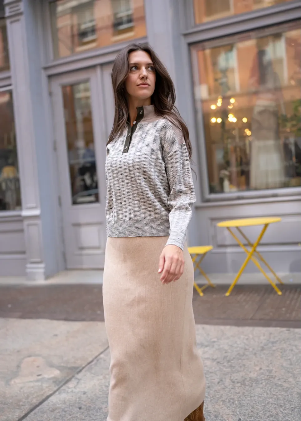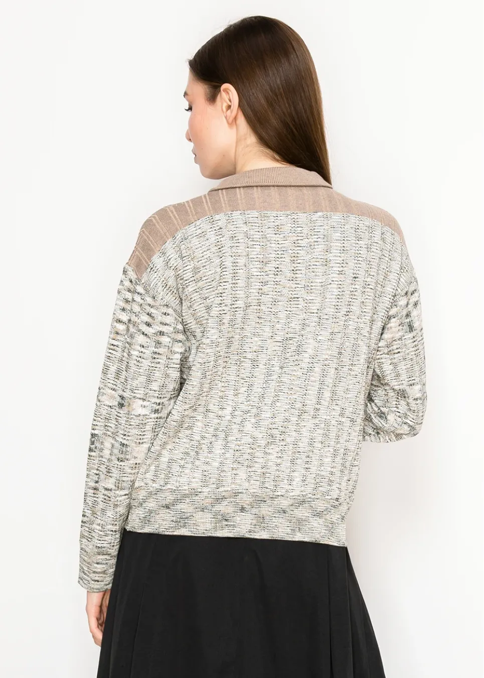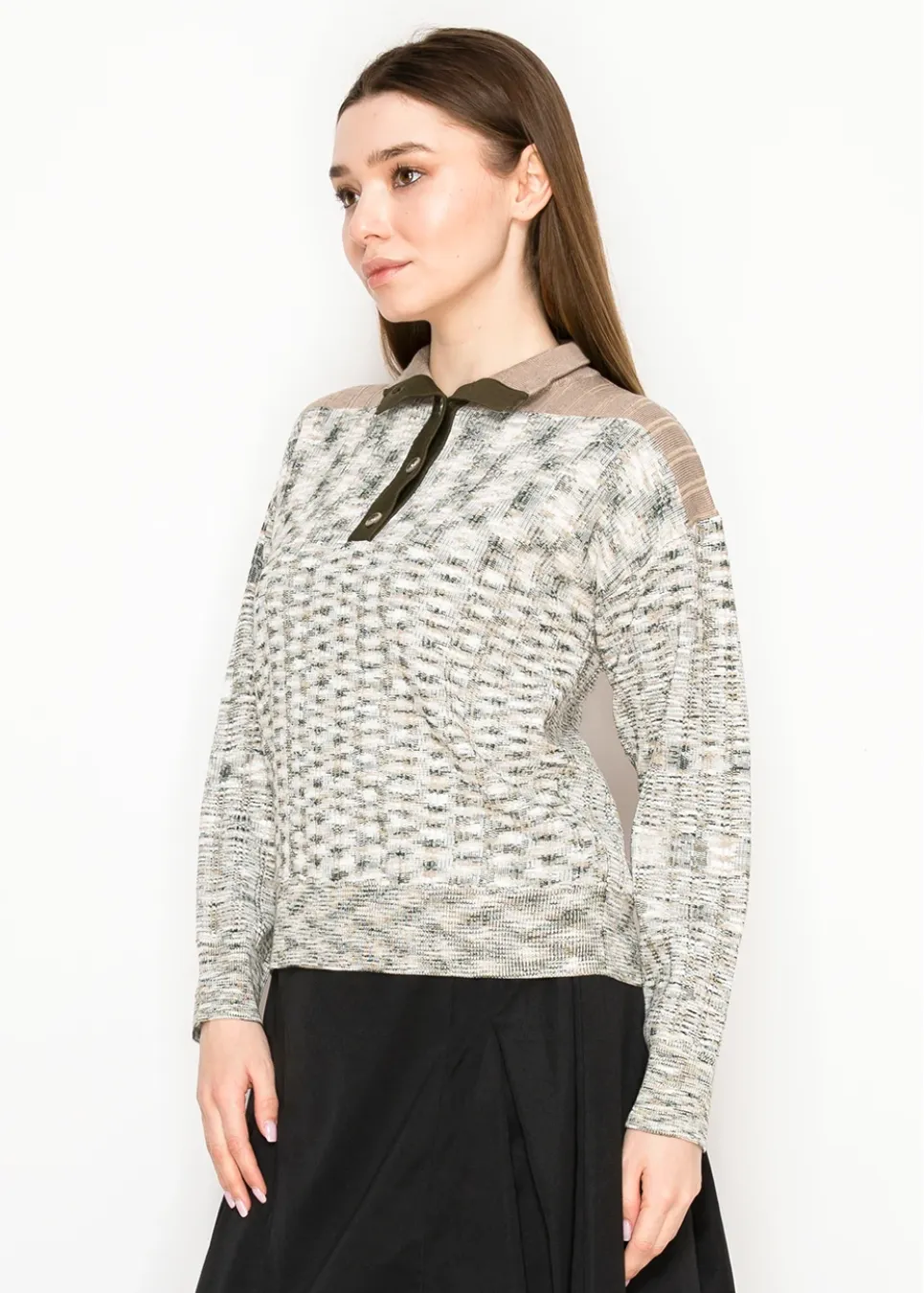 The knit polo that feels like comfort with a twist. Its mix of earthy tones and easy shape makes it the kind of piece you’ll live in all season.