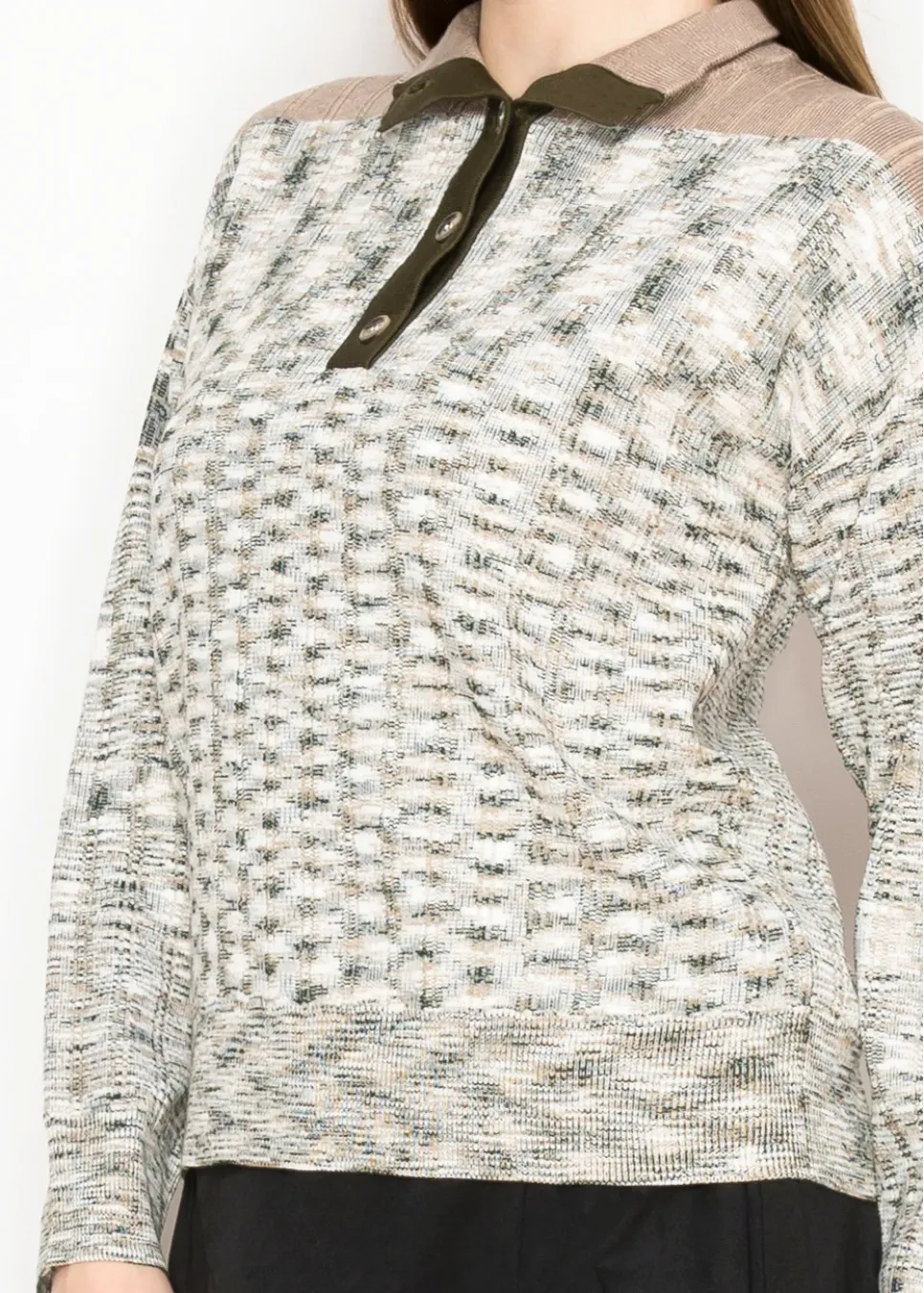 Olive Cable Knit Polo Sweater with Contrast Collar