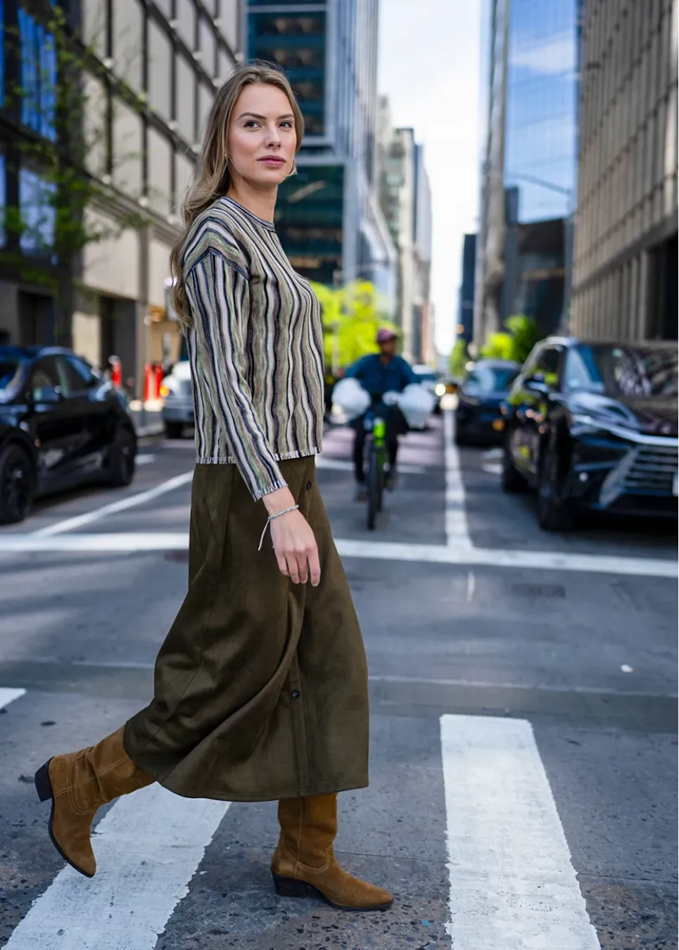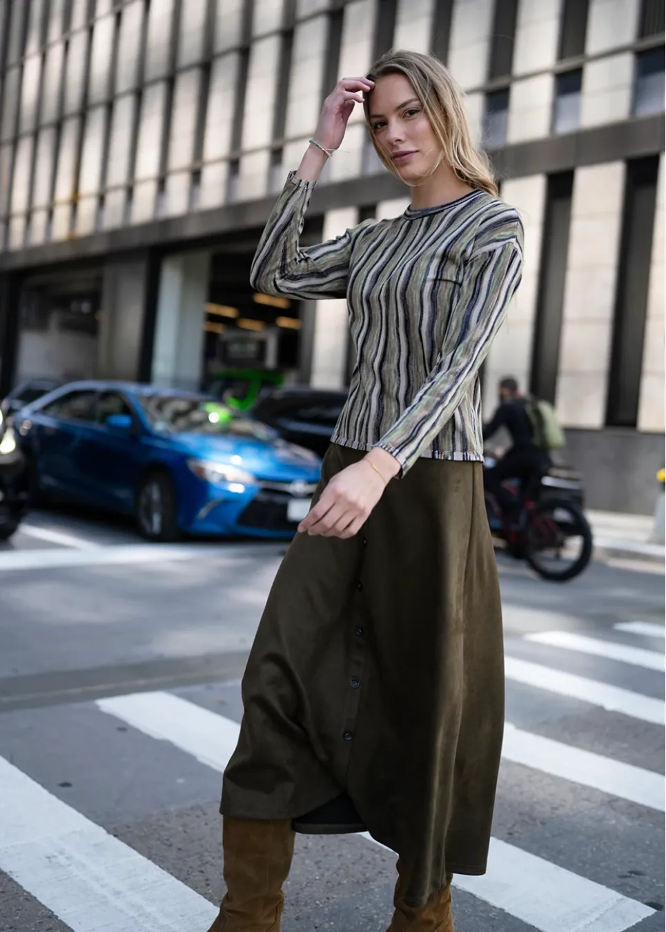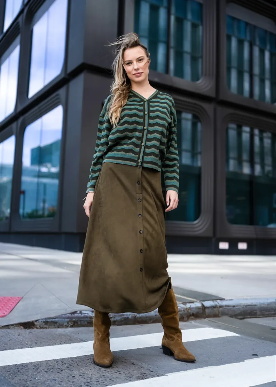 A soft olive midi skirt with a classic A-line cut and button-down front. Its rich texture and flowy drape make it easy to style for both casual and dressy looks.