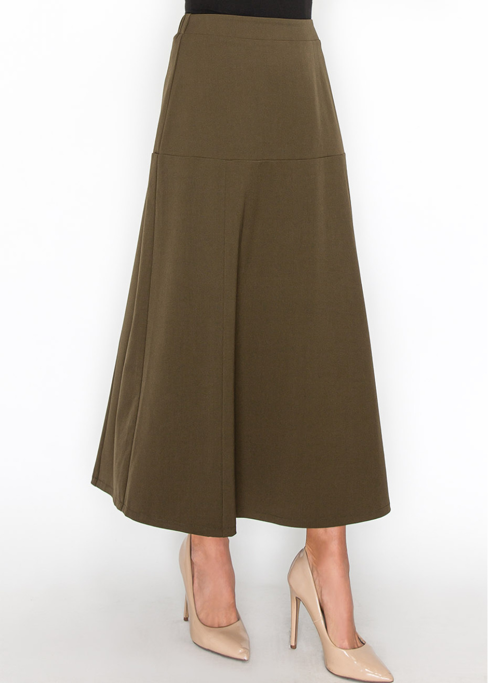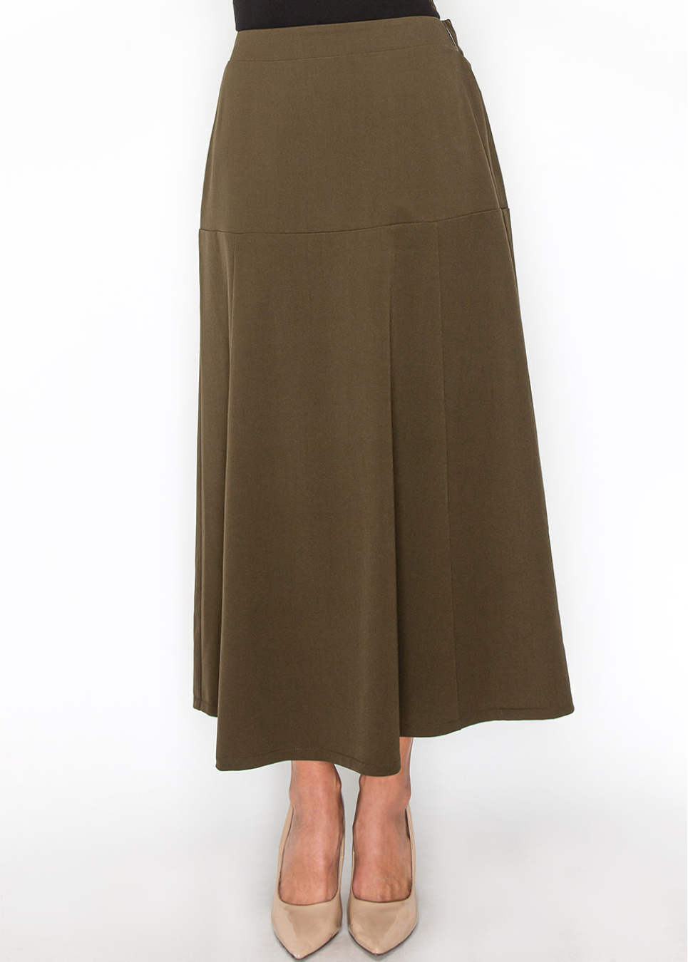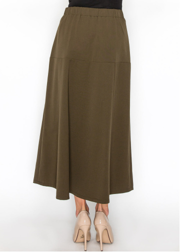 Featuring a chic panel design, this olive midi skirt adds a modern twist to a traditional style. The rich olive color is perfect for creating understated yet stylish looks. Pair it with a simple top for a refined, modest outfit.