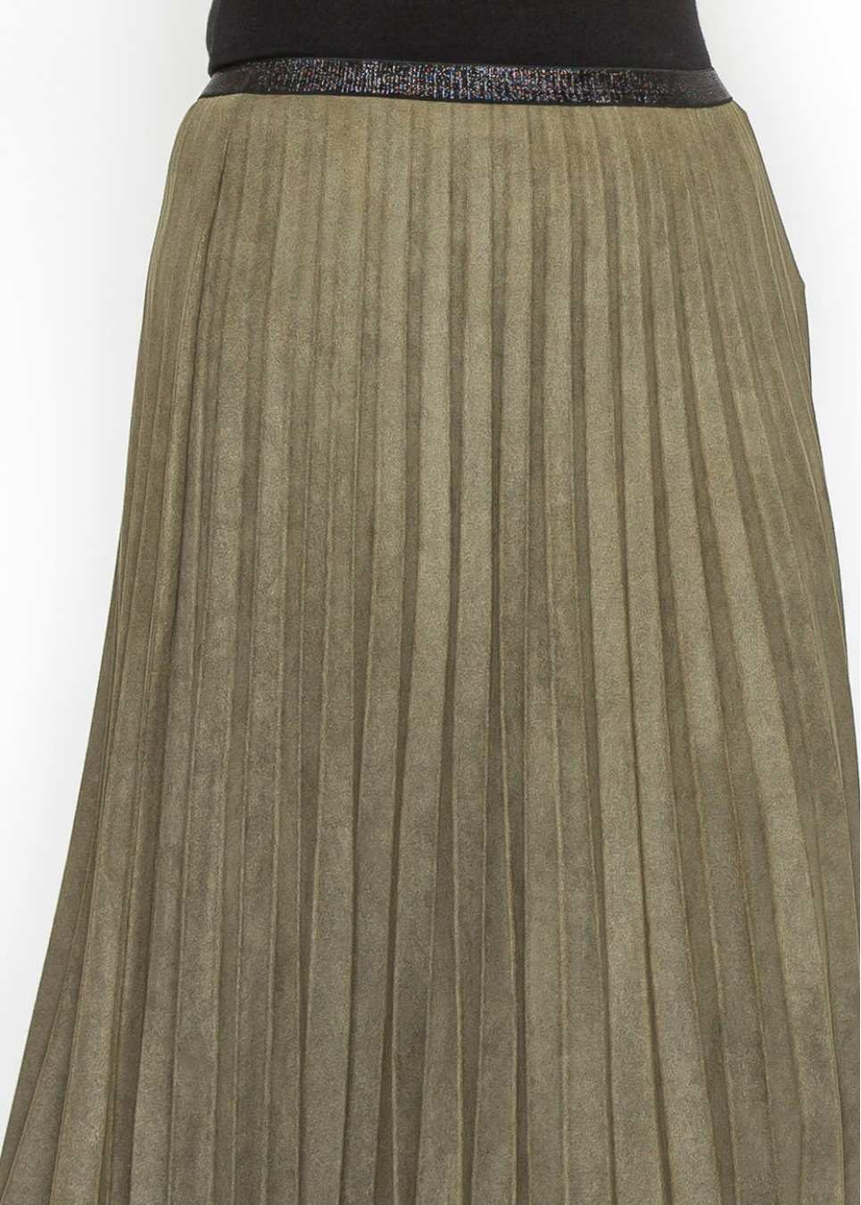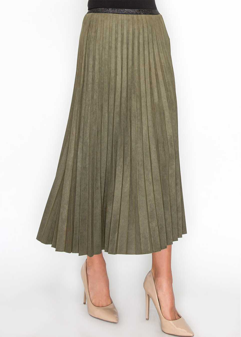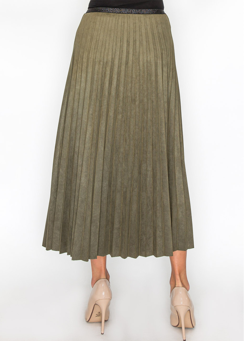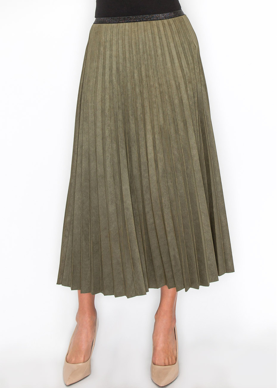 - This pleated skirt is so flattering. We designed this skirt in a way that it would lay flat on the stomach then starts pleating after.