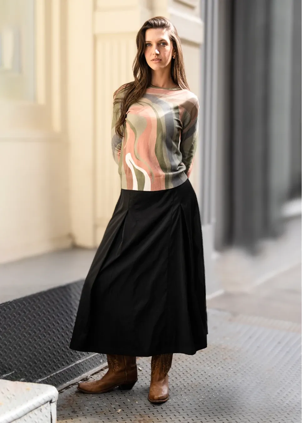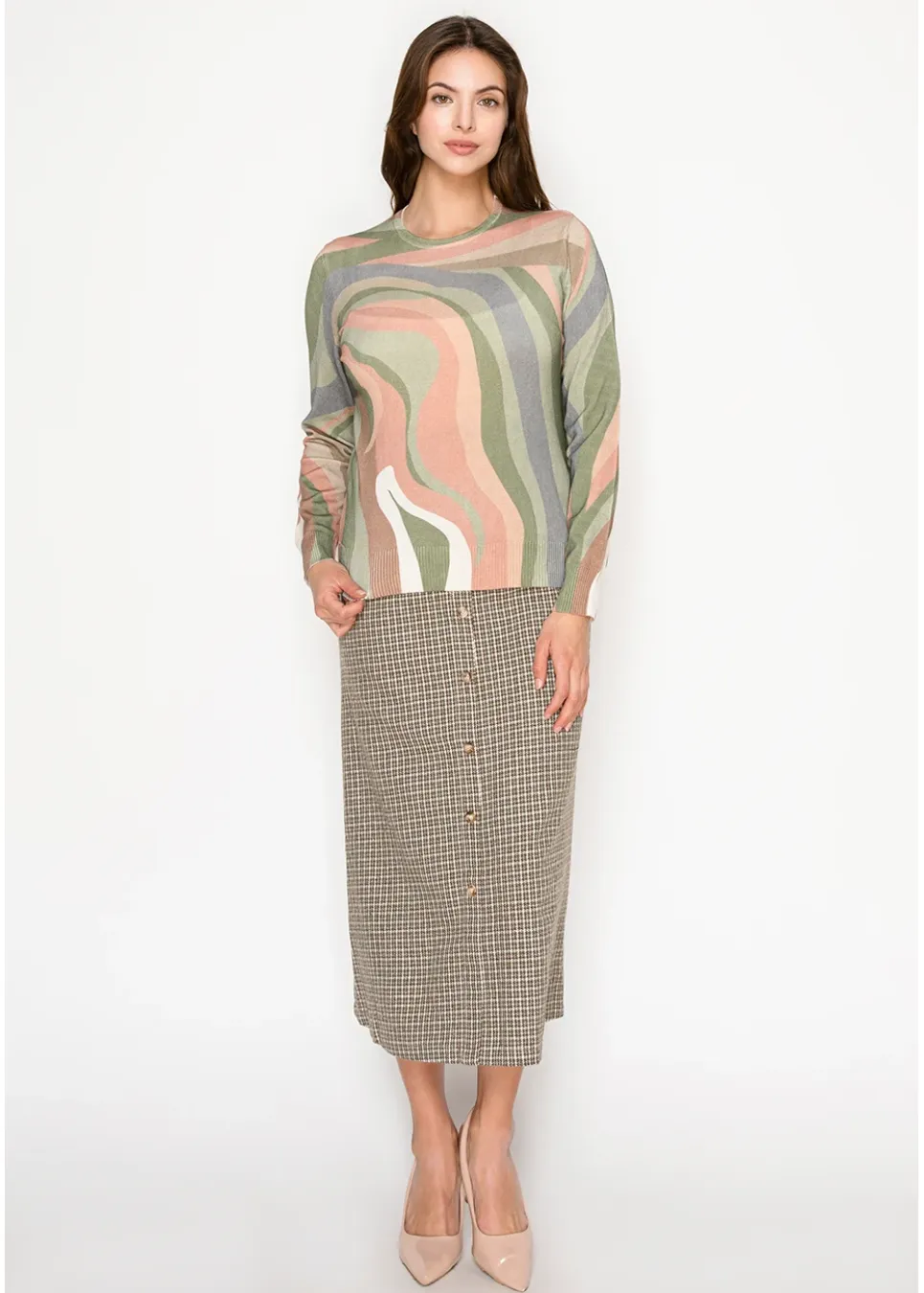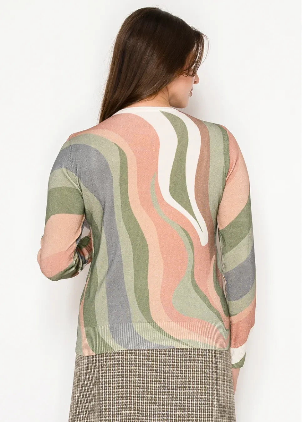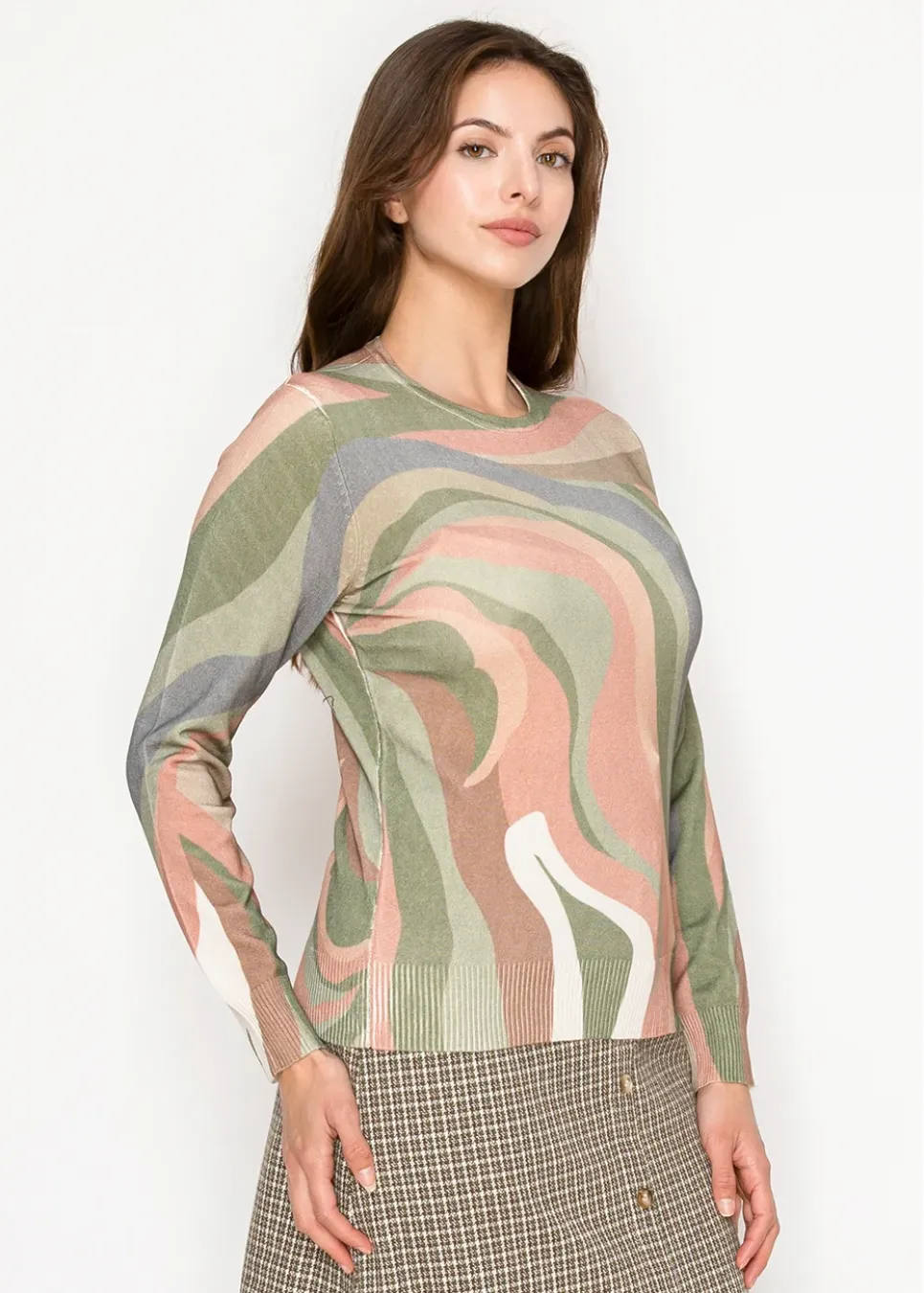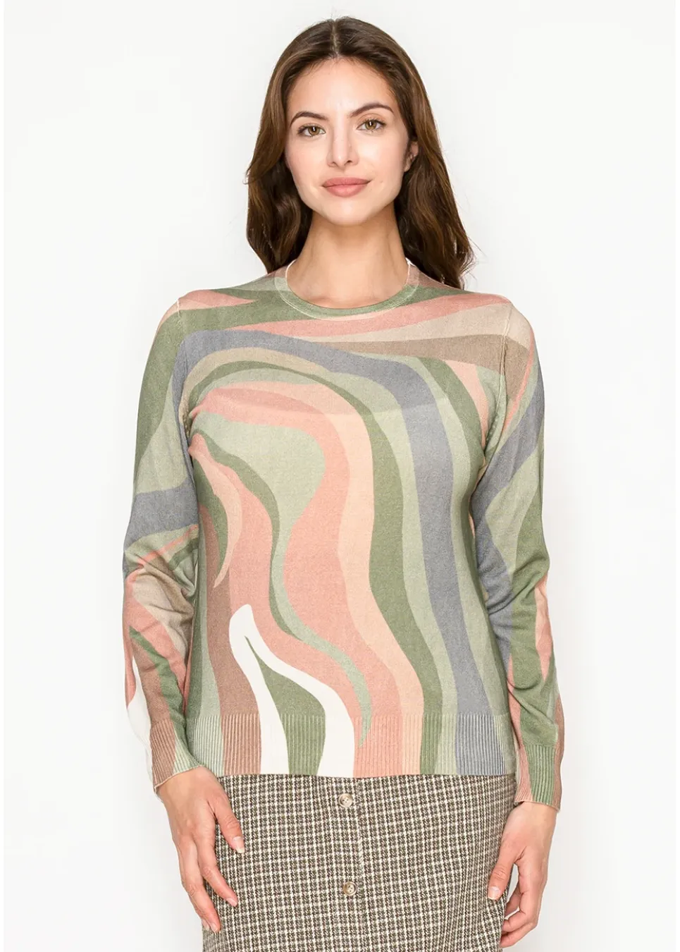 Soft and easy with a touch of art. This lightweight knit features wavy patterns in olive, blush, and cream — an easy way to add something fresh to your fall look.