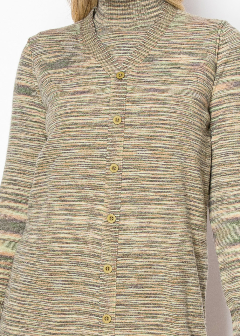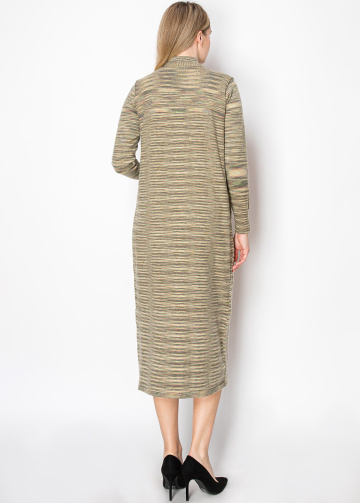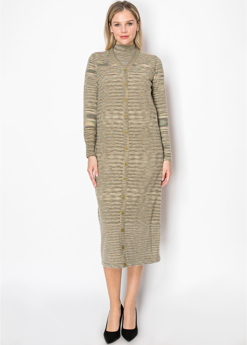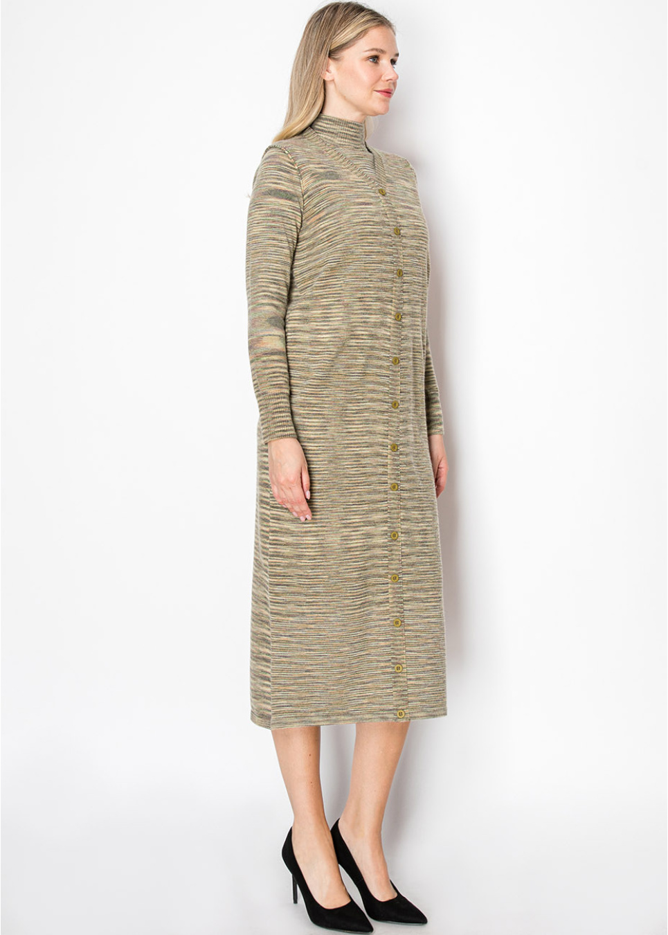 Designed for comfort and style, this multitone olive knit dress is a versatile piece for your wardrobe. The long sleeves and mock neck provide modest coverage, while the button-down design adds a touch of structure. The subtle stripes and muted colors make it easy to pair with accessories for any occasion. For a coordinated look, a matching sweater with the same pattern is also available.