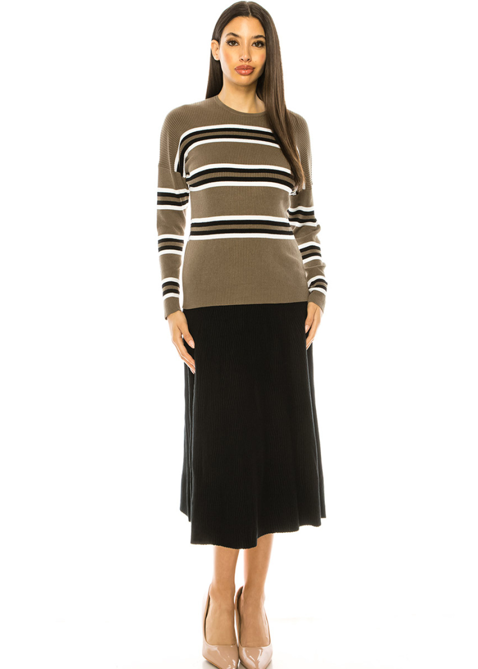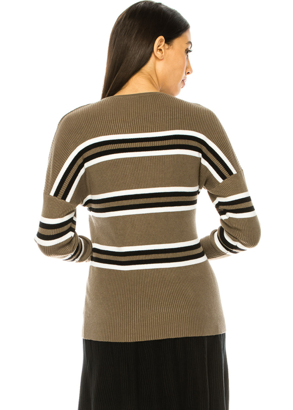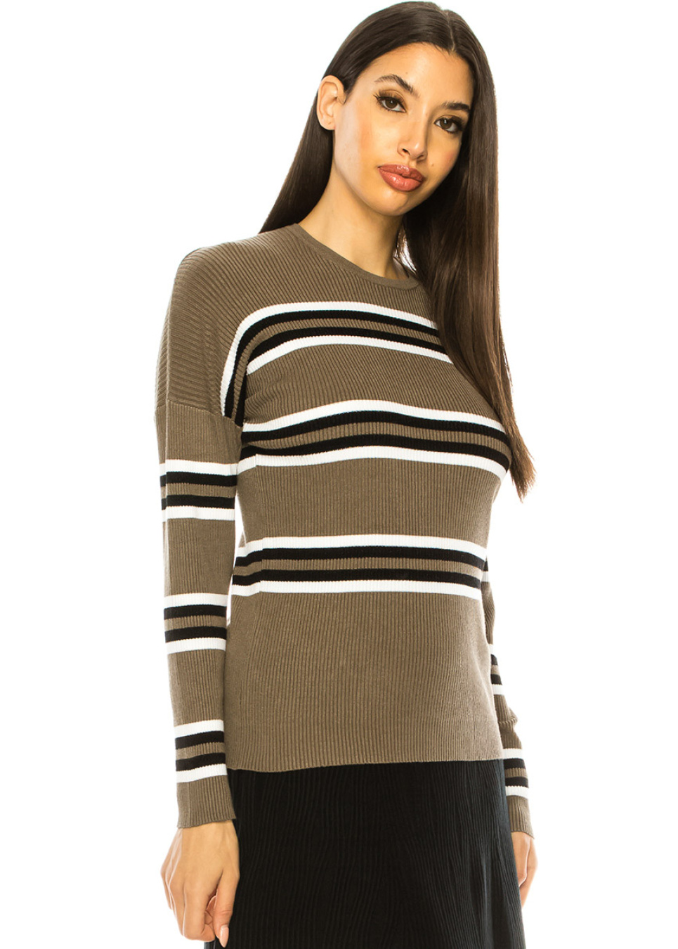 Add some color to your wardrobe with this stylish olive striped sweater. The relaxed and roomy fit, combined with the traditional crew neck, creates a comfortable and casual look. With its black and white stripes and ribbed collar, hem, and cuffs, this sweater is perfect for adding some pattern to your outfit while also keeping you warm on chilly days. Make a statement and elevate your style with this chic and cozy olive sweater.