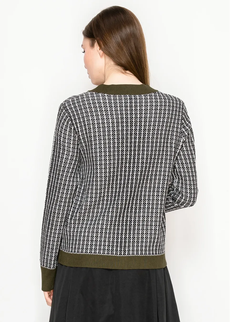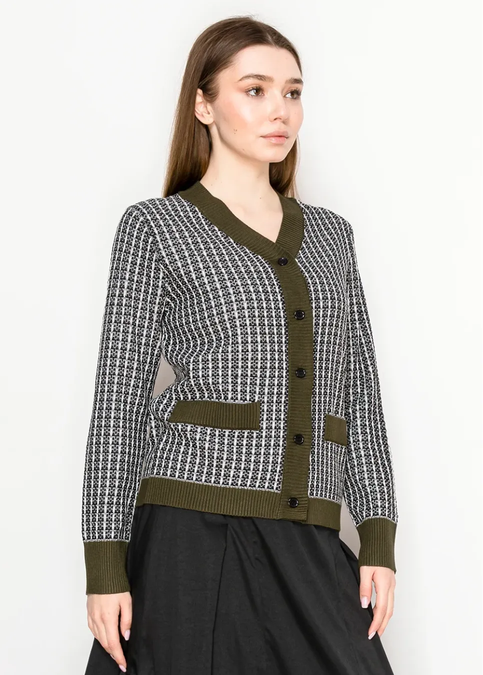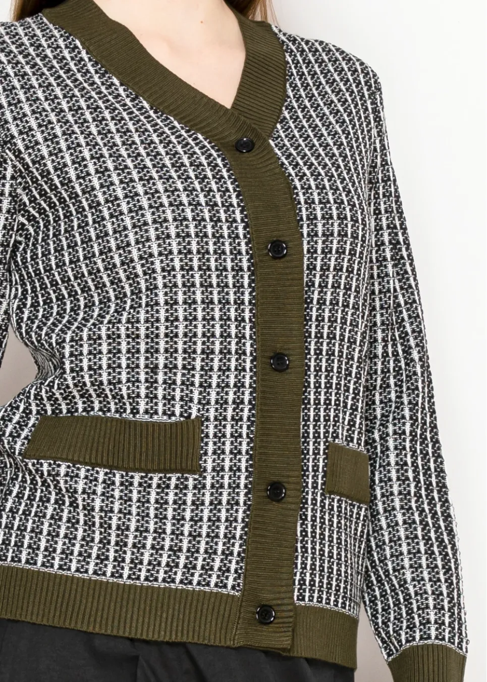 A cozy knit with a graphic twist. This black-and-white cardigan features olive trim and pockets for a bold yet wearable look.