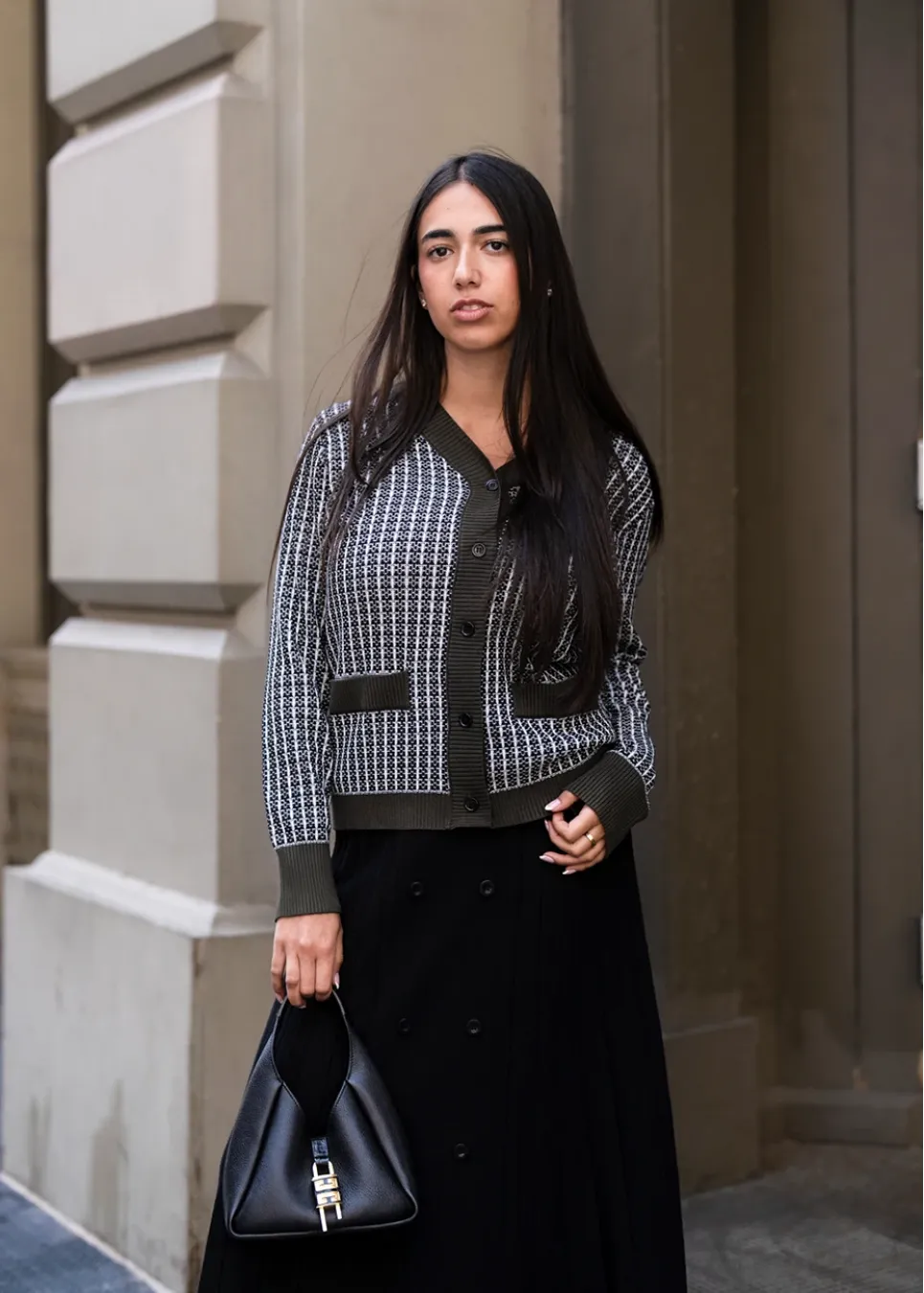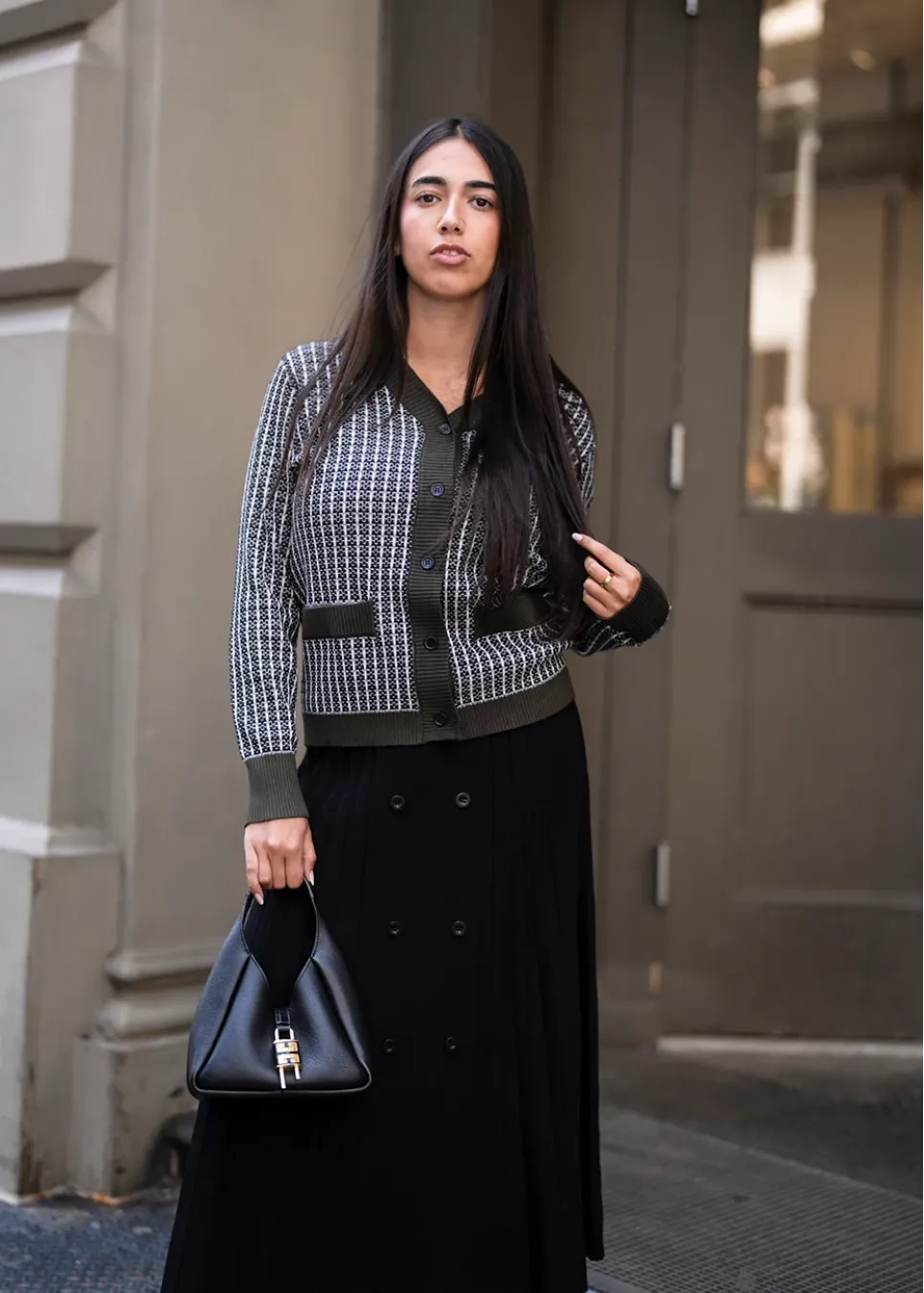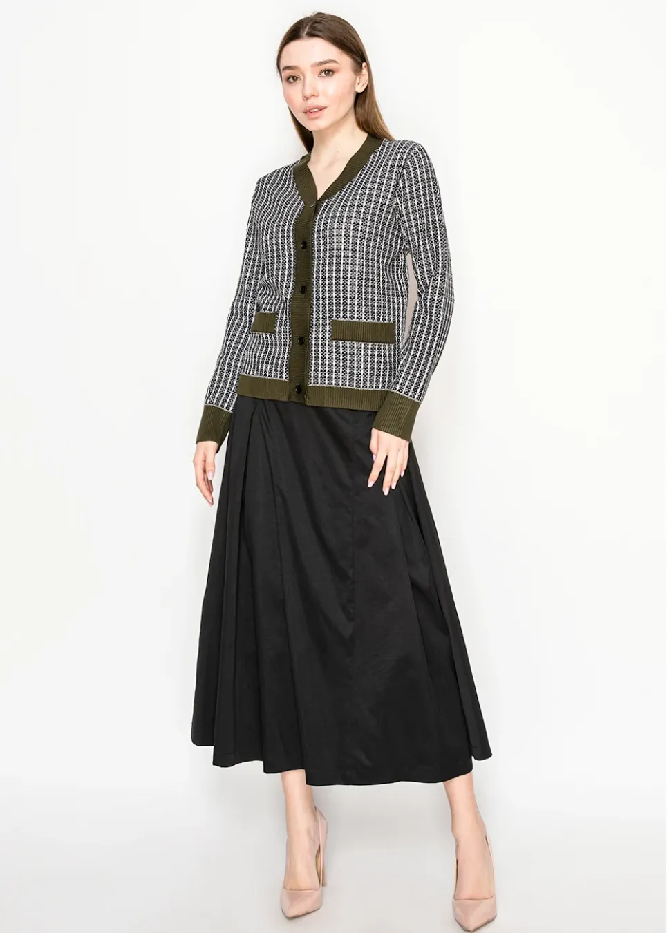 A cozy knit with a graphic twist. This black-and-white cardigan features olive trim and pockets for a bold yet wearable look.