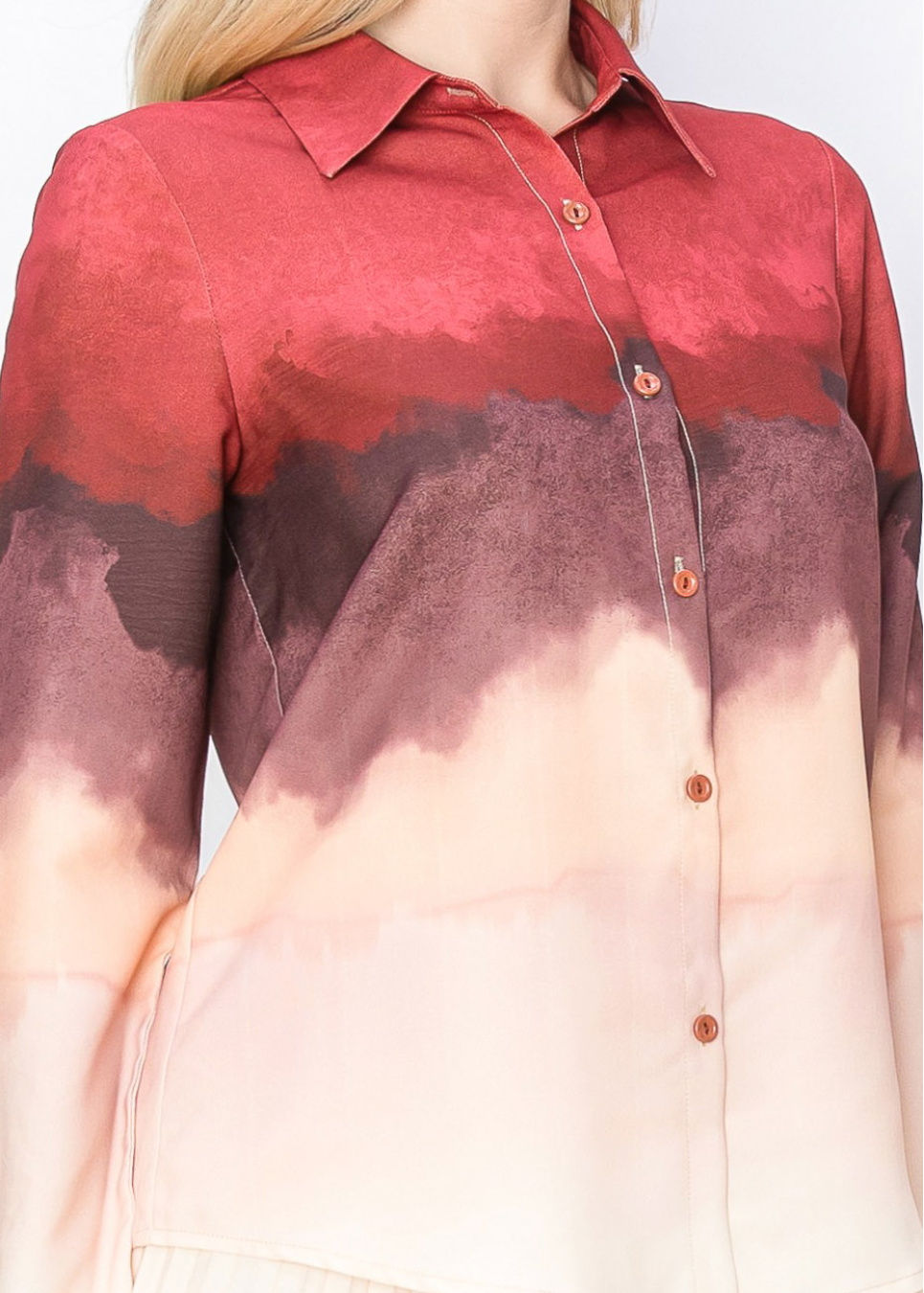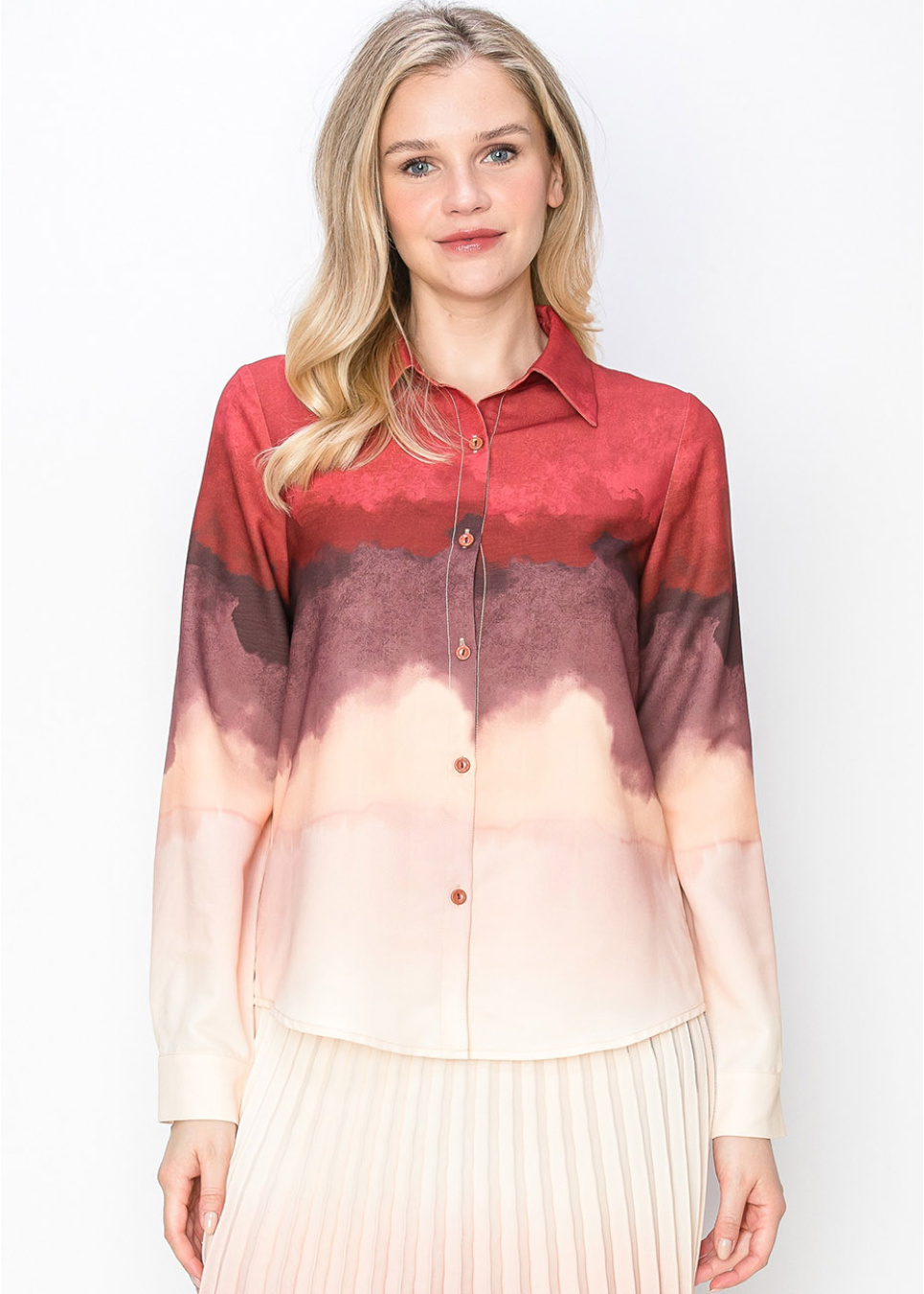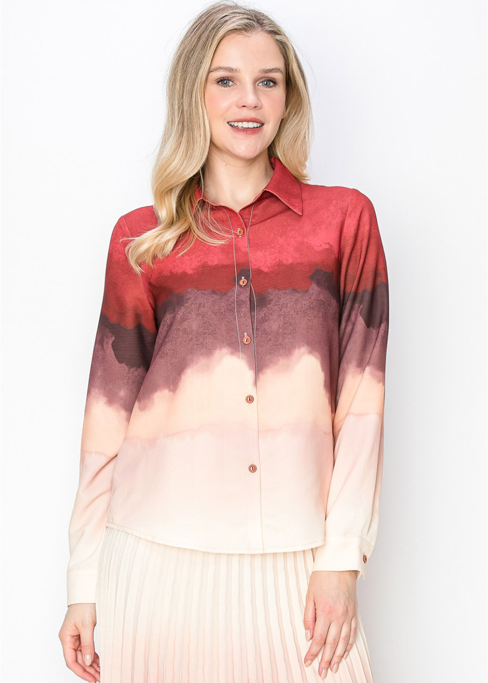 Get ready to turn heads with the Ombre Elegance Shirt. The smooth gradient from rich burgundy to soft cream makes this button-down a standout piece. It’s perfect for adding a pop of color to your look, and the easy-to-wear style means you can dress it up or down without a second thought.