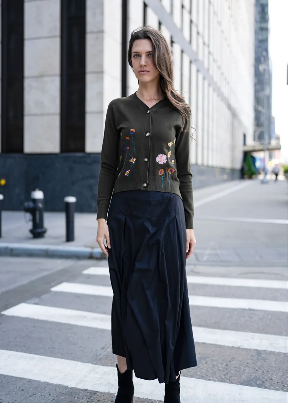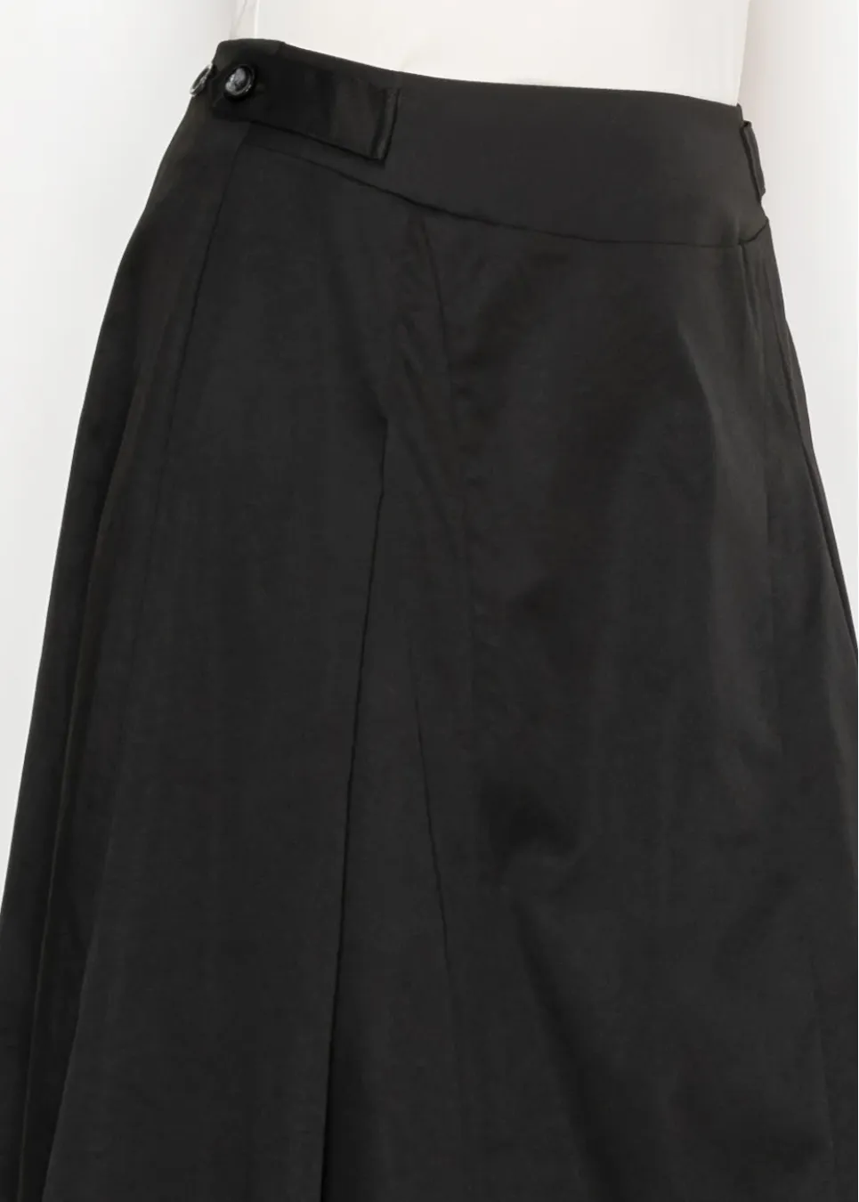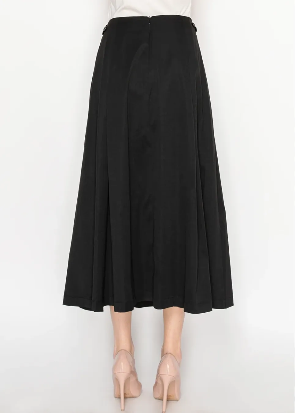 Released side pleats add easy movement to this clean A-line. A neat waist with button tabs and a back zip keeps the finish polished.